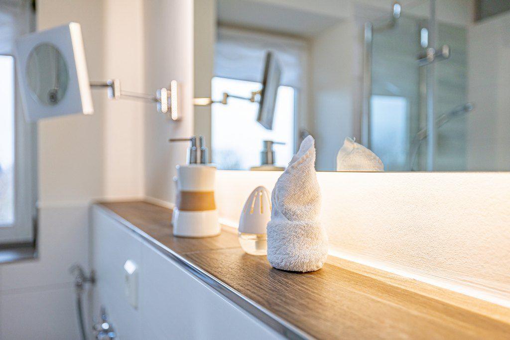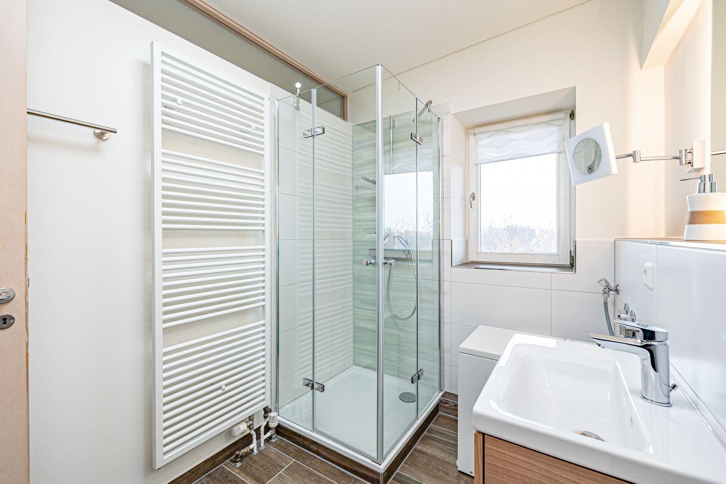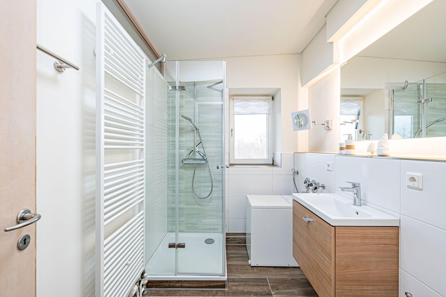 Das Badezimmer verfügt über eine Dusche, WC, Kosmetikspiegel (beleuchtet), Fußbodenheizung und Waschmaschine.