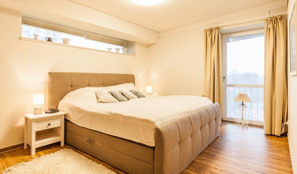 Im Schlafzimmer befindet sich ein Boxspringbett (180x200 cm); Verdunklungsrollos und Verdunklungsvorhänge sind vorhanden.