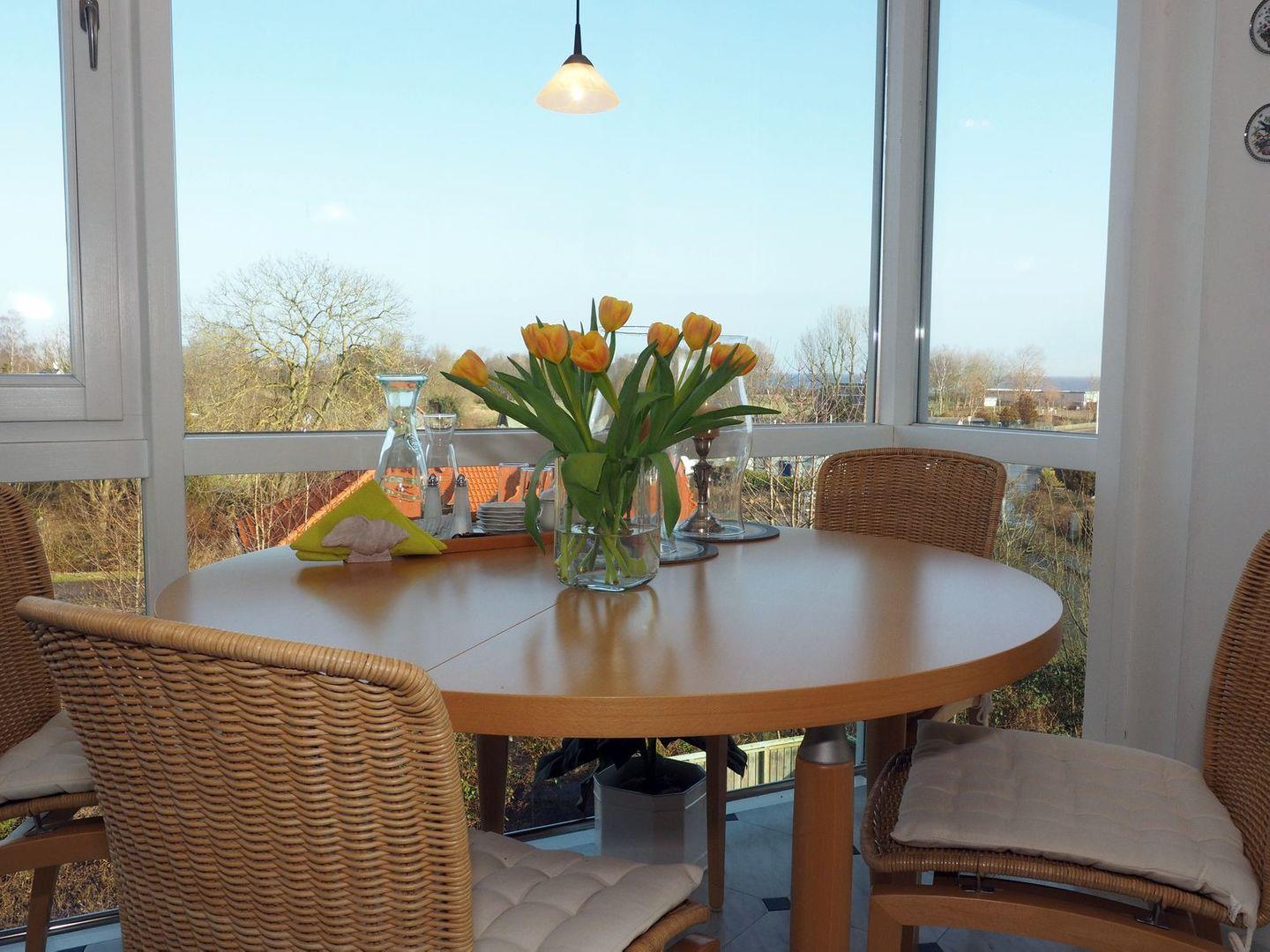 Der Wohnbereich ist versehen mit einer neuen Couch mit hochwertiger Polsterung, einem Essbereich mit Ostseeblick sowie HD-TV und BlueRay-DVD Spieler.