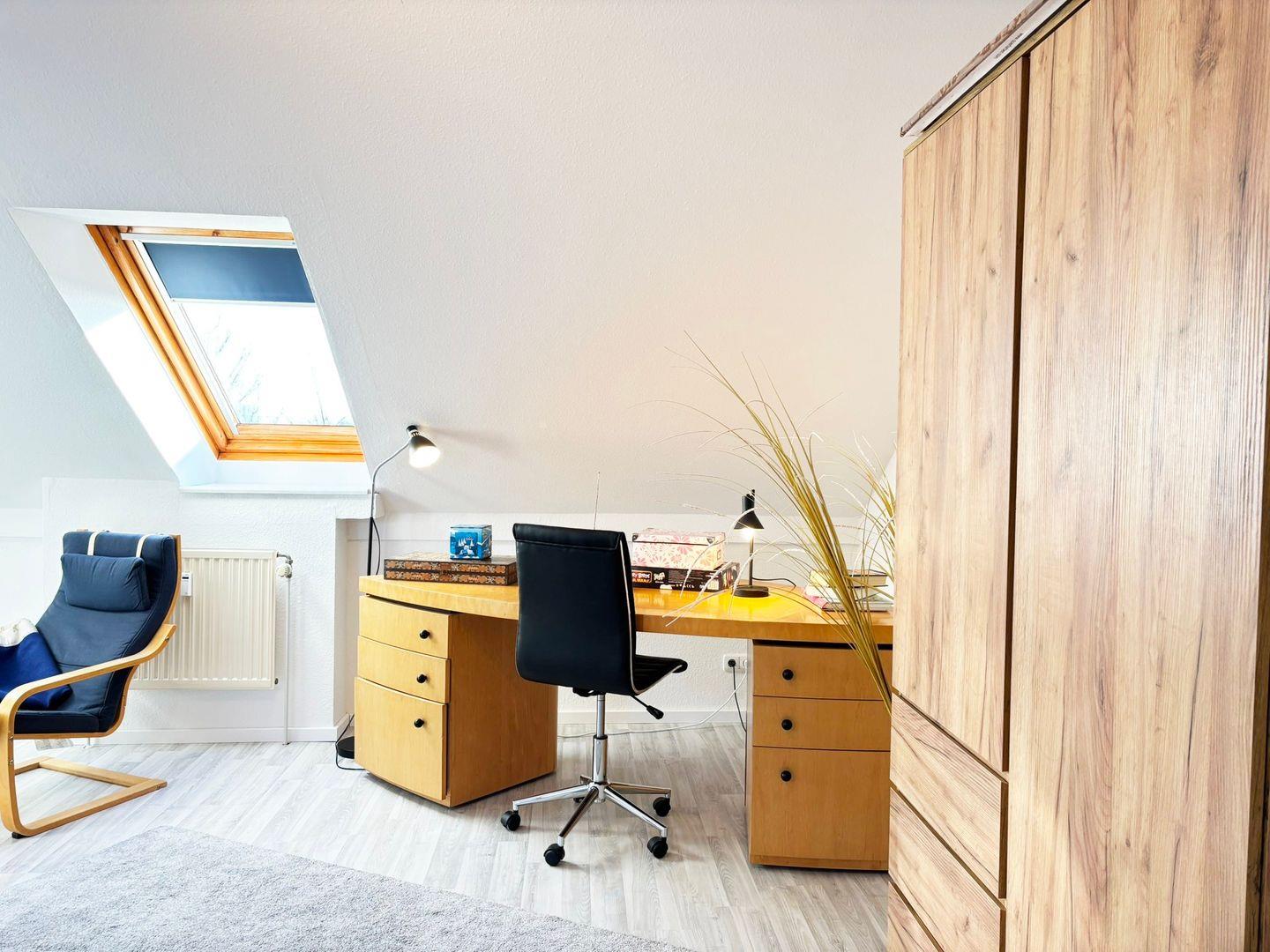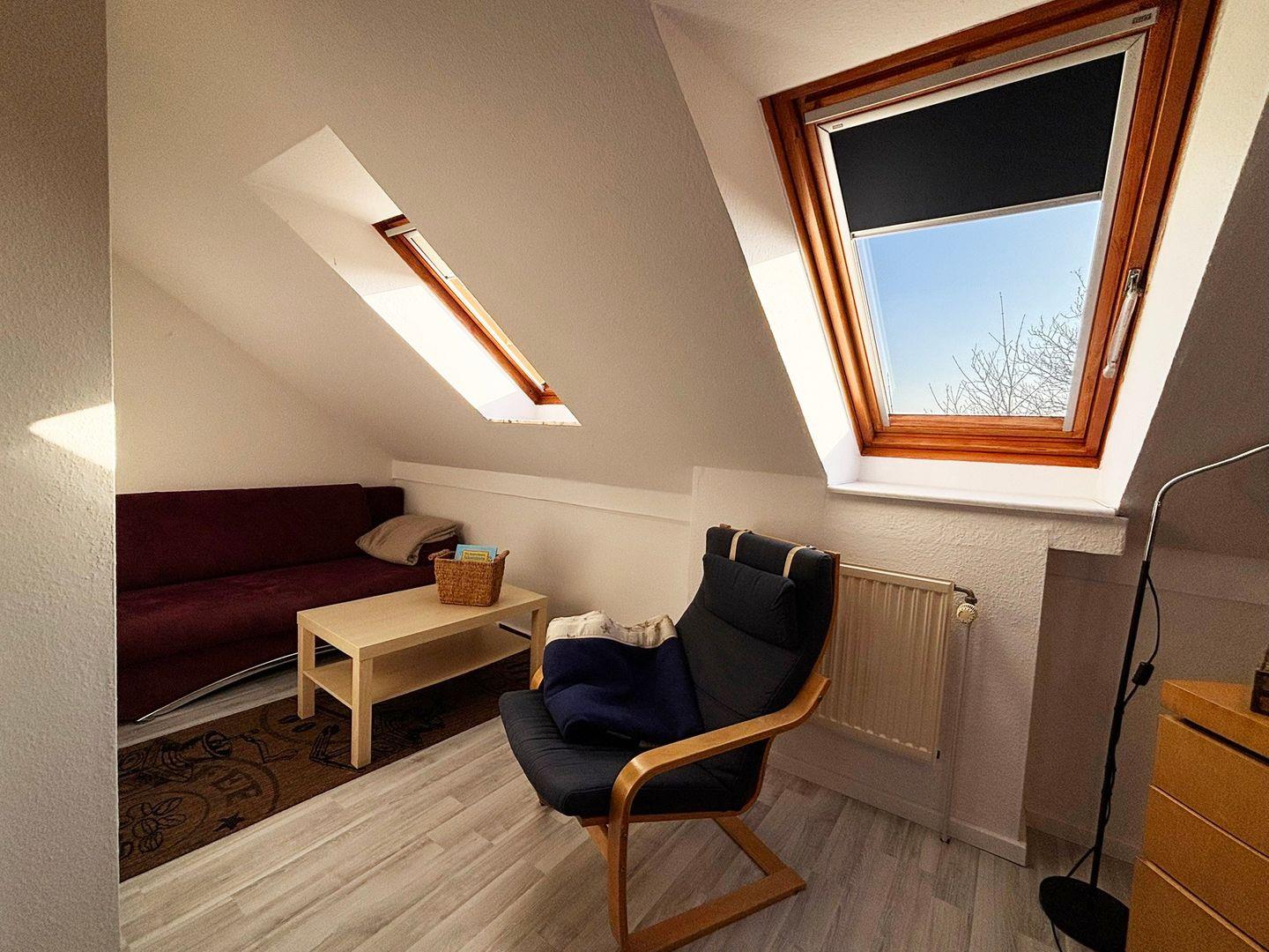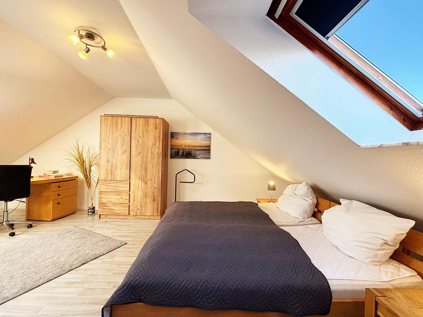 Im großzügigen Dachgeschoss verfügen Sie über ein weiteres gemütliches Schlafzimmer mit 2 Einzelbetten, die zu einem Doppelbett zusammengestellt werden können. Eine bequeme Couch-Leseecke (Schlafcouch) rundet die Ausstattung ab. Kostenloses WLAN ( GLASFASER ) , Sat.-TV, DVD-Player, Musikanlage und ein Parkplatz gehören selbstverständlich zu der Strandperle dazu.