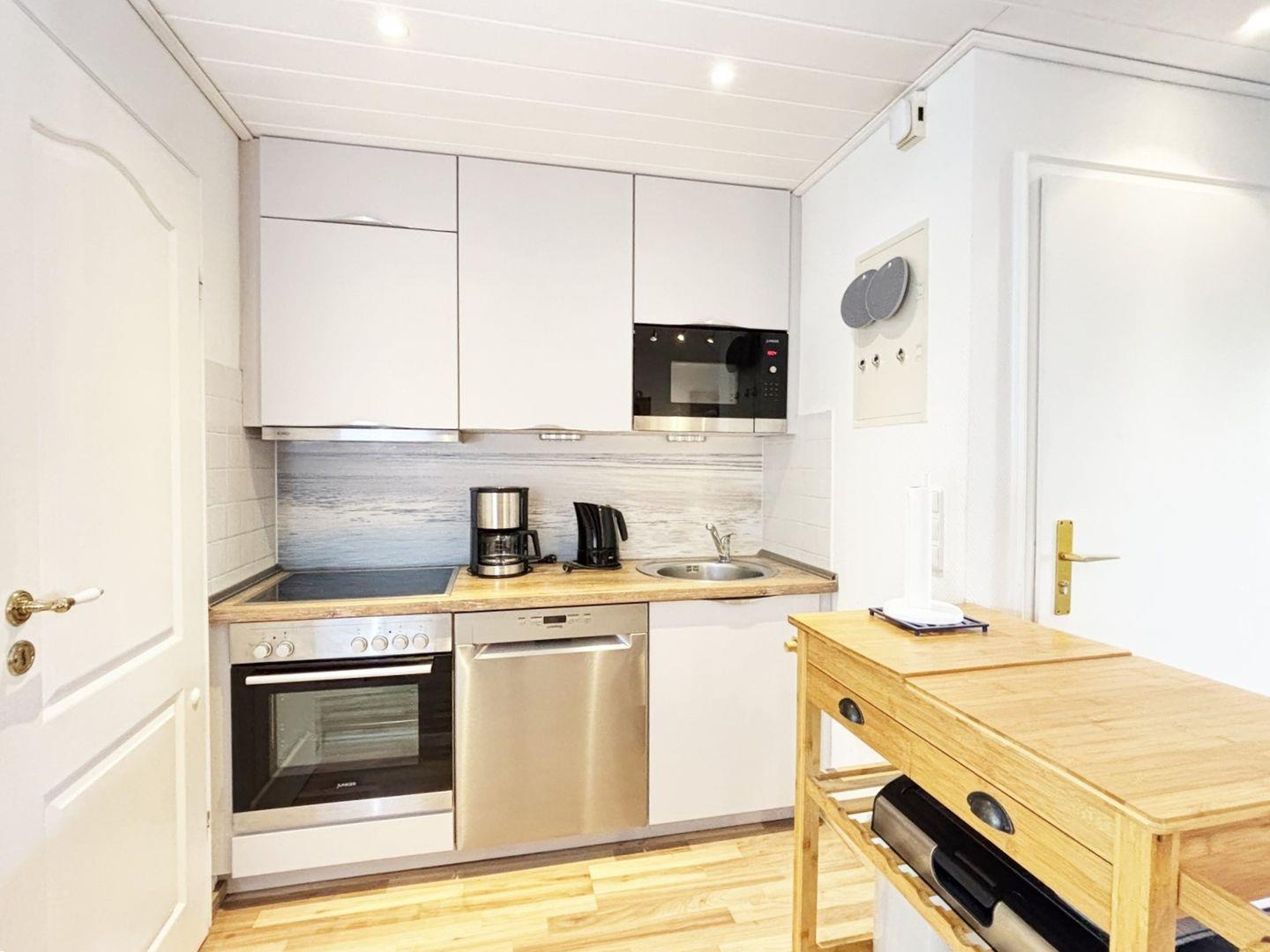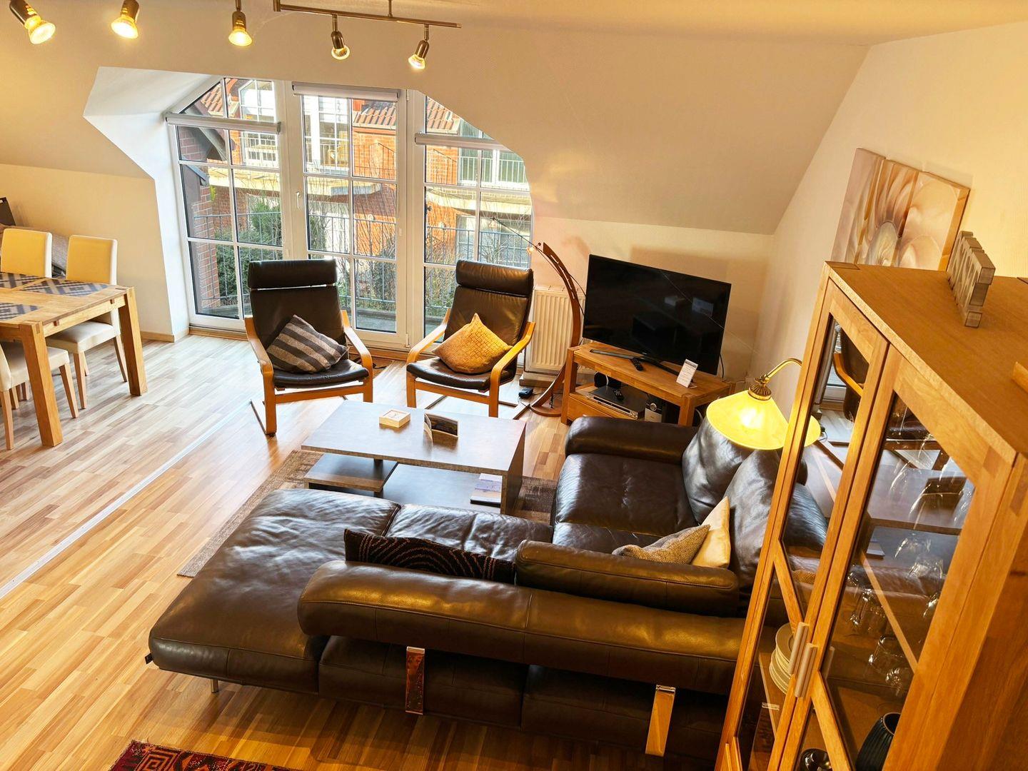 Die Wohnung verfügt über ein großzügiges Wohn-/Esszimmer mit einer neuen kleinen aber feinen Küchenzeile, die zum Kochen einlädt. Die komfortable Ledercouch lädt zum Relaxen ein und falls sich das Wetter mal nicht von seiner besten Seite zeigen sollte, sorgt der 108 cm (43“) LCD- SMART Fernseher für Ihre Unterhaltung. Ein schönes Tageslichtbad Wanne und das gemütliche Schlafzimmer, in dem ein bequemen Boxspringbett (160x200cm) für erholsame Nachtruhe sorgt, runden das wohnliche Ambiente auf dieser Etage ab.