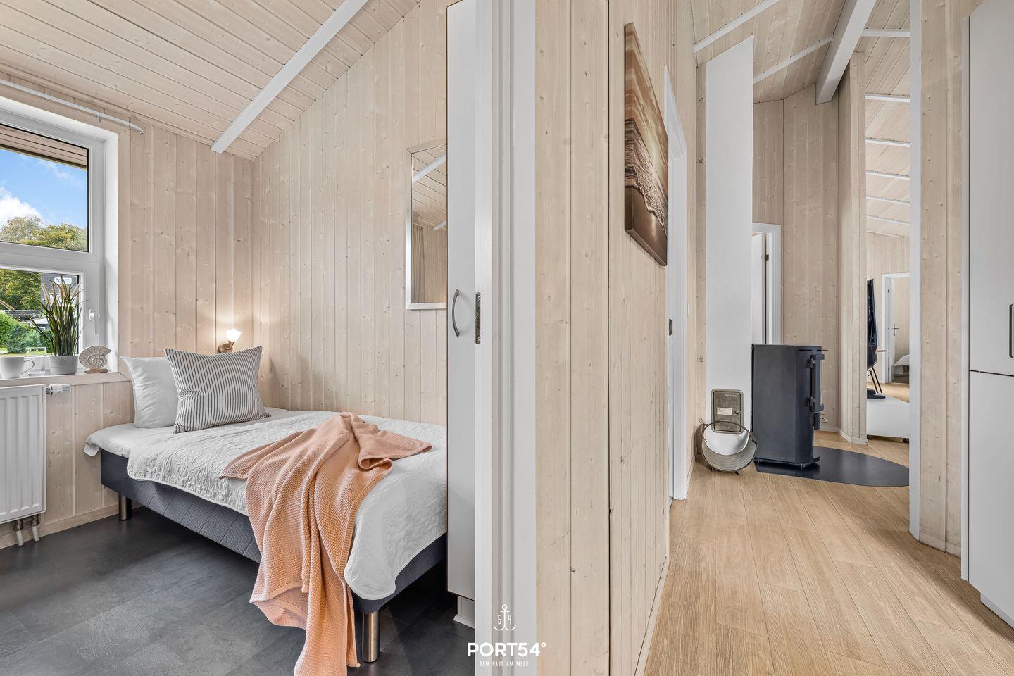 Auch im Inneren überzeugt das Haus mit durchdachter Raumaufteilung und gemütlicher Einrichtung. Insgesamt fünf Schlafzimmer – drei mit komfortablen Doppelbetten und zwei mit jeweils zwei Einzelbetten – sowie ein zusätzlicher Alkoven mit zwei weiteren Schlafplätzen bieten ausreichend Rückzugsorte für alle Gäste. Zwei moderne Badezimmer mit Dusche und WC sorgen für Komfort auf allen Ebenen.