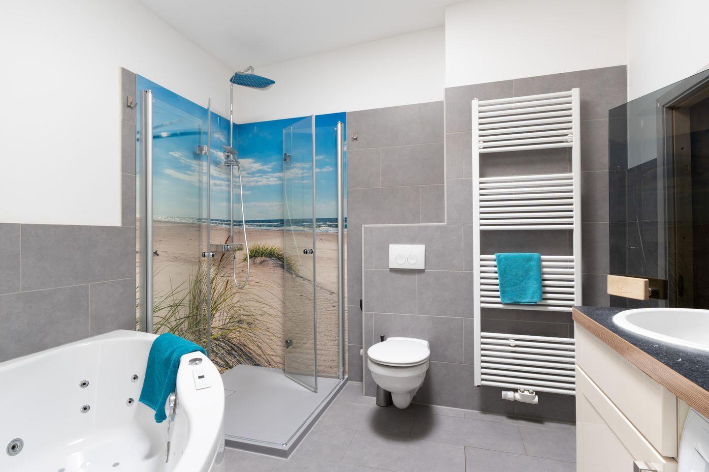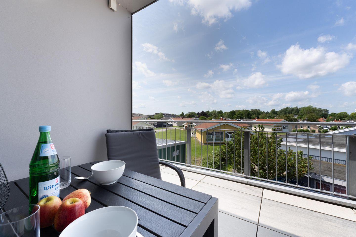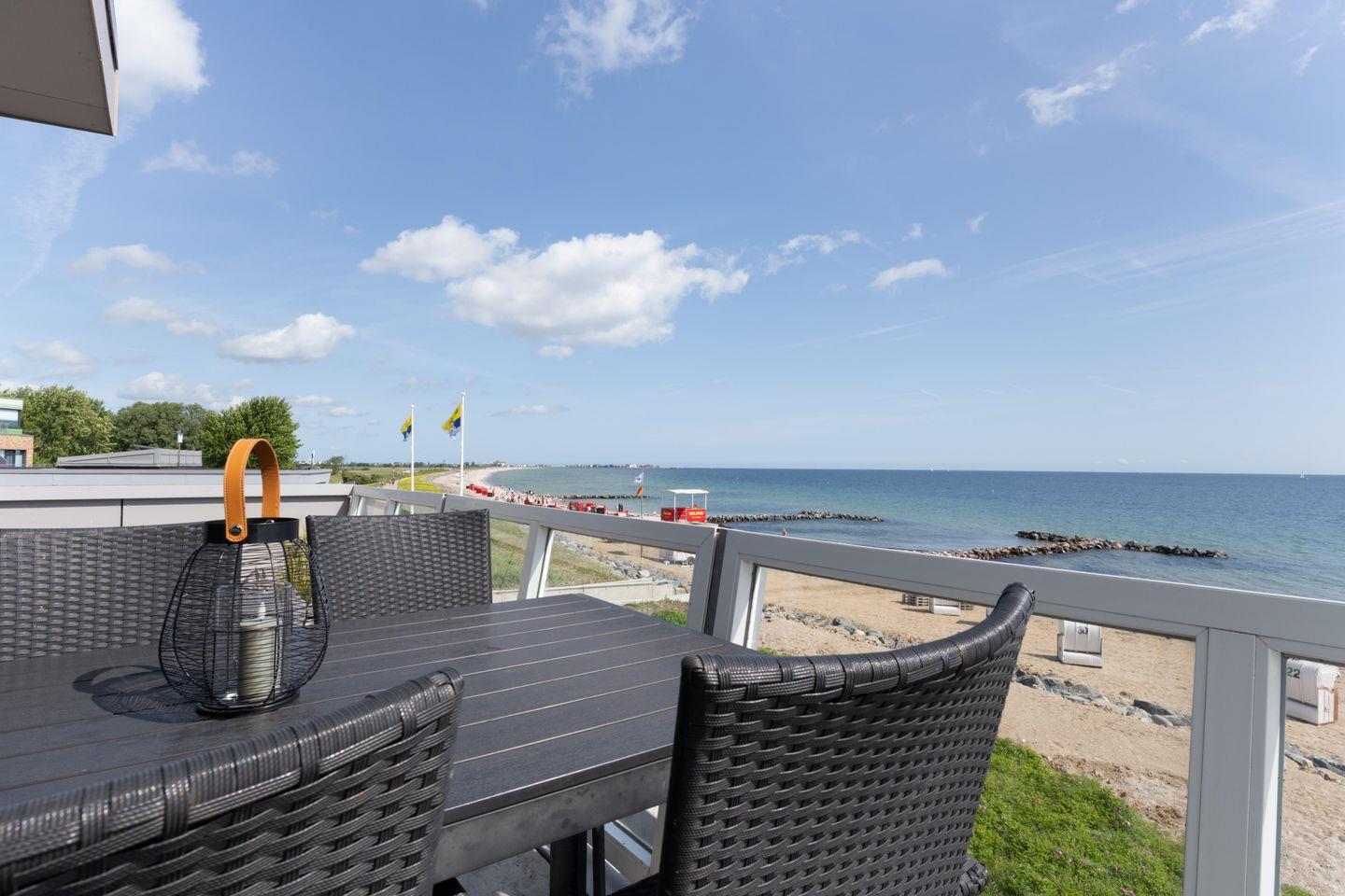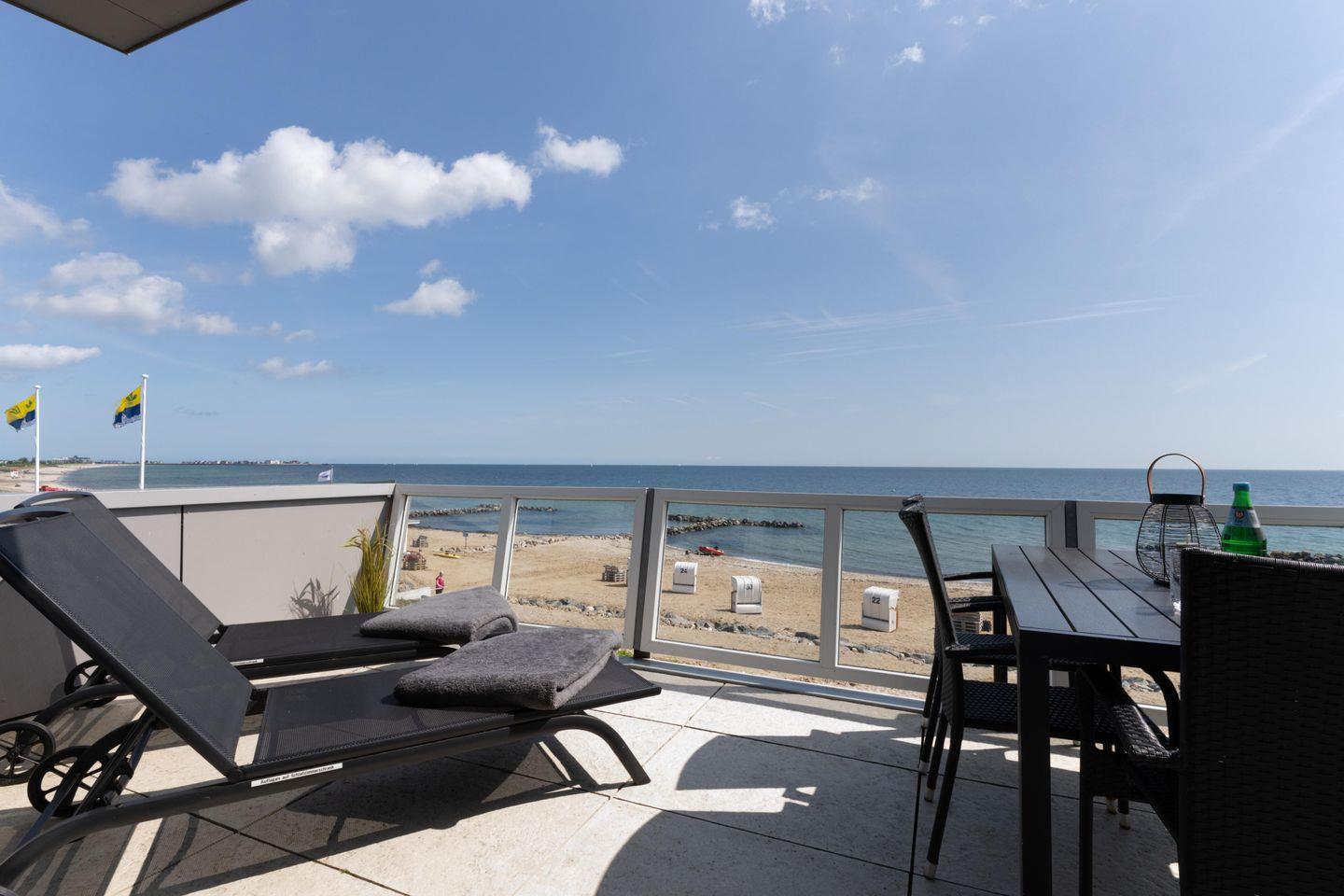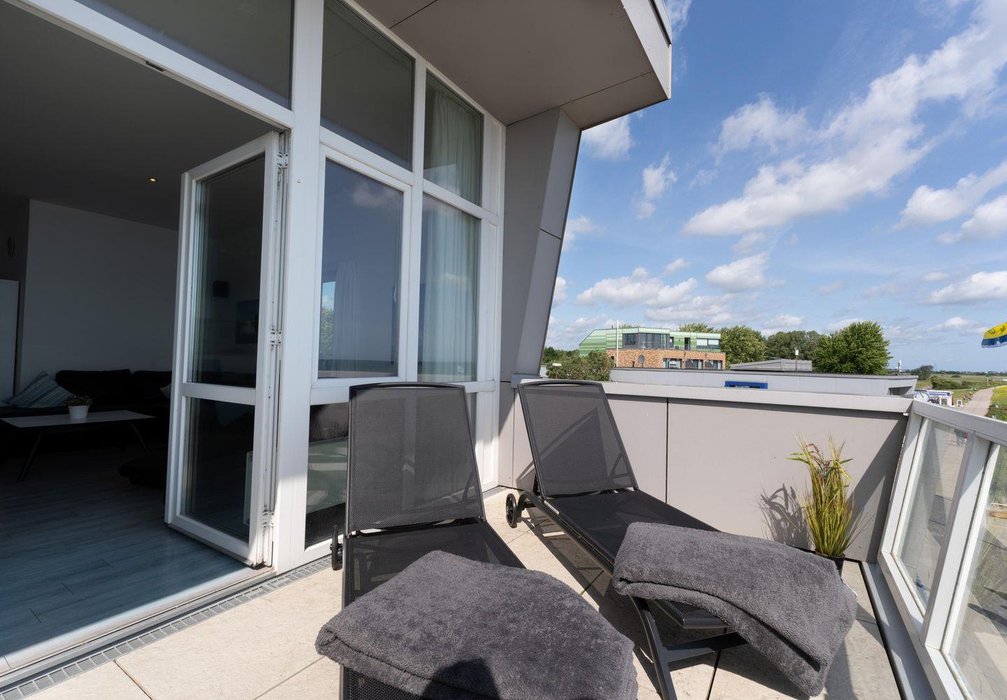 Zur Meerseite hin verfügt sie über einen Balkon, auf dem gemütliche Sonnenliegen zum Verweilen einladen. Zusätzlich steht Ihnen ein Grill für entspannte Abende mit traumhafter Aussicht zur Verfügung.