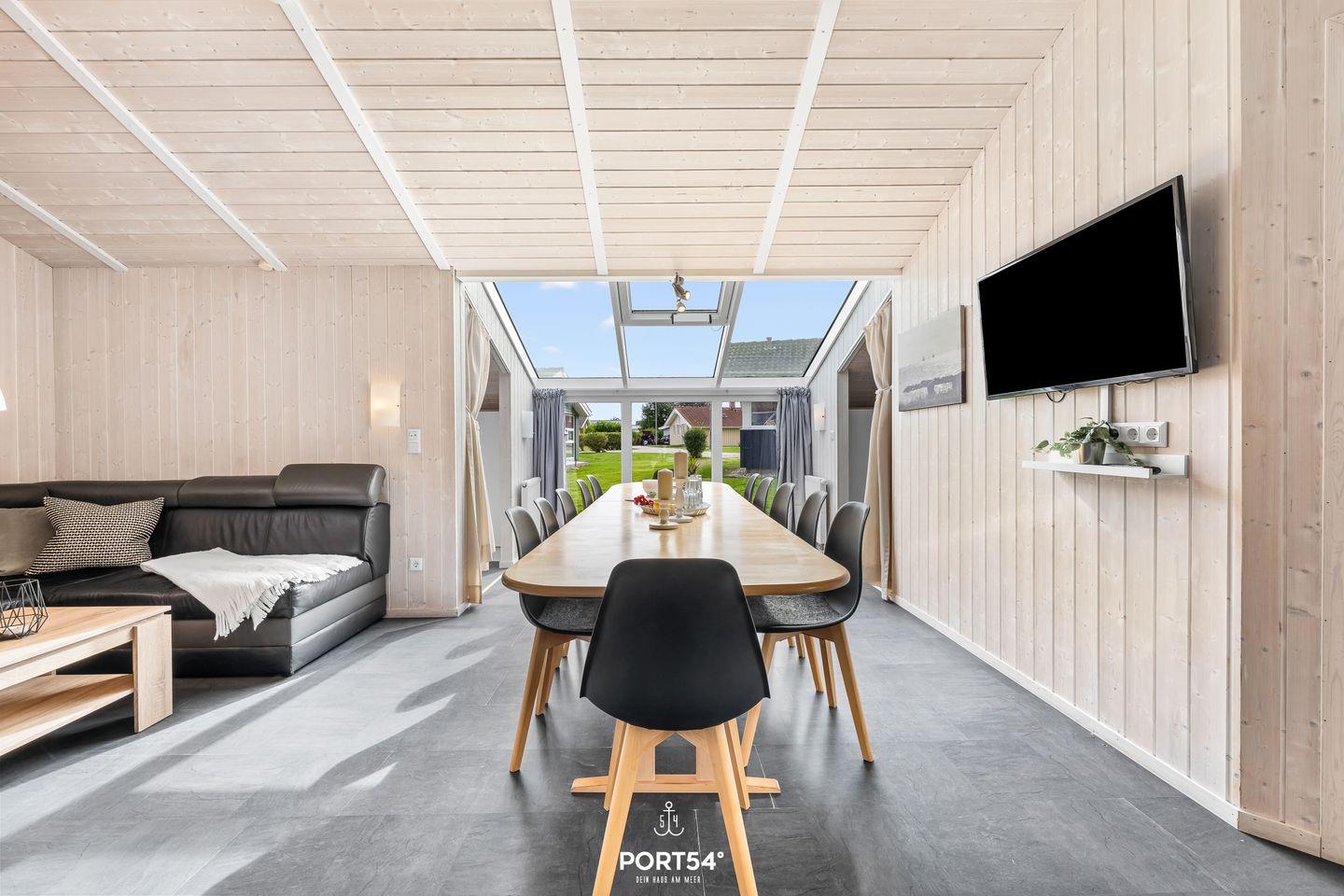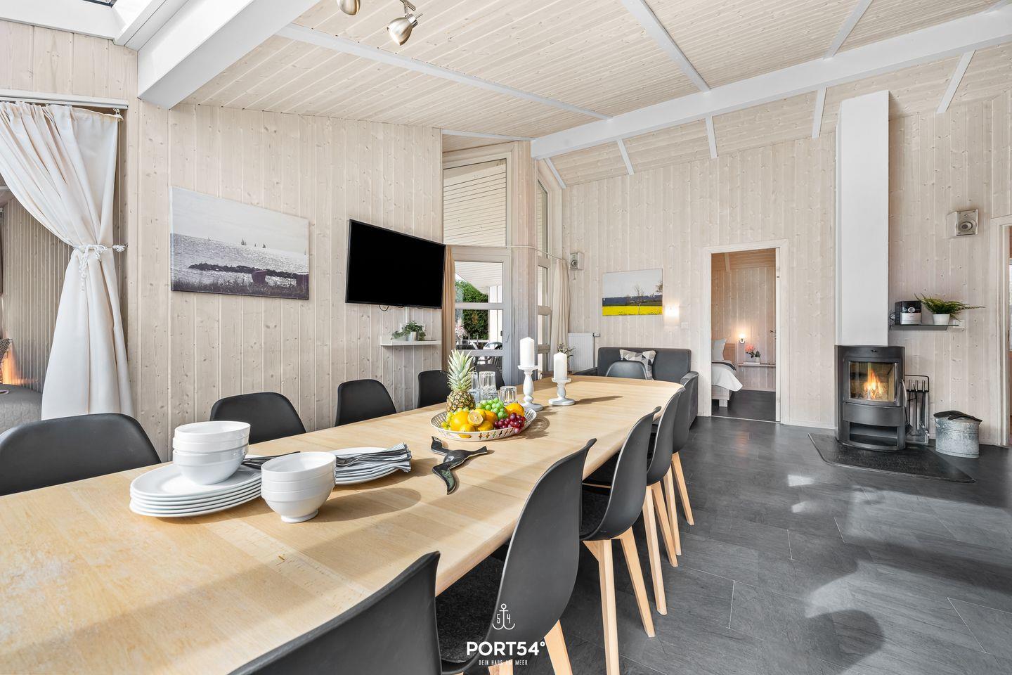 Willkommen im "Hellig Hus am Strand" – Ihrem perfekten Urlaubsdomizil an der Ostsee! Nur ein paar Schritte vom feinen Sandstrand entfernt, erwartet Sie ein großzügiges Ferienhaus mit rund 135?m² Wohnfläche, das Platz für bis zu 12 Personen bietet. Das Herzstück des Hauses ist der lichtdurchflutete Wohn- und Essbereich mit hohen Decken und einem gemütlichen Kaminofen – perfekt, um sich an kühleren Tagen einzukuscheln. Die großzügige, voll ausgestattete Küche lässt keine Wünsche offen – hier macht gemeinsames Kochen richtig Spaß! Für entspannte Wellnessmomente sorgt das Hauptbad mit ebenerdiger Dusche, Whirlwanne und finnischer Sauna. Eine Waschmaschine ist ebenfalls vorhanden. Zusätzlich gibt es ein weiteres, kleines Tageslichtbad mit ebenerdiger Dusche – ideal, wenn man mit mehreren Personen unterwegs ist. In vier gemütlichen Schlafzimmern schlafen Sie in bequemen Doppelbetten (180x200 cm). In jedem Schlafzimmer befindet sich ein kleiderschrank. Zwei weitere kleine Zimmer bieten insgesamt vier Einzelbetten (90x200 cm). Auch hier finden Sie Stauraum für Ihre Sachen vor. Bitte beachten: Die beiden kleinen Zimmer befinden sich unter der Dachschräge – kuschelig, aber mit etwas niedrigerer Deckenhöhe. Zwei Terrassen laden zum Entspannen ein. Die überdachte Terrasse mit Grill am Wohnbereich ist der perfekte Ort für lauschige Abende mit leckerem Essen und frischer Ostseeluft. Für Ihre Fahrzeuge stehen zwei Stellplätze direkt vorm Haus zur Verfügung. Weitere öffentliche Parkplätze finden Sie nur wenige Meter entfernt.