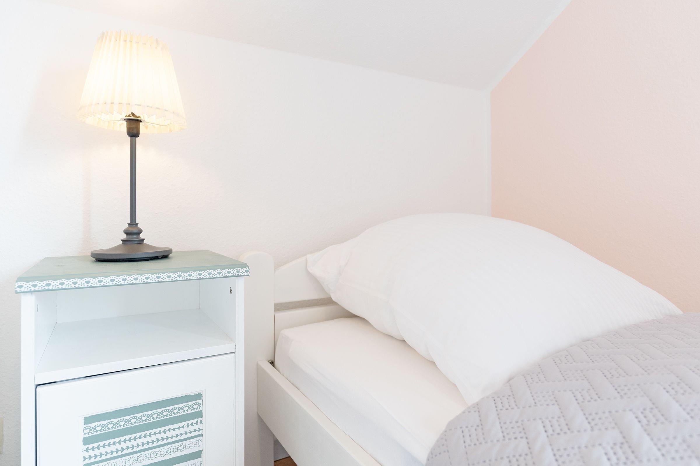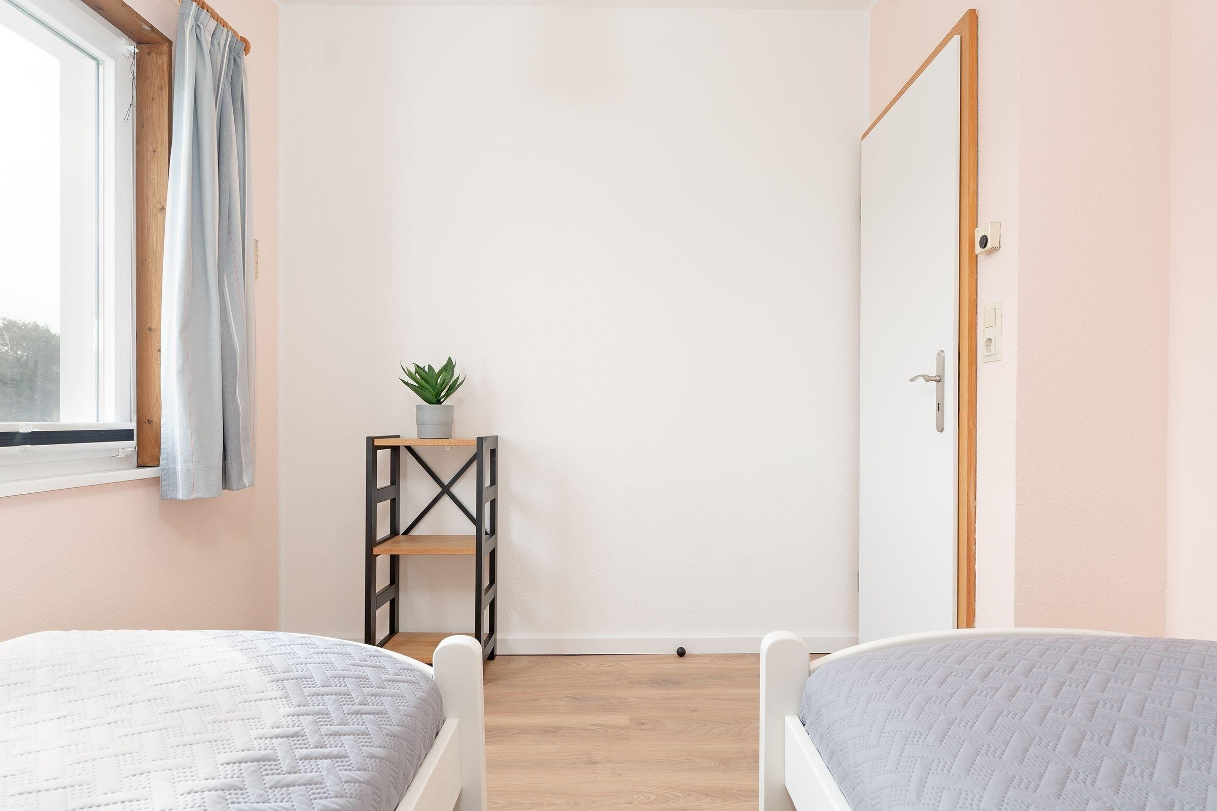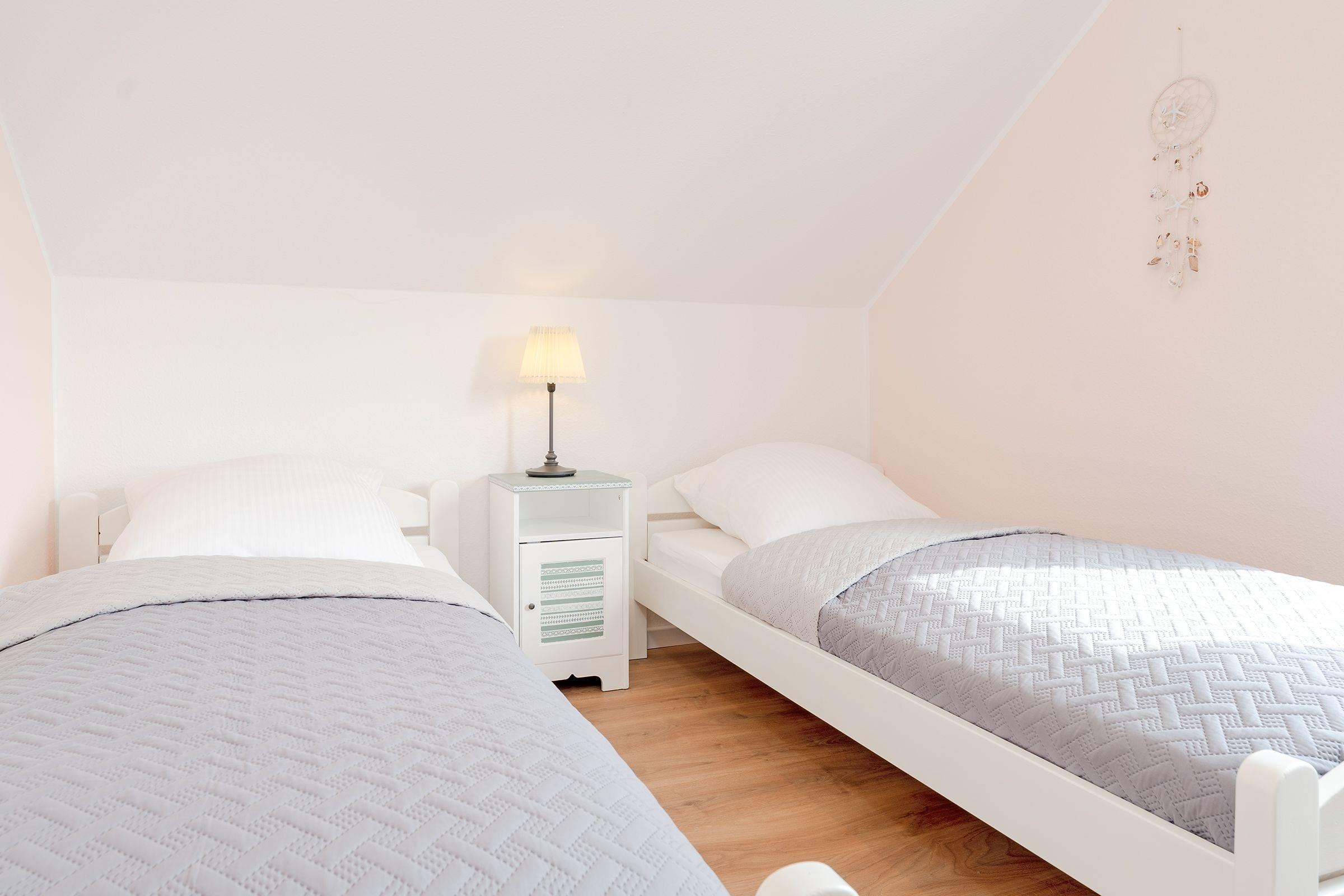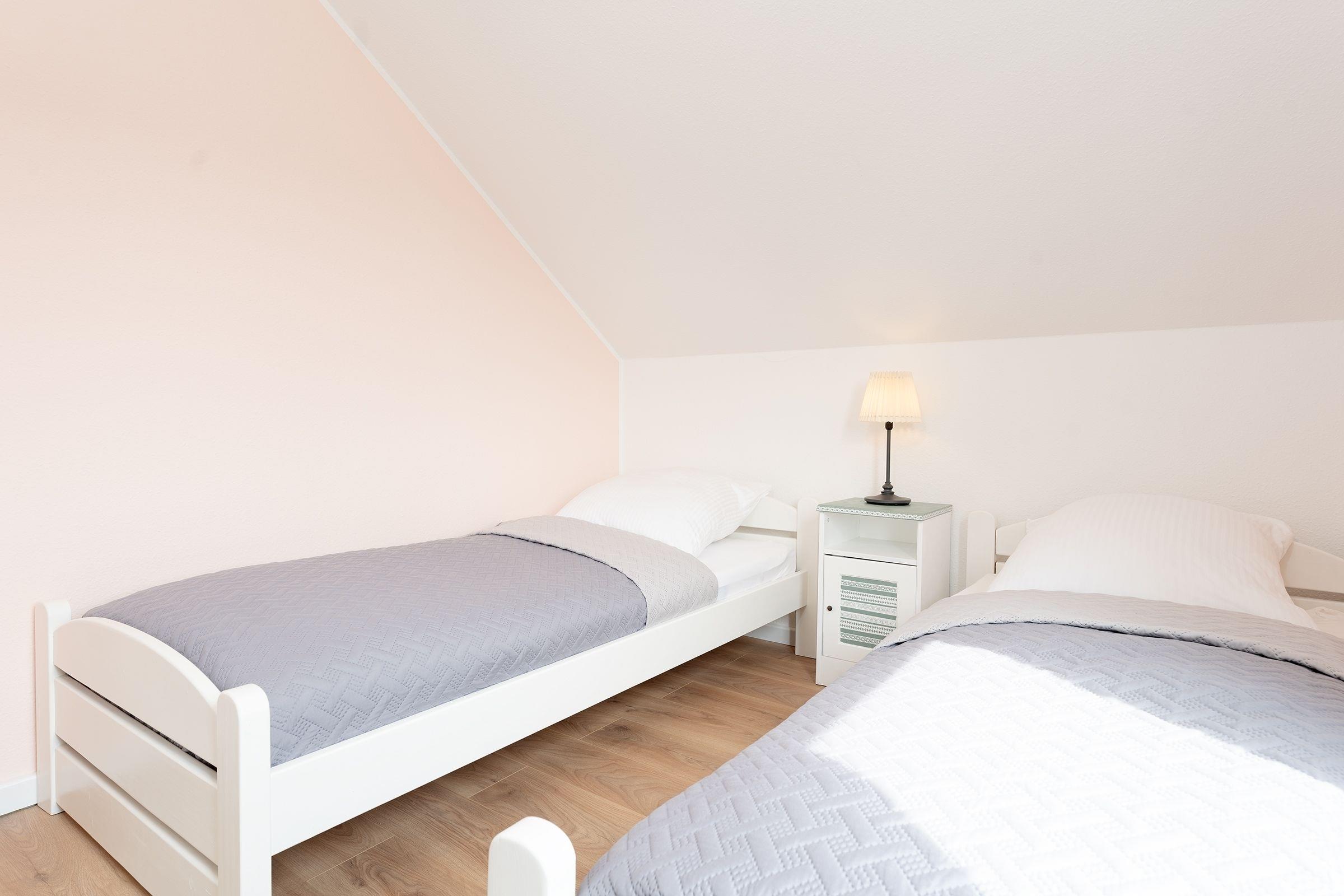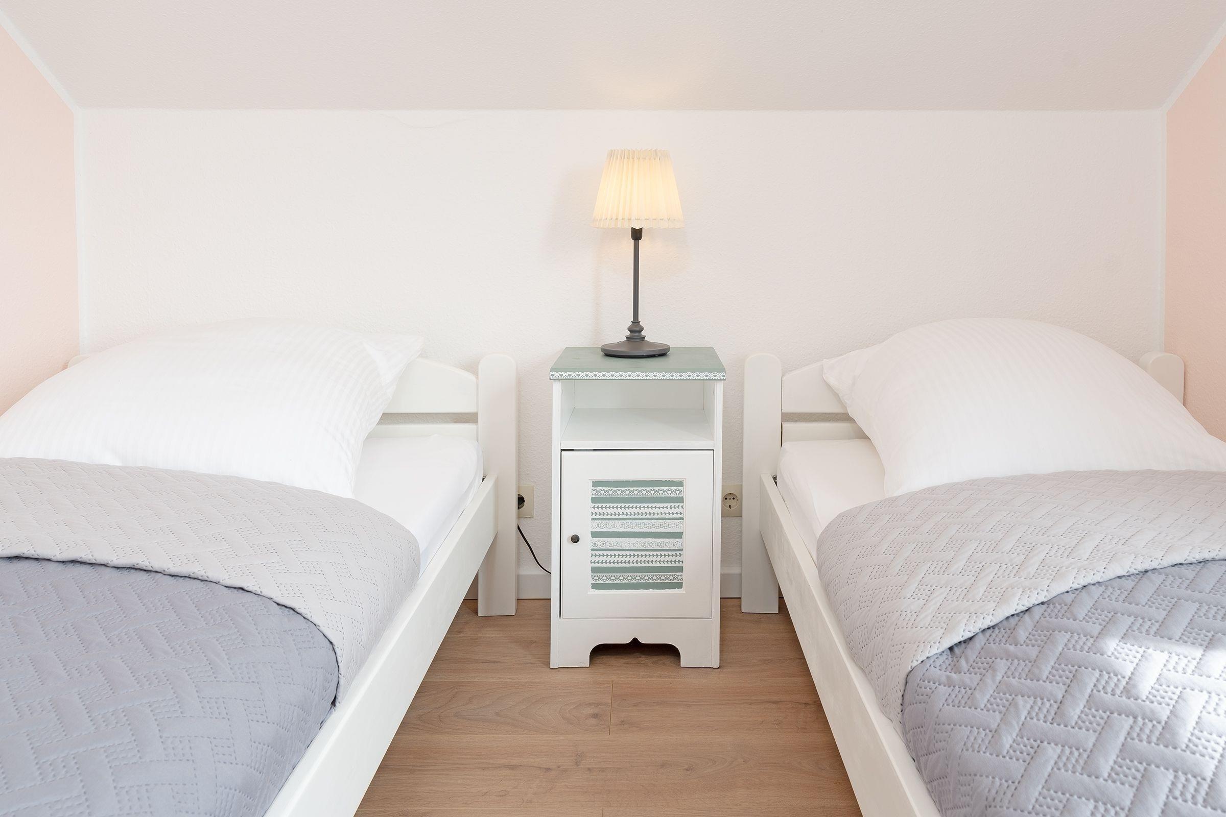 Schlafzimmer 1 im OG: 2 Einzelbetten (je 90x200cm), Kleiderschrank, Verdunkelung: Plissee + Vorhang, Platz für Babybett vorhanden