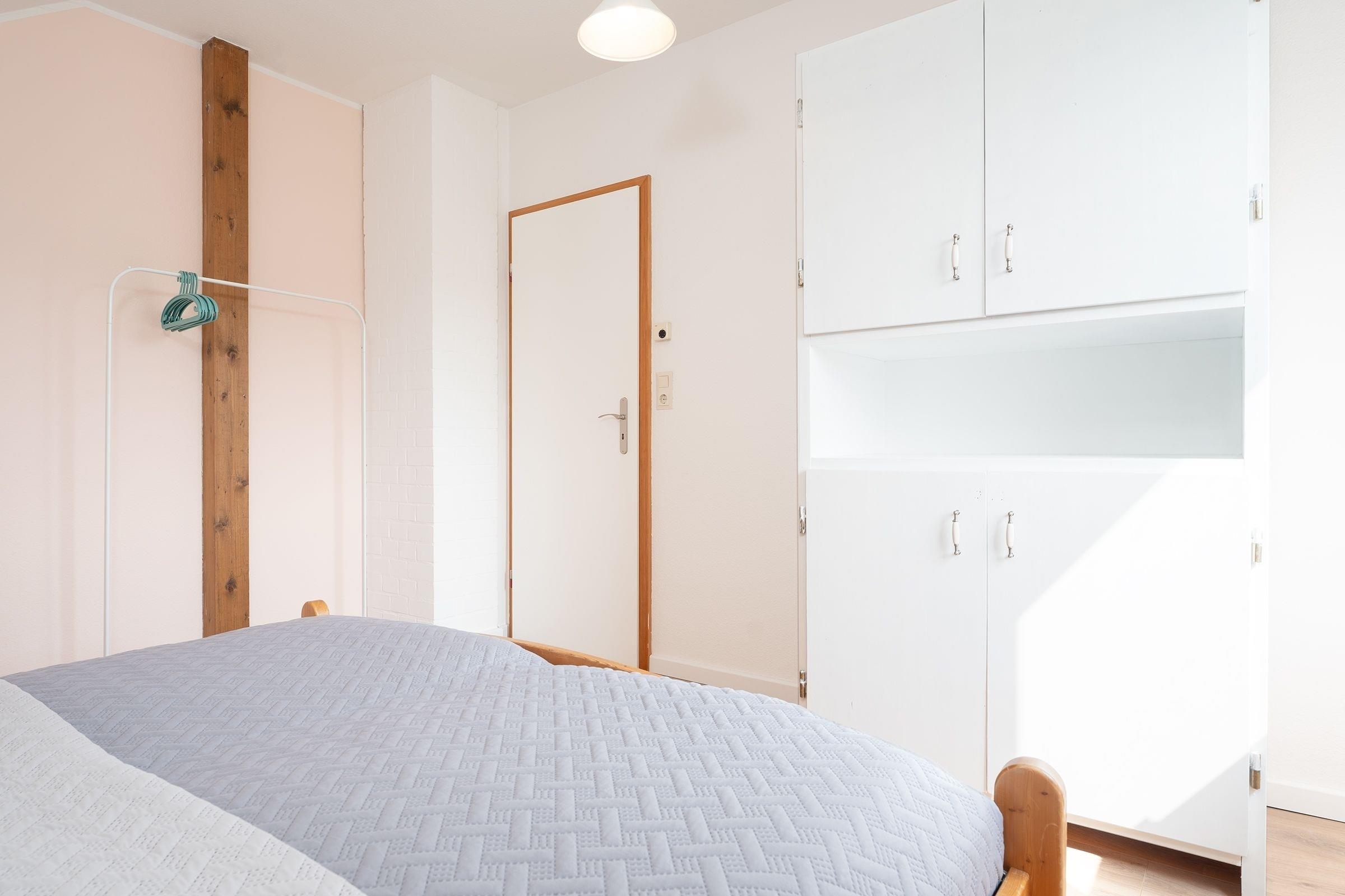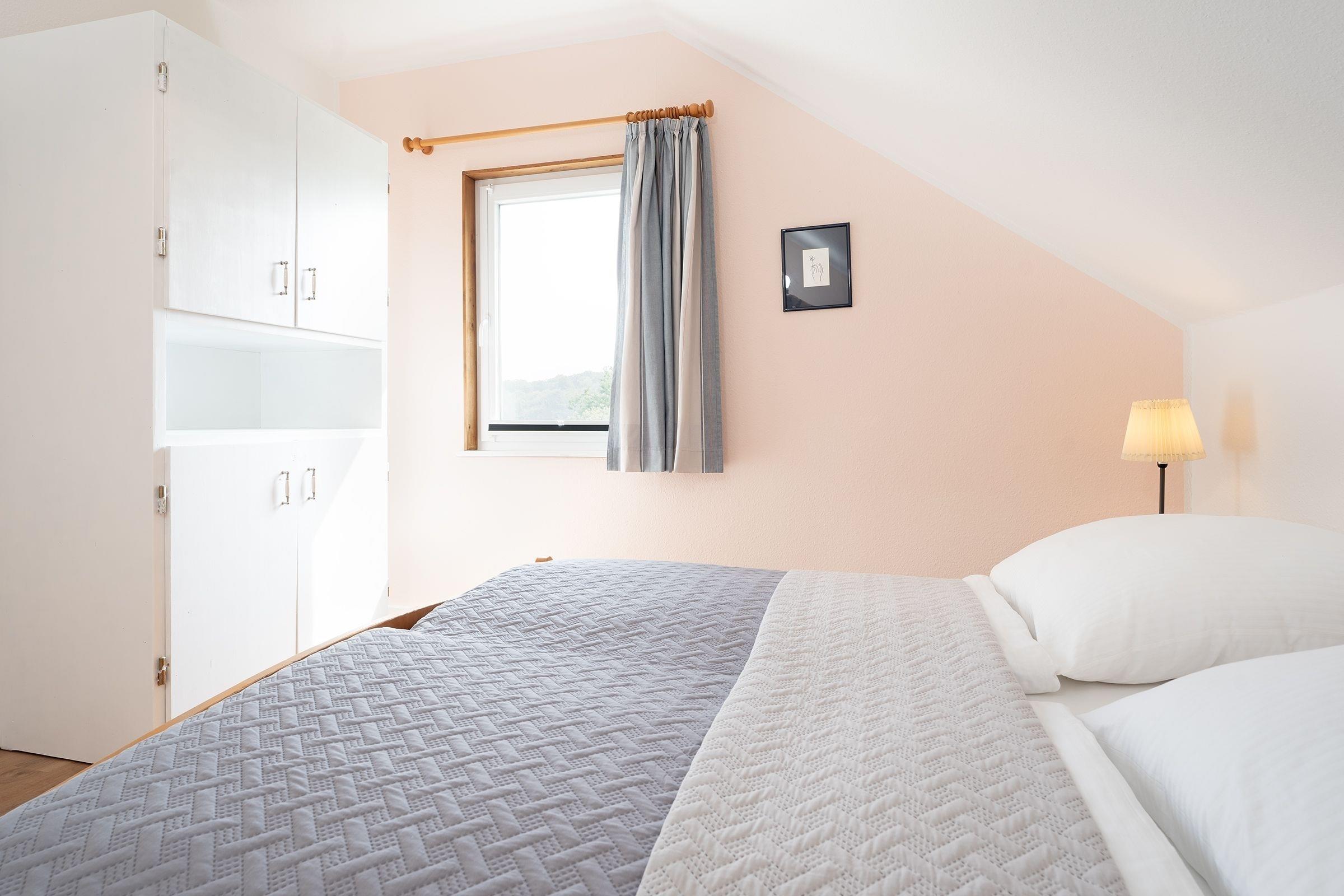 Schlafzimmer 1 im OG: 1 Doppelbett (2x 90x200cm), Kleiderschrank, Verdunkelung: Plissee + Vorhang, Babybett vorhanden