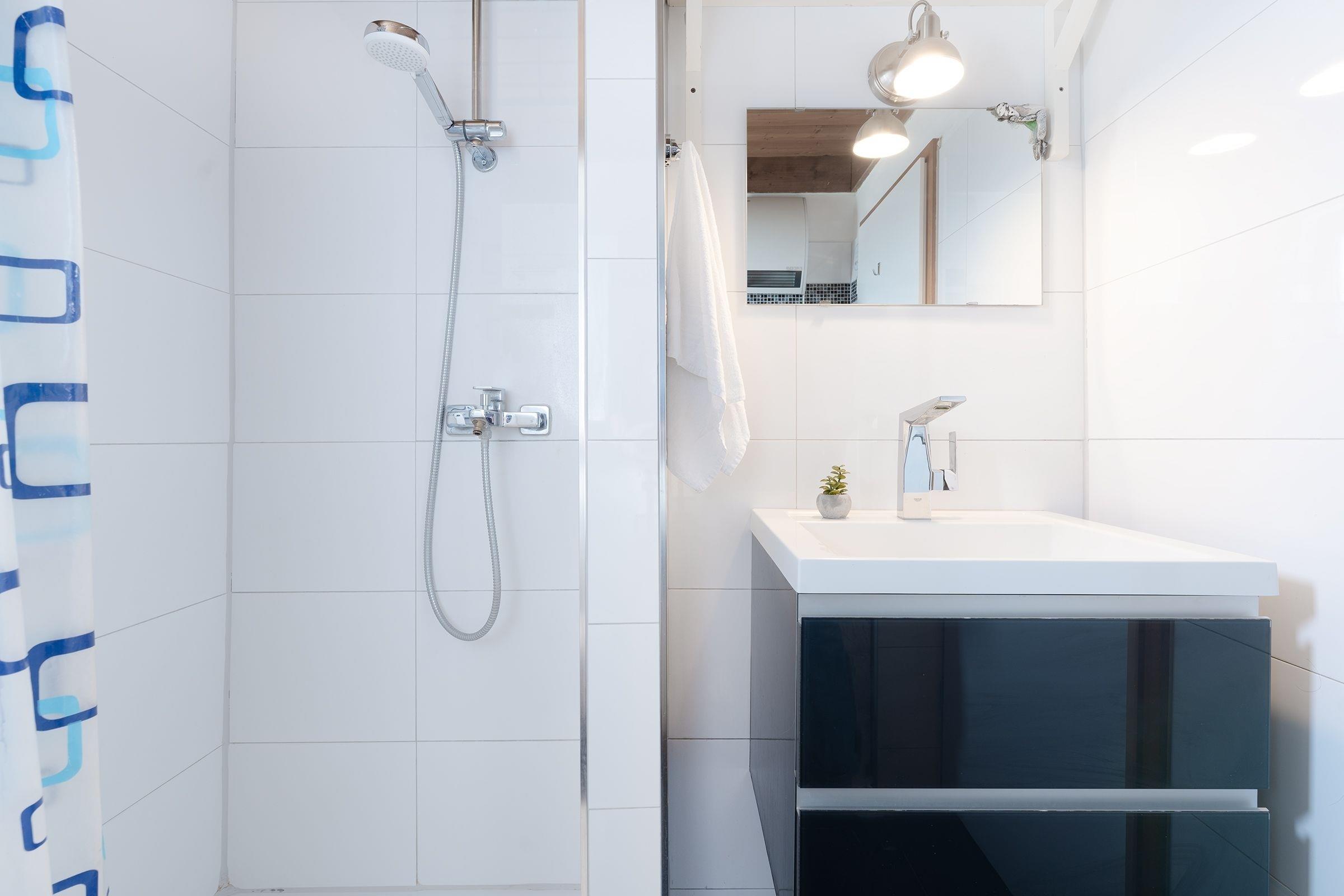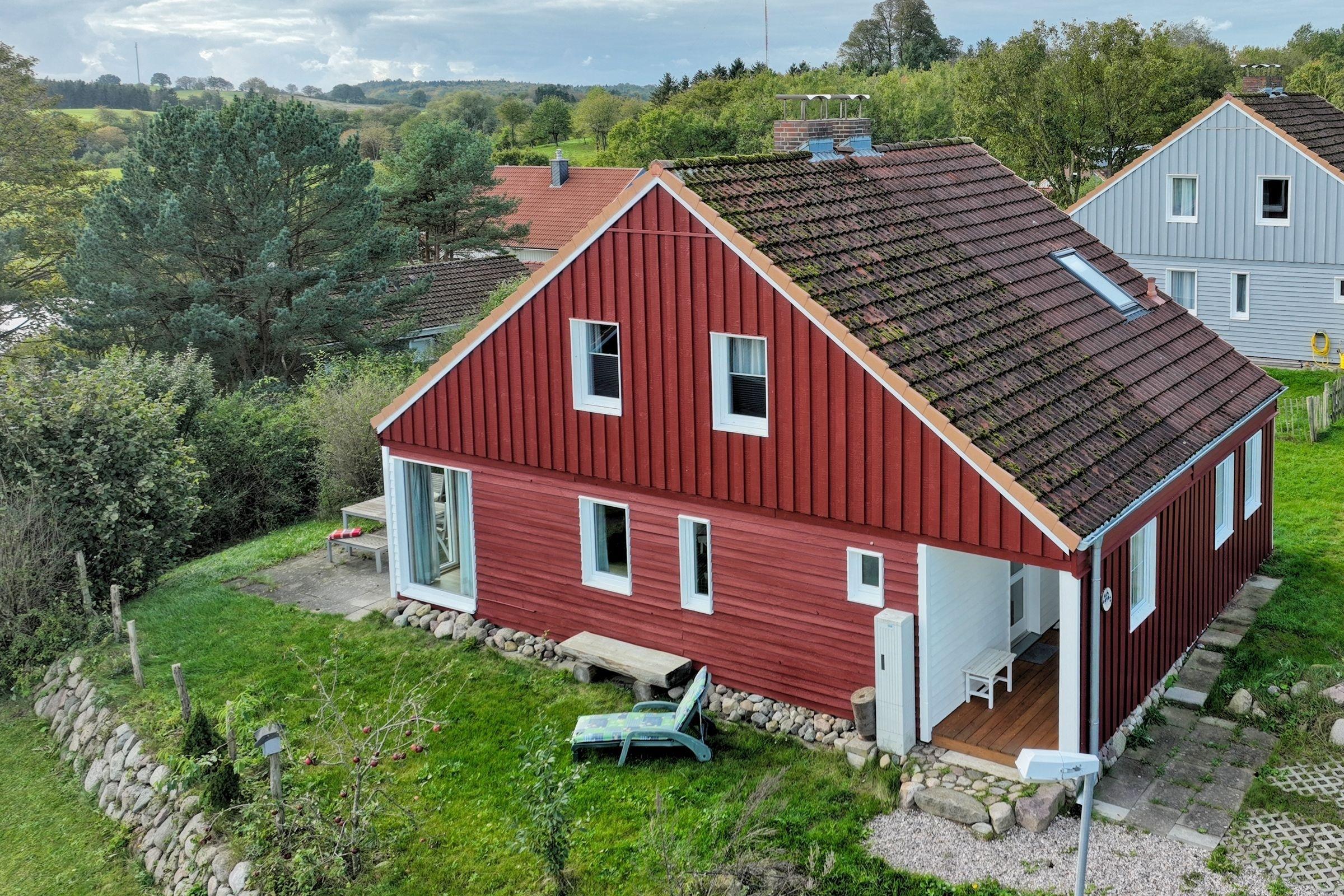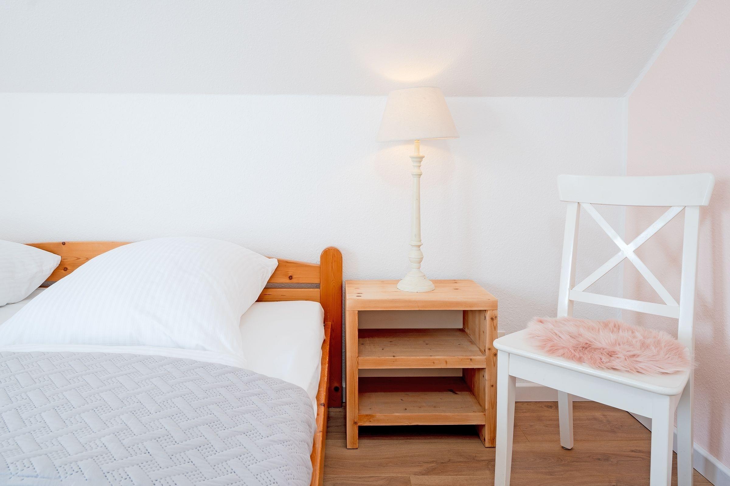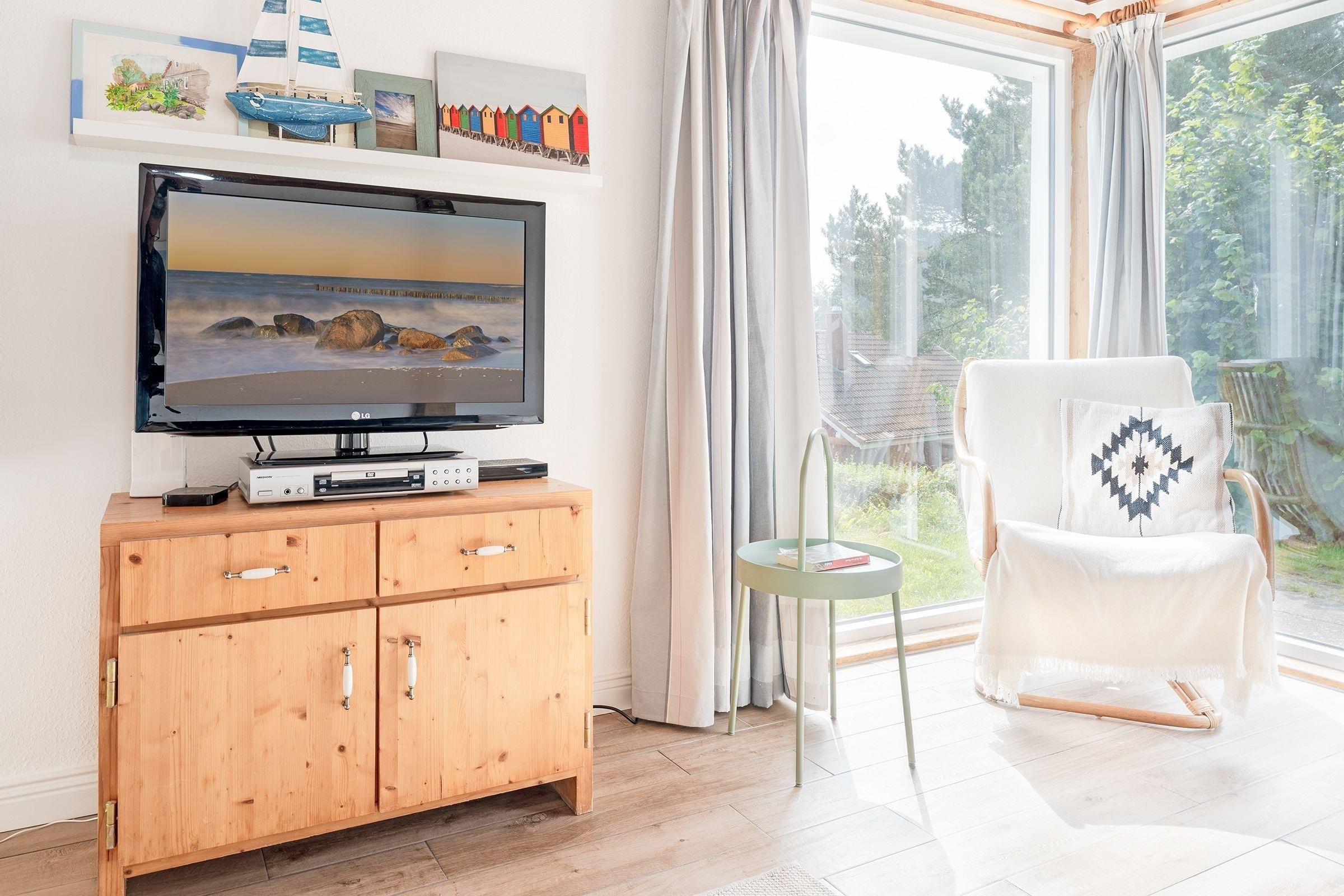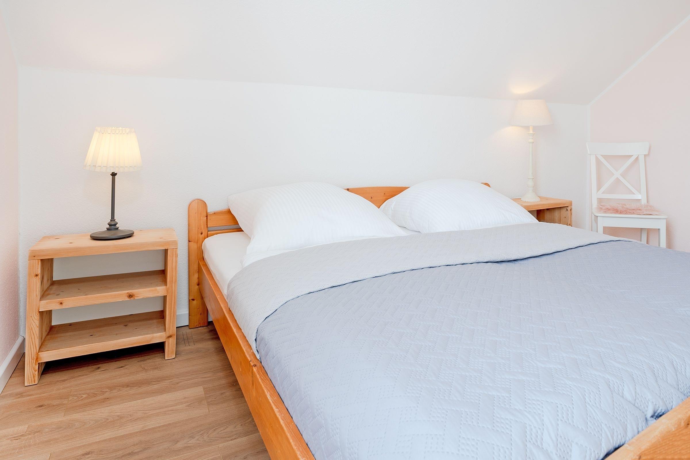 Der helle Wohnbereich empfängt Sie mit einer großen Sofalandschaft, auf der Sie wunderbar entspannen können. Ein TV-Gerät sowie ein DVD-Player sorgen für die richtige Unterhaltung – und ein Kaminofen für eine gemütliche Atmosphäre. Hier lässt es sich gut aushalten, sollte das Wetter mal nicht mitspielen. Bei warmen Temperaturen geht es natürlich nach draußen: Die großzügige möblierte Terrasse, die Sie vom Wohnraum aus betreten können, ist nach Südwesten ausgerichtet und verspricht zahlreiche Sonnenstunden. Wie wäre es hier abends mit einem Glas Wein? Im Winter haben Sie von hier einen schönen Blick auf den See. Der kleine Garten wird nur von Ihnen genutzt und bietet Sonnenliegen sowie ein Sonnensegel. Hier dürfen Sie gern grillen. Wer seine Speisen lieber im Kochtopf zubereitet, ist mit der kleinen, zum Wohnbereich hin offenen Küche mit Spülmaschine gut beraten. Im Erdgeschoss befindet sich zudem ein Duschbad mit Fenster, Föhn und Kosmetikspiegel. Für die Nacht geht es für Sie bequem ins Obergeschoss: Hier warten auf Sie zwei Schlafzimmer, eins mit einem Doppelbett (2x 90x200 cm) und eins mit zwei Einzelbetten (je 90x200 cm). Beide Räume verfügen über einen Kleiderschrank für Ihre Urlaubsgarderobe und können mit Plissees und Vorhängen abgedunkelt werden. Für die kleinen Gäste steht ein Hochstuhl kostenfrei bereit.