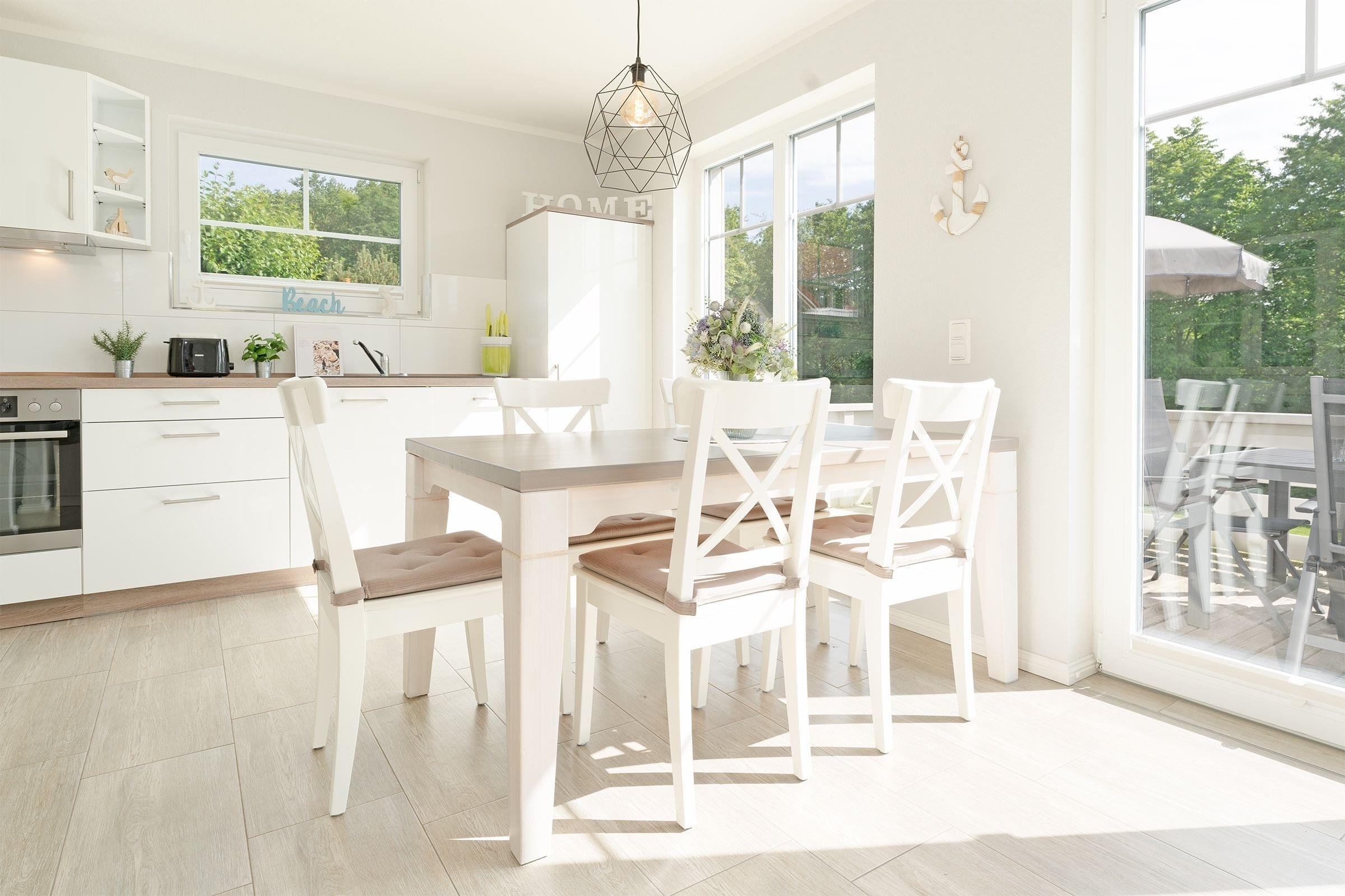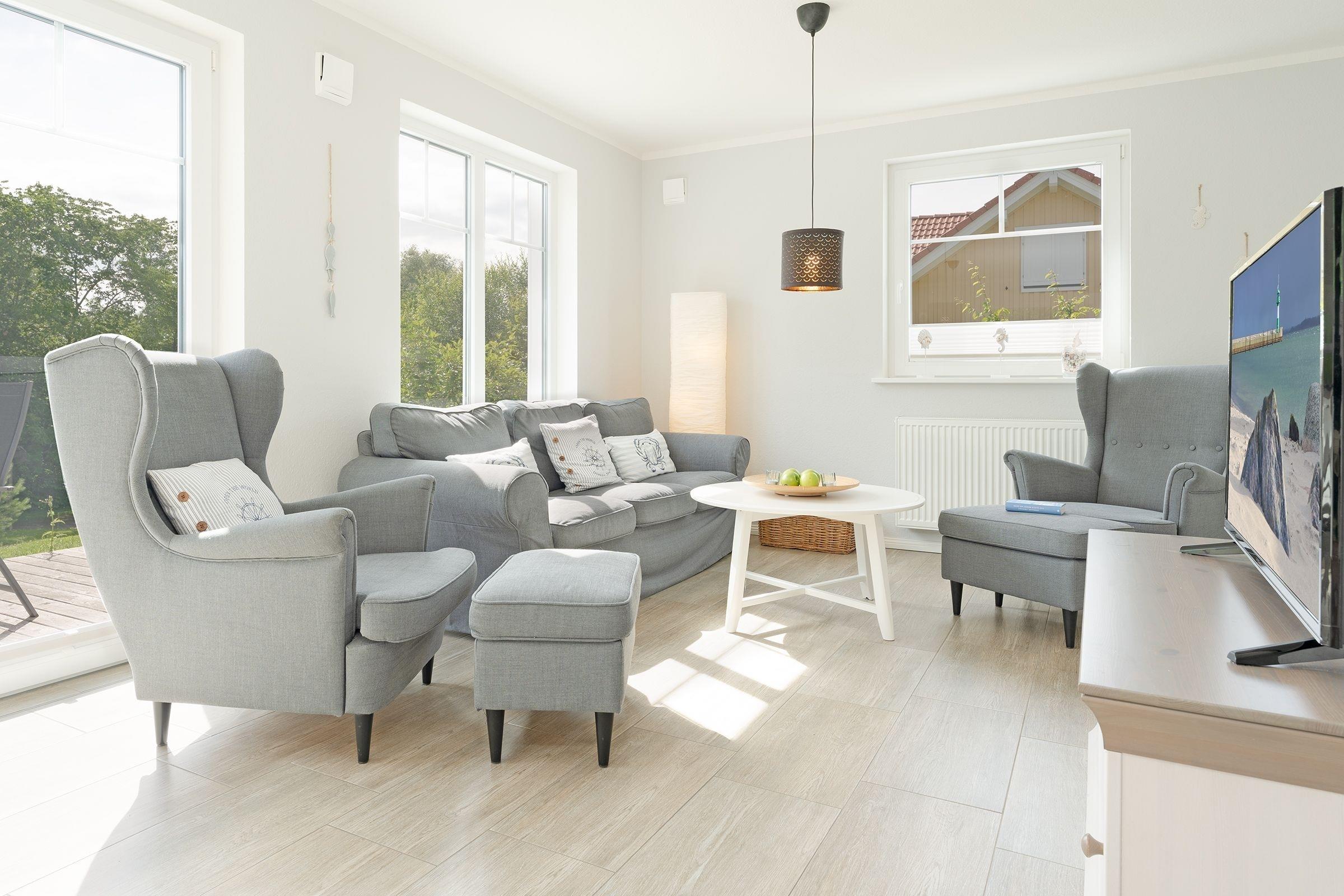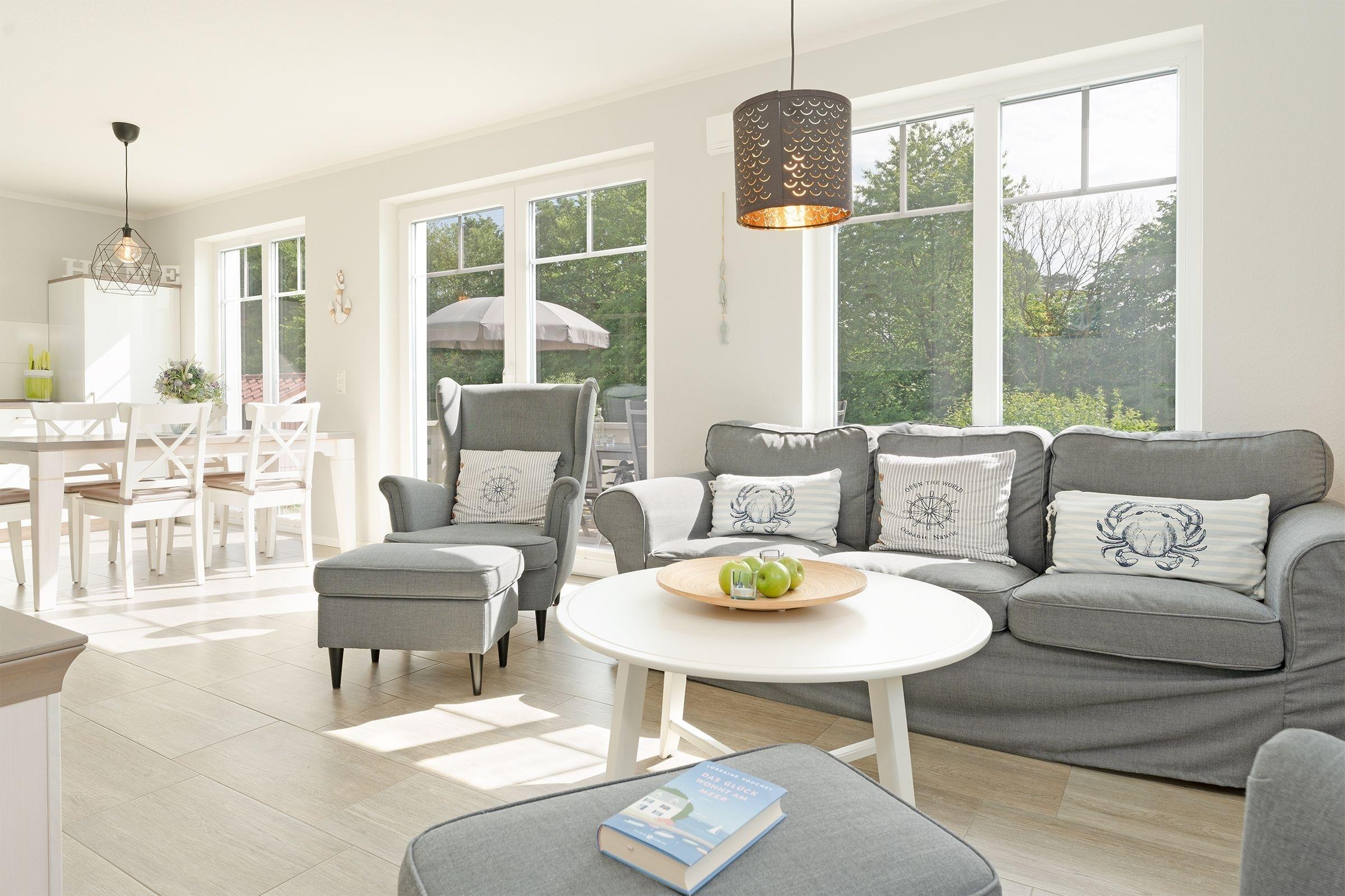 Das zauberhafte Haus bietet viele Möglichkeiten. Treten Sie ein, die schicke Einrichtung wird Sie überzeugen: In der gemütlichen Sessel- und Sofalandschaft findet jeder seinen Lieblingsplatz. Auch die großzügige, möblierte Terrasse lädt zum Verweilen ein. Die offene Küche ist mit Extras wie Espressomaschine (Senseo) und Geschirrspüler ausgestattet. Für die Nacht stehen Ihnen drei Schlafzimmer zur Verfügung: Eins im EG mit einem Doppelbett (140x200 cm) und zwei im OG: davon eins mit 2 Einzelbetten (je 90x200 cm) und eins mit einem weiteren Doppelbett (2x 80x160 cm). Gleich zwei Duschbäder komplettieren das Angebot in diesem Feriendomizil und werden Sie entspannt in den neuen Tag bringen.