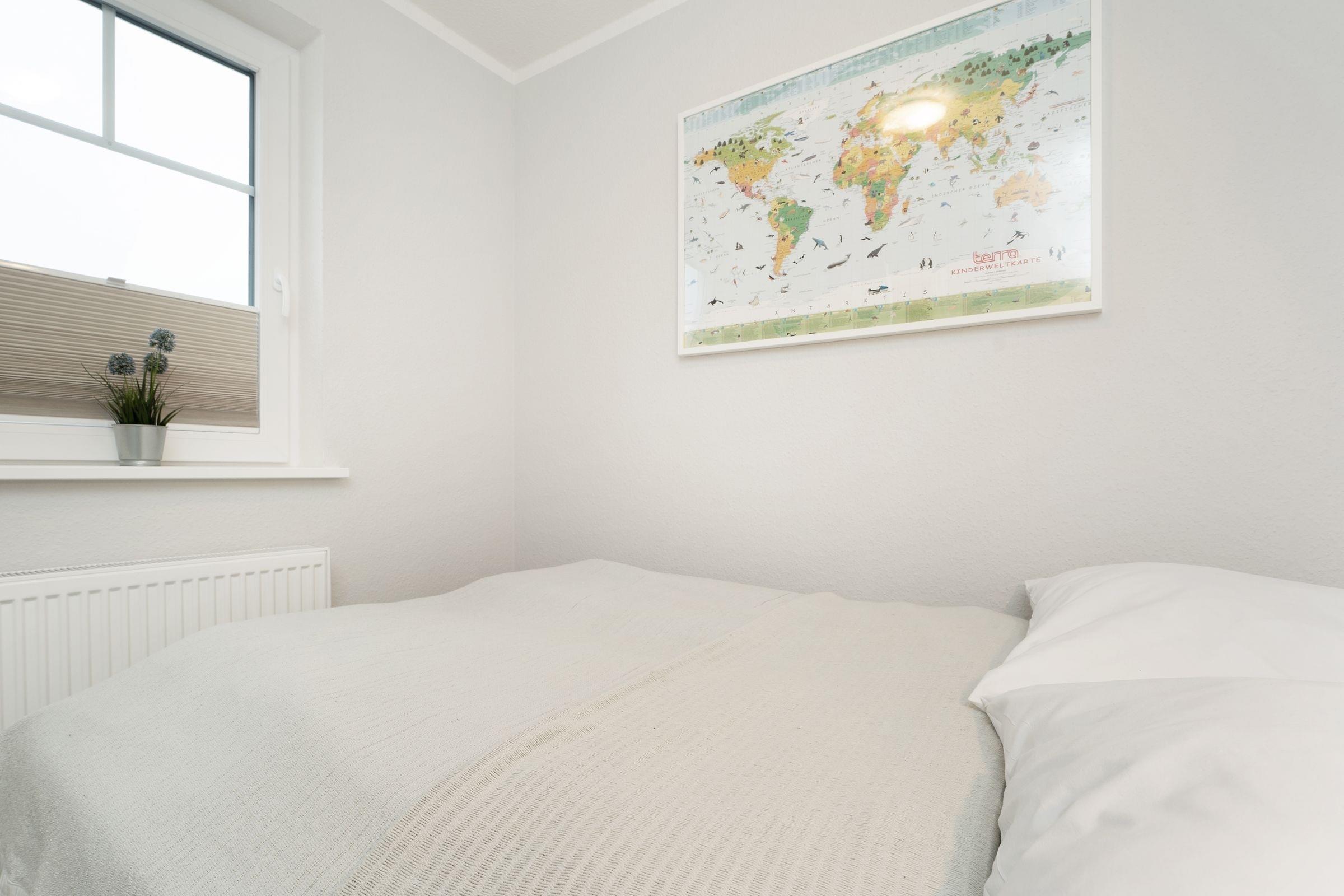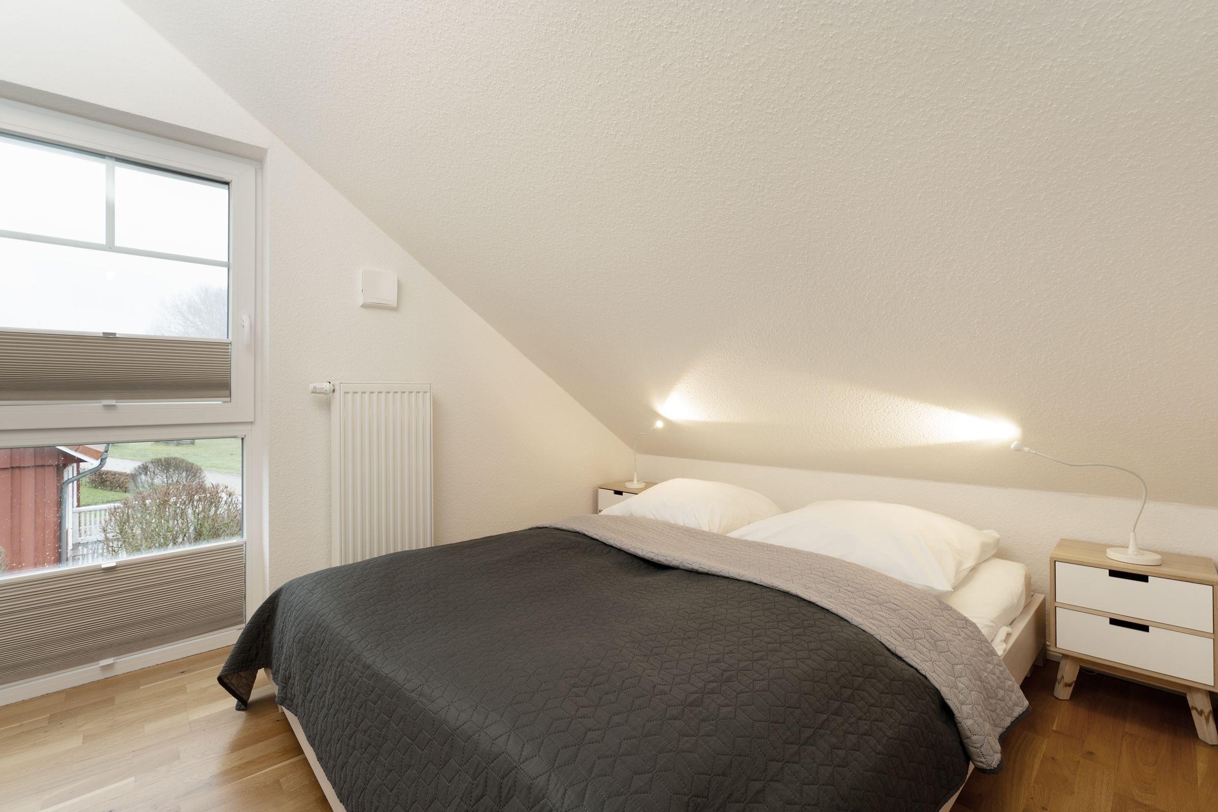 1. Schlafzimmer im EG: 1 Doppelbett (140x200 cm), Verdunkelung: Plissee, kein Platz für ein Babybett