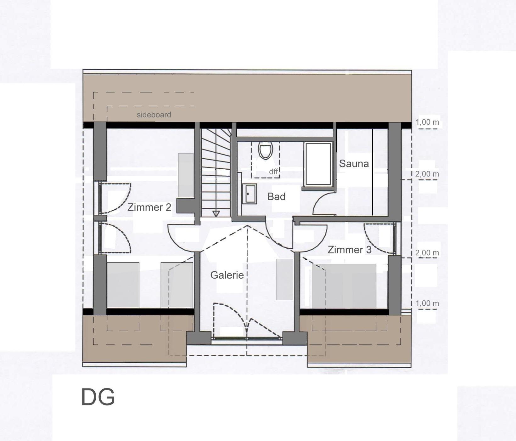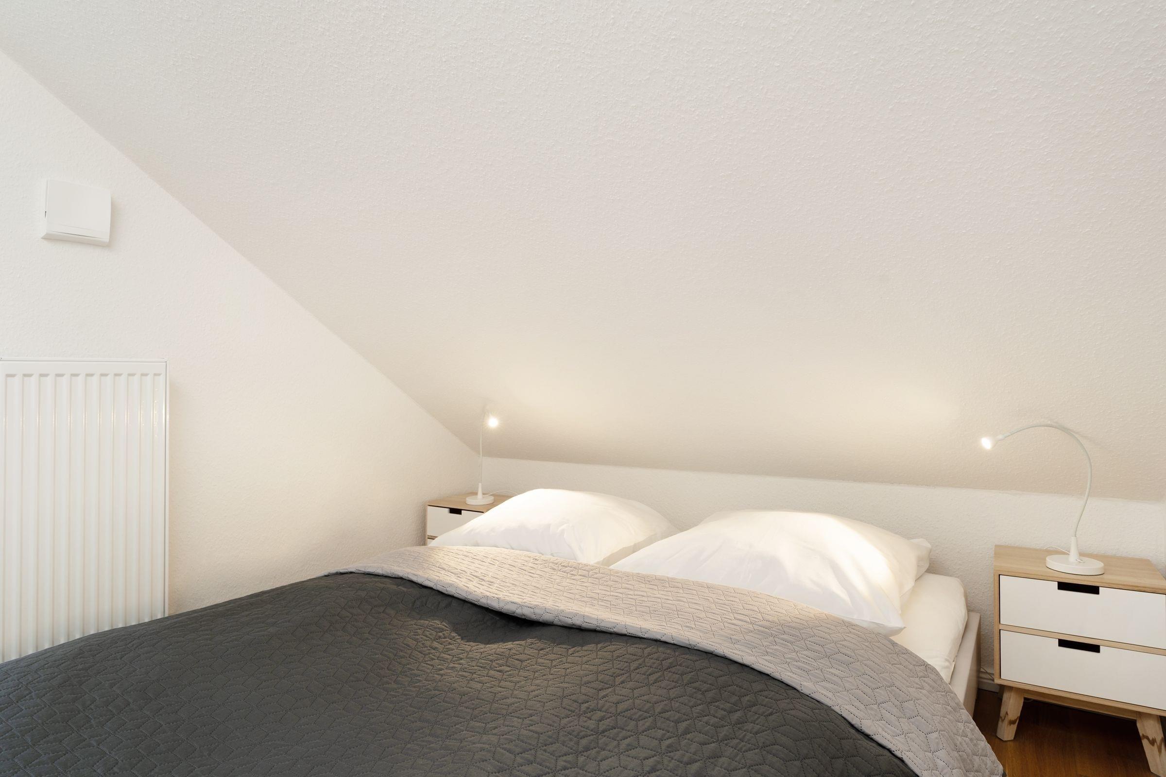 2. Schlafzimmer im DG: 2 Einzelbetten (je 90x200 cm), Kleiderschrank, Verdunkelung: Rolladen, kein Platz für ein Babybett, zwei kleine Sessel