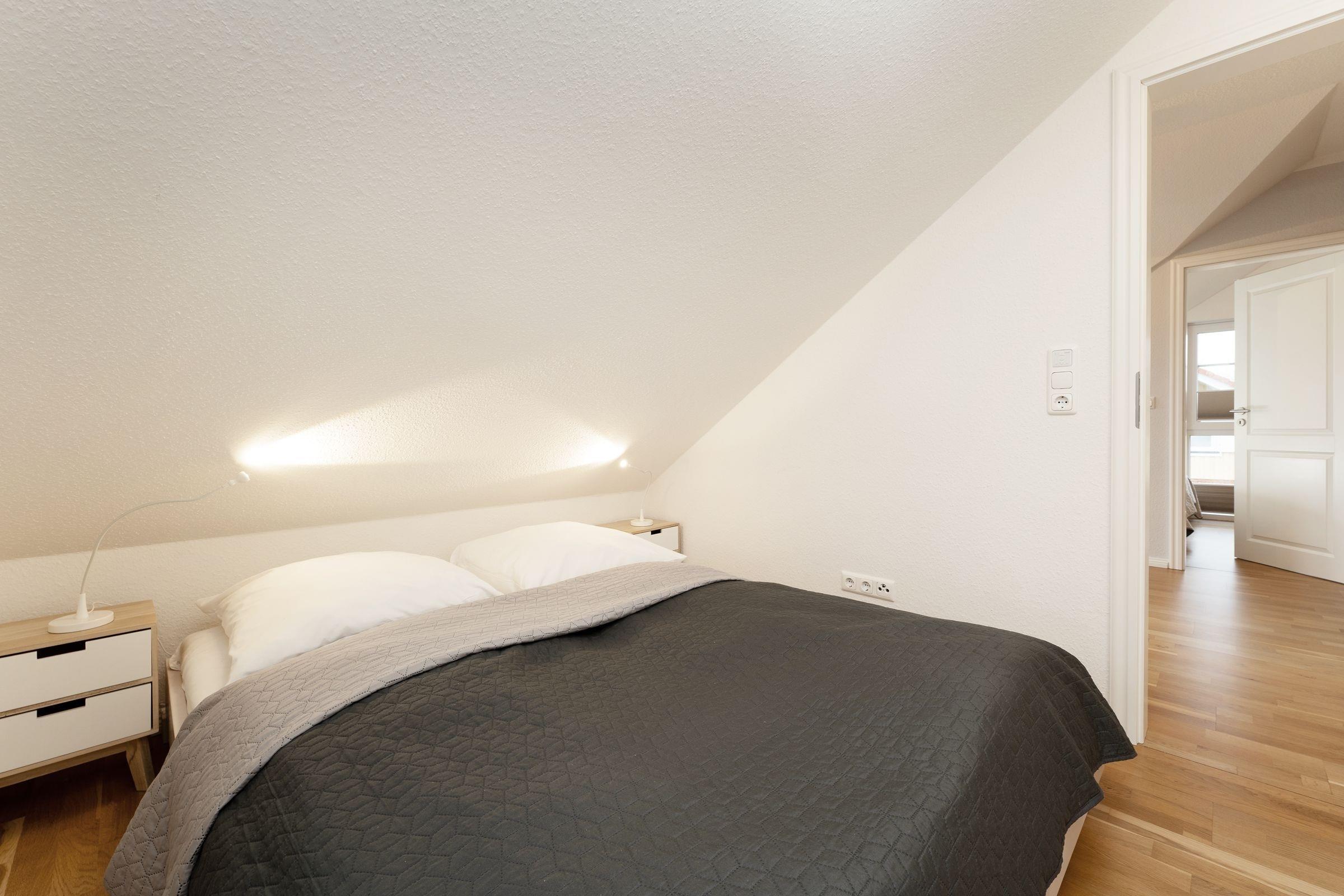 3. Schlafzimmer im DG: 1 Doppelbett (2 x 80x200 cm), Kleiderschrank, TV, Verdunkelung: Rolladen, Platz für Babybett vorhanden