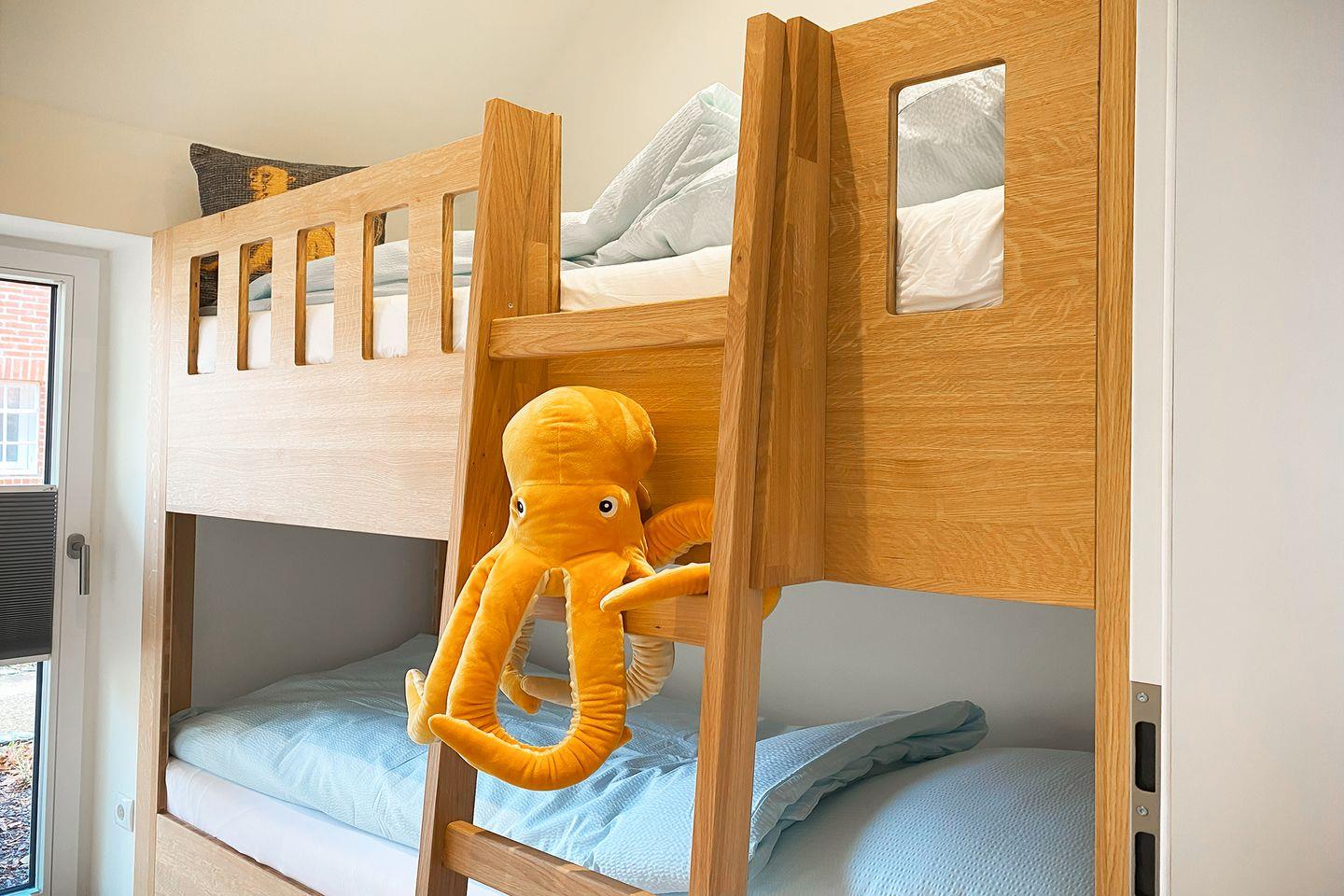 Neben dem offenen Schlafbereich verfügt die Wohnung über zwei separate Schlafzimmer mit Türen – eines mit Einzelbett, das andere mit einem Etagenbett. Ideal für Familien mit Kindern oder kleine Gruppen, die gemeinsame Zeit und individuelle Rückzugsorte suchen.