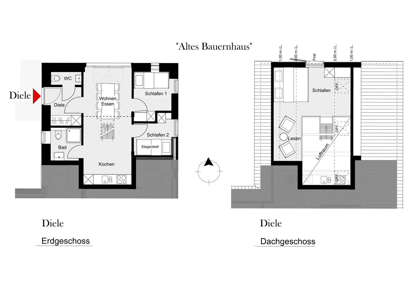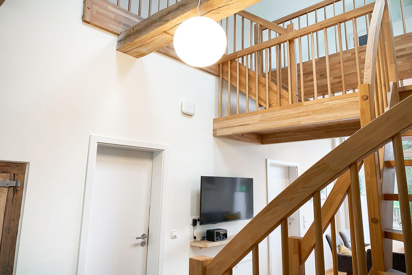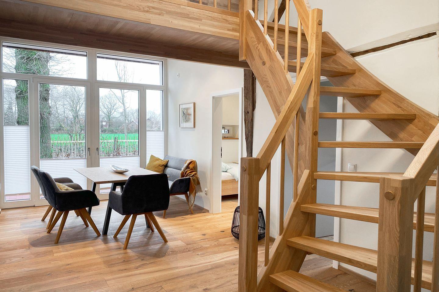 Rustikaler Charme trifft modernen Komfort: Die großzügige Maisonettewohnung „Diele“ im historischen Bauernhaus bietet Platz für bis zu 5 Personen. Offenes Wohnen mit Galerie, zwei separate Schlafzimmer, hochwertige Küche und liebevolle Details machen deinen Aufenthalt besonders. Bettwäsche, Handtücher und WLAN inklusive.