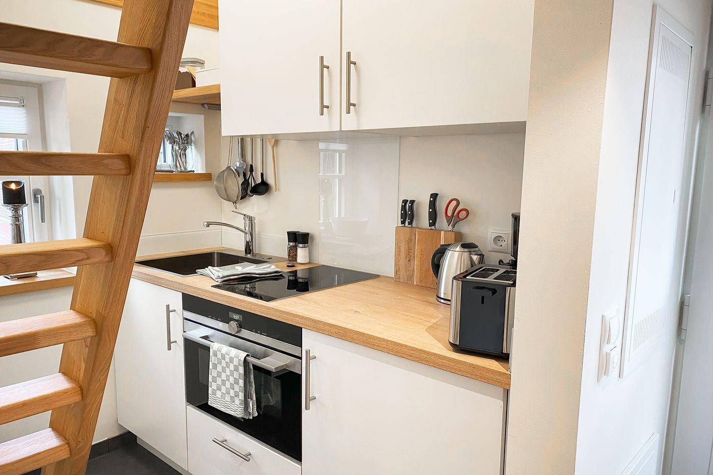 Der helle Wohnbereich ist liebevoll gestaltet und lädt mit gemütlichem Sofa, Smart-TV und direktem Zugang zur Terrasse zum Verweilen ein. In der offenen Küche findest du alles für die Selbstversorgung – und der kleine Essplatz schafft eine angenehme Atmosphäre für gemeinsame Mahlzeiten.