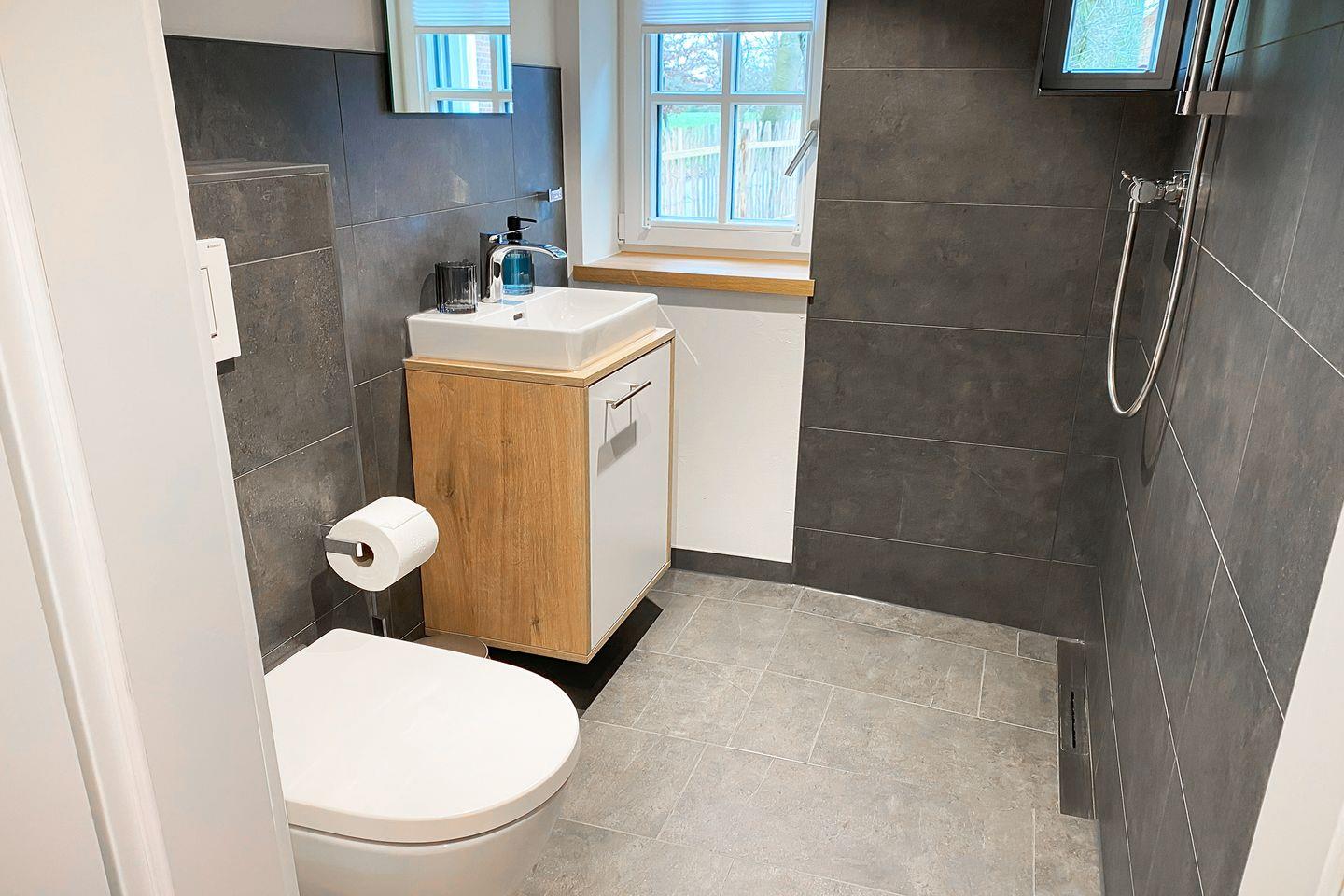 Das moderne Tageslichtbad verfügt über eine ebenerdige Dusche, ein WC, einen Handtuchwärmer sowie einen Waschtisch mit viel Ablagefläche – hell, funktional und stilvoll.