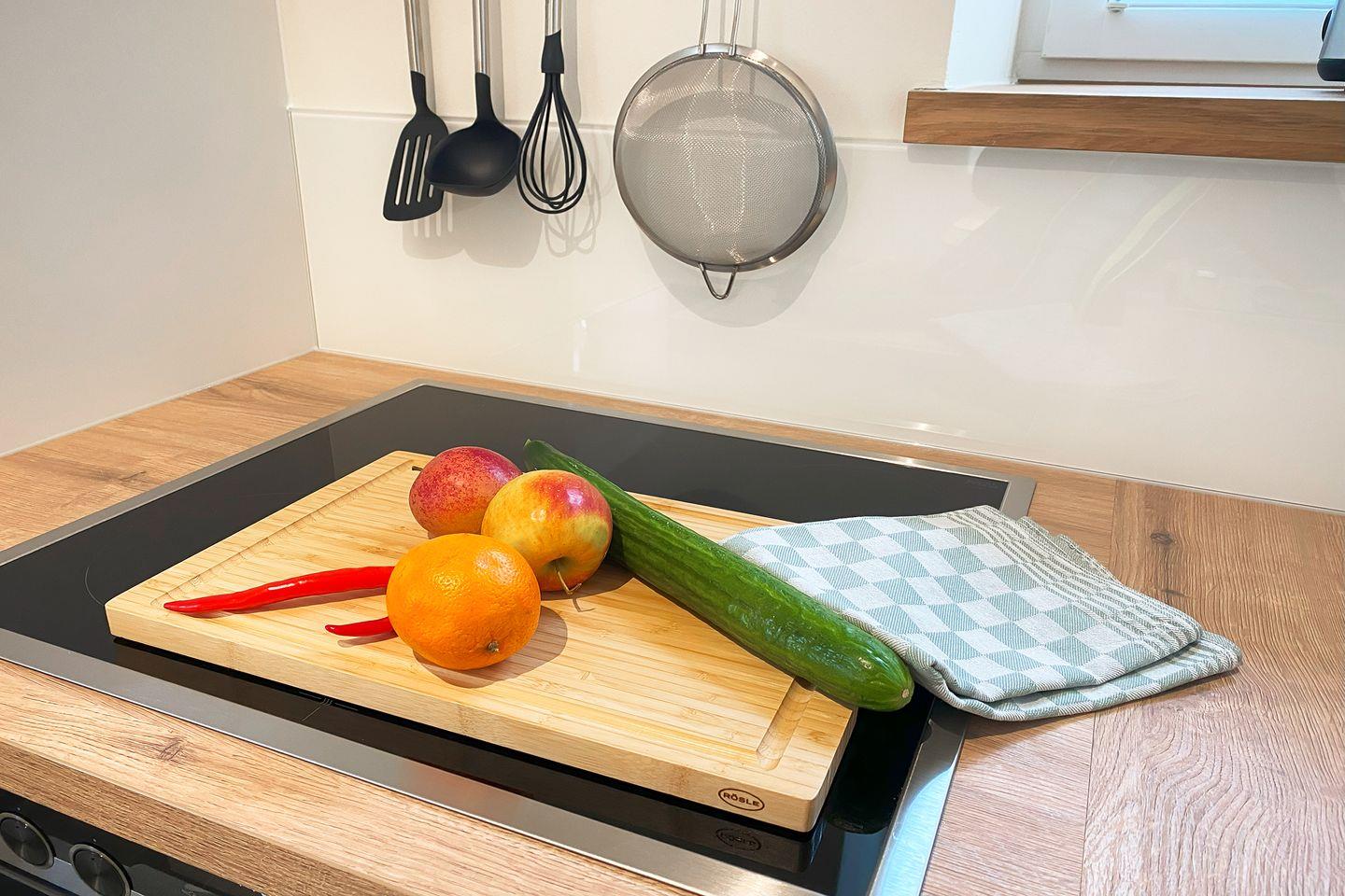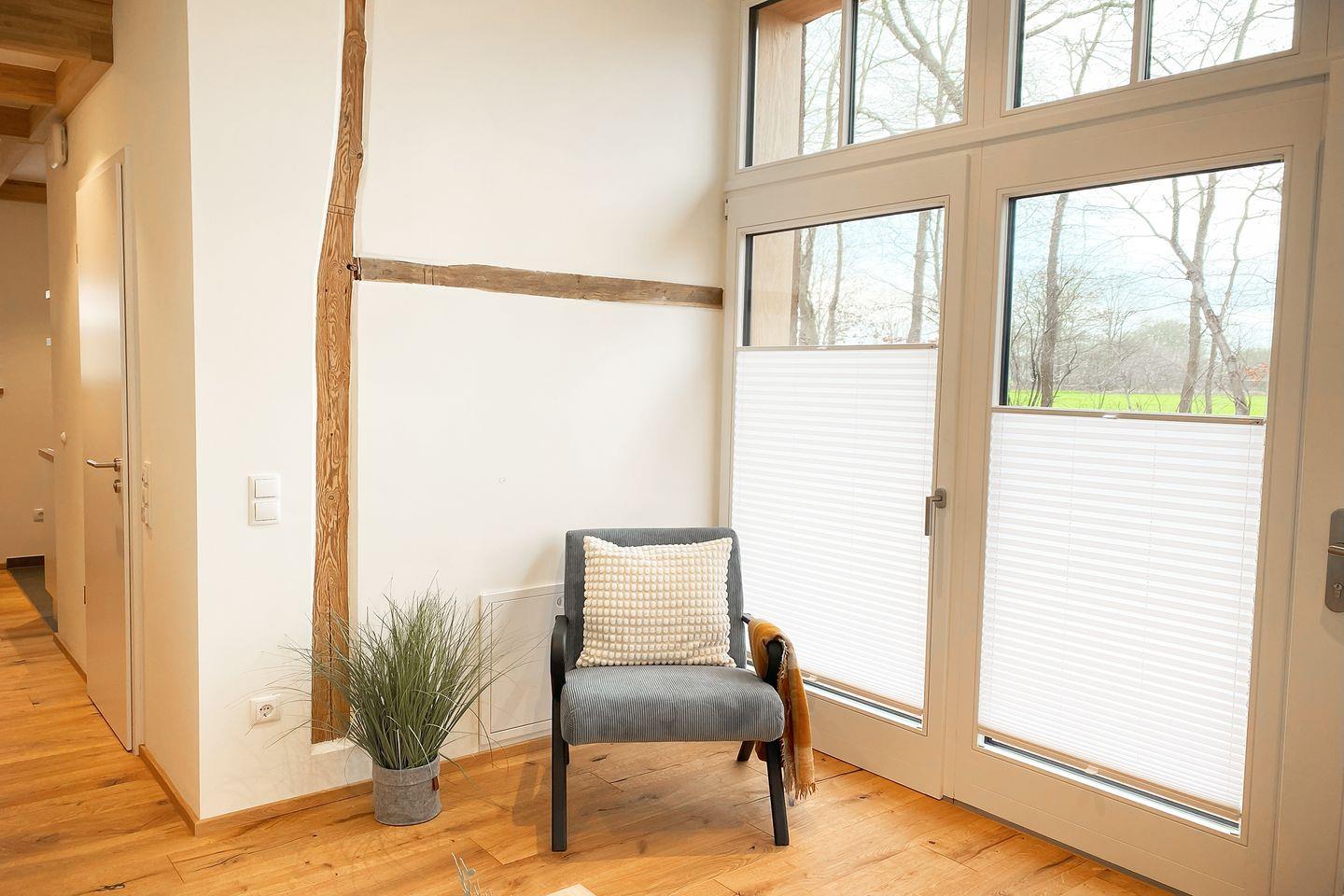 Der offen gestaltete Wohnbereich ist hell und einladend. Besonders schön: die große Terrasse zur Wiese, auf der du völlig ungestört die ländliche Ruhe genießen kannst. Die Küche bietet dir alles, was du für die Zubereitung deiner Mahlzeiten brauchst.