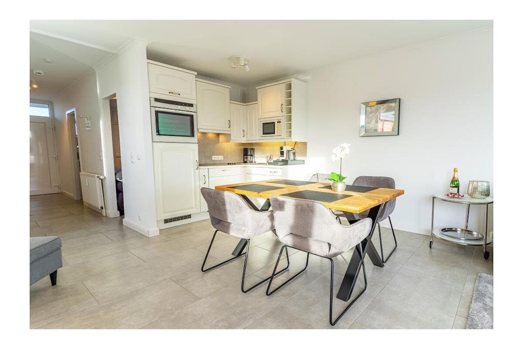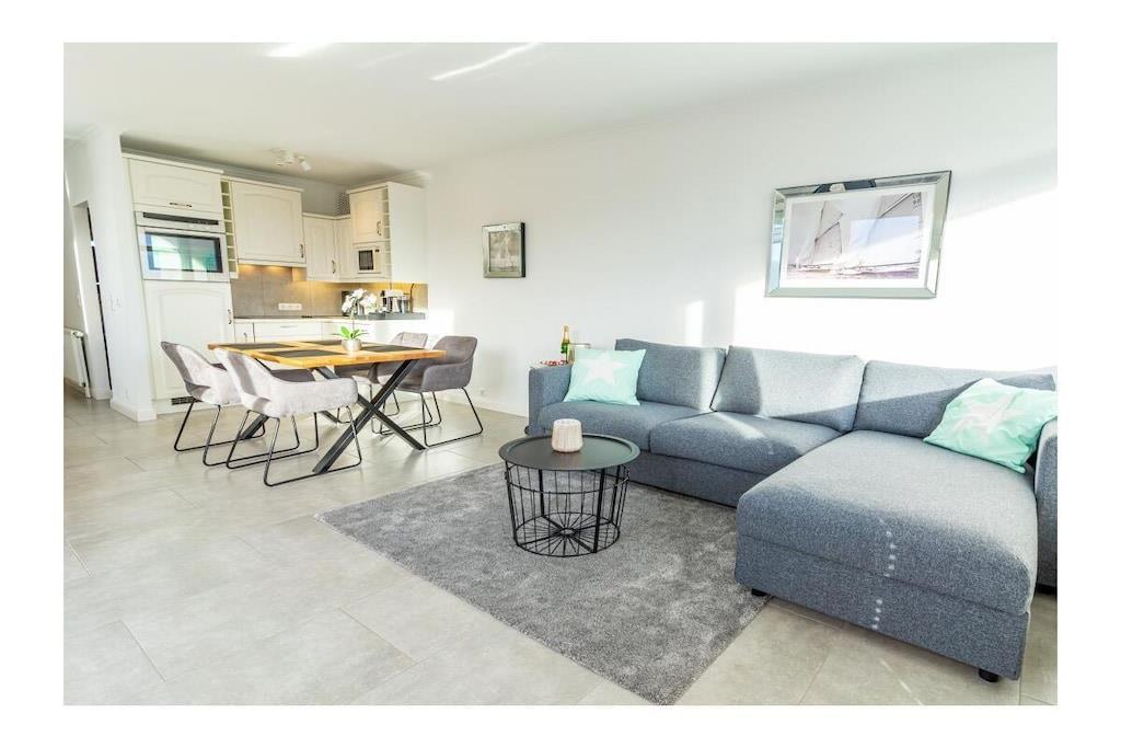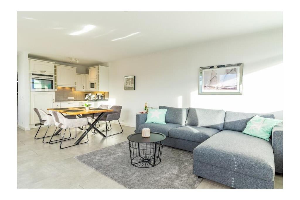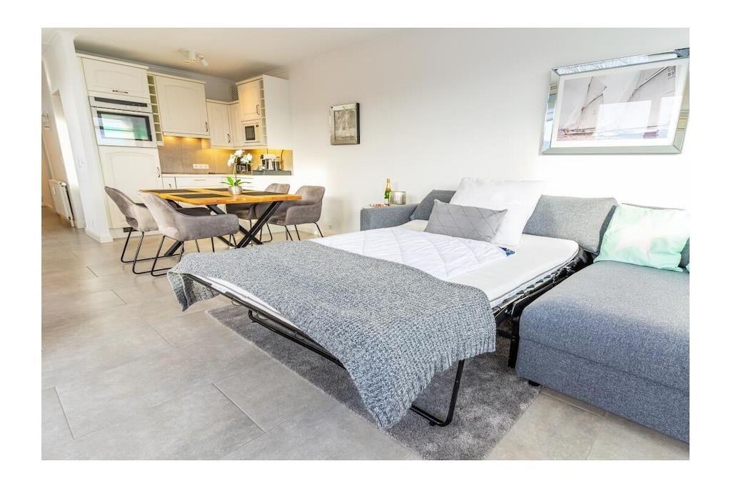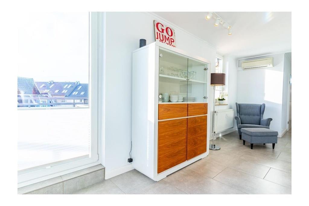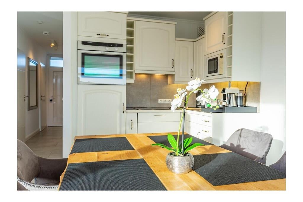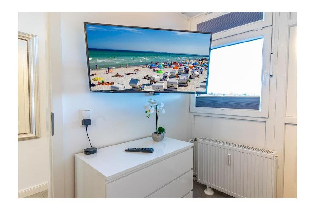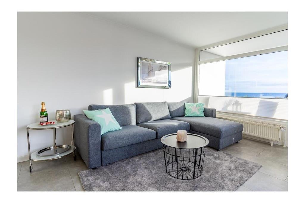 STRANDLAGE; 100% Seeblick / 2 Zimmer-Komfort-App. in bester Strandlage ! Genießen Sie den unvergesslichen Ostseeblick von der schönen Dachterrasse und dem Seeblickbalkon. Einfach ankommen und sich wohlfühlen. Ca. 66qm , W-LAN und Klimaanlage vorhanden. Das Luxus Appartement befindet sich im 4. Geschoss /Lift vorhanden. Wohnraum mit integrierter Einbauküche (Ceranfeld, Geschirrspüler, Mikrowelle, Kühlschrank, Kaffeevollautomat ) und angeschlossenem Essplatz, Fliesenboden, Sofa mit Schlaffunktion (Schlaffunktion für 2 Personen), Couchtisch, großer Flachbild TV mit HD Sender, Sky und Alexa (Radio hören, etc.). Zusätzlich gibt es einen separaten Schlafraum mit Fliesenboden, Kleiderschrank, Boxspring Bett, Alexa (hört auf den Namen ; Echo), Flachbildfernseher , Tresor, Fenster vorhanden. Neues modernes Duschbad mit Duschabtrennung und Fenster, separates WC mit Fenster. Die Wohnung verfügt über W-Lan-Anschluss (bei Störung kein Ersatzanspruch). Auf der 40 qm großen Dachterrasse befindet sich eine Sauna zum entspannen nach einem langen Standspaziergang. (Sauna gegen Gebühr 1 EUR/20 Minuten) Hinter dem Haus gibt es die Möglichkeit Fahrräder abzustellen. Im Außenbereich Für E-Bikes gibt es die Möglichkeit, die Fahrräder auf der Dachterrasse zu laden, um auf die Dachterrasse der Ferienwohnung zu gelangen , müssen sie beachten, das sie das E-Bike zunächst einige Stufen zum Fahrstuhl tragen müssen.