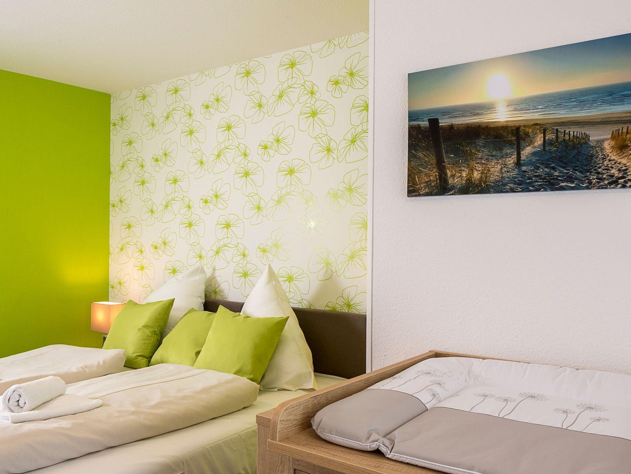 Das erste Schlafzimmer ist mit einem Musterring-Boxspringbett Evolution 180x200, einem Kleiderschrank, einem Flach-TV sowie einer (Wickel-)Kommode HARO und PAIDI ausgestattet, das zweite Schlafzimmer mit zwei Einzelbetten, einem Musterring-Boxspringbett Evolution ( 90x200) und einem Flach-TV.