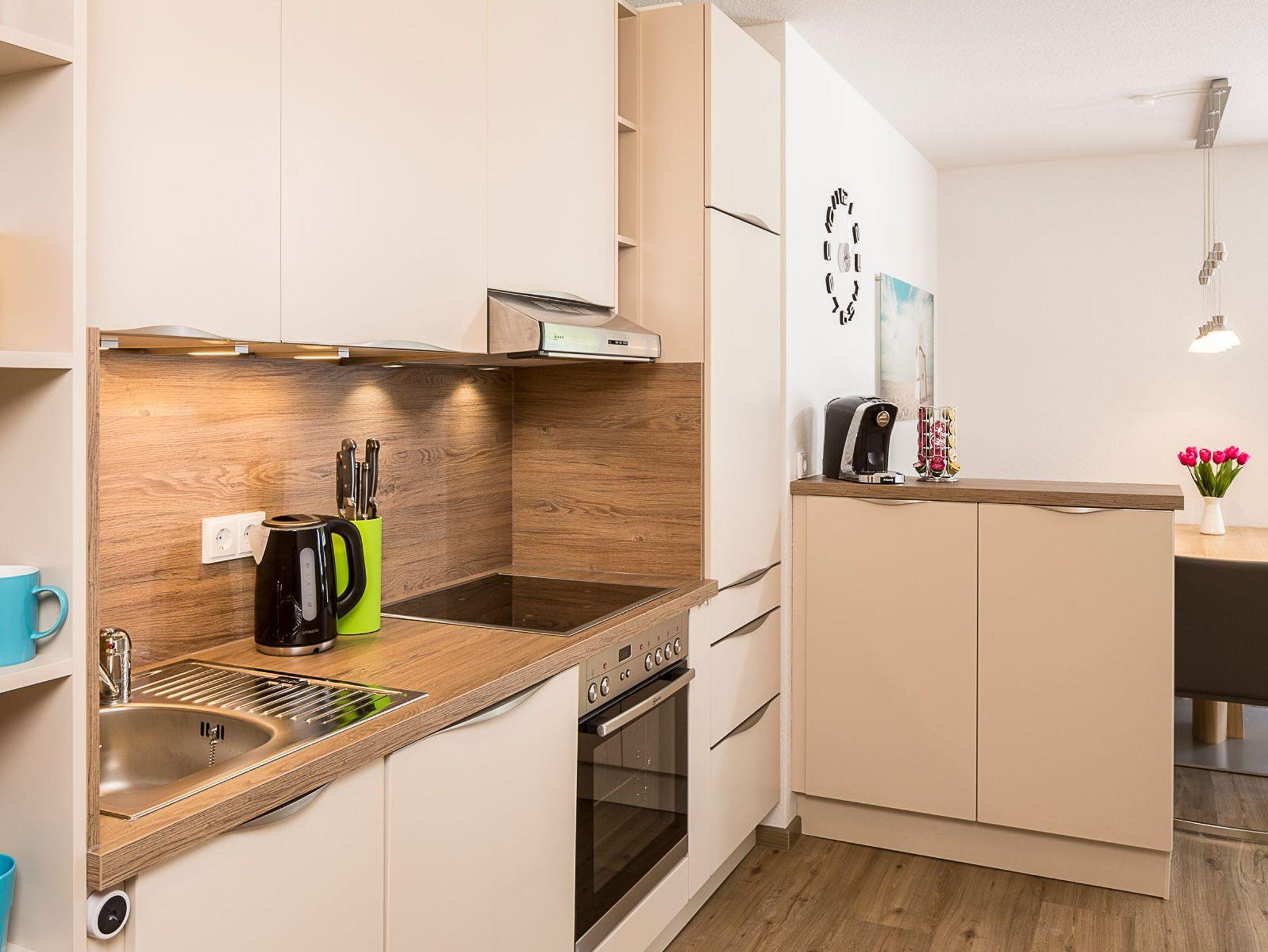 Die Küche ist mit einem Backofen, Kühlschrank mit Gefrierfach, Spülmaschine, Induktionsherd, Mikrowelle, Filter-Kaffeemaschine, Tchibo Cafissimo, Toaster, Wasserkocher, Handrührgerät und mehr ausgestattet.