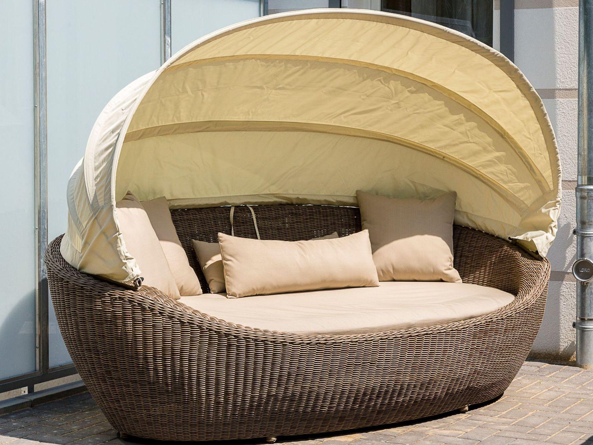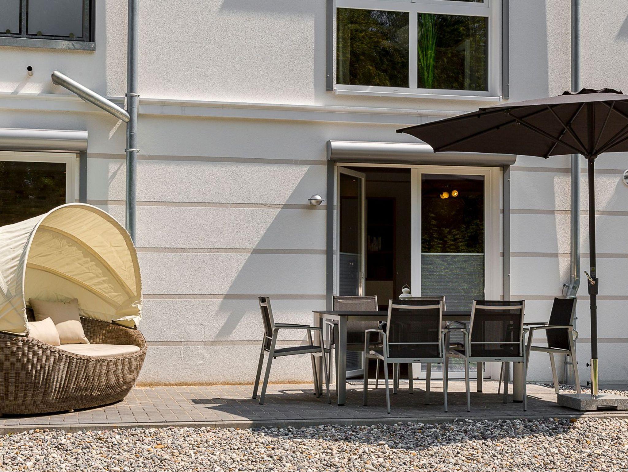Auf der Terrasse stehen für Sie ein Gartentisch mit sechs Stühlen, eine Lounge-Insel Paradiso sowie ein Sonnenschirm zur Verfügung.
