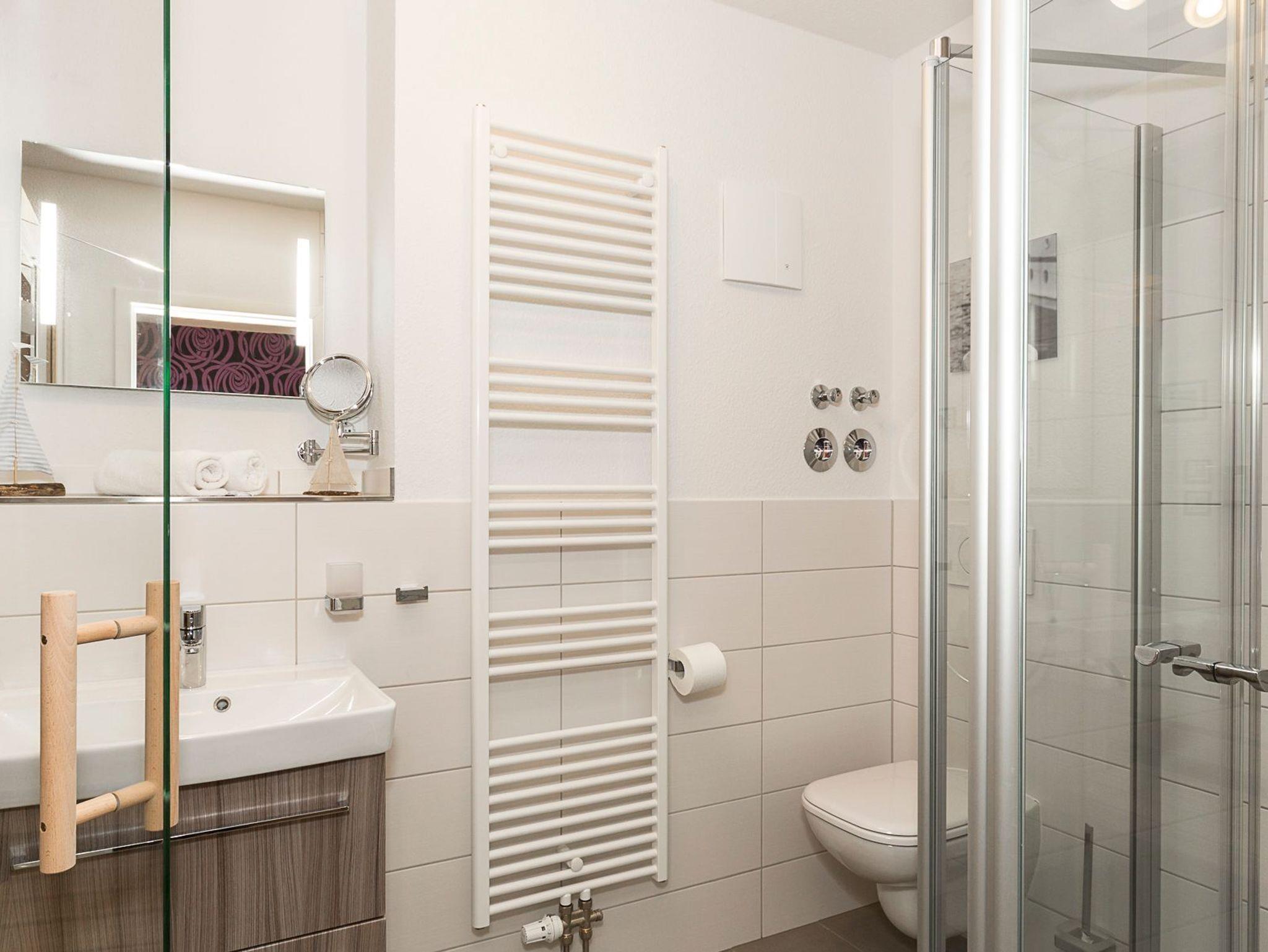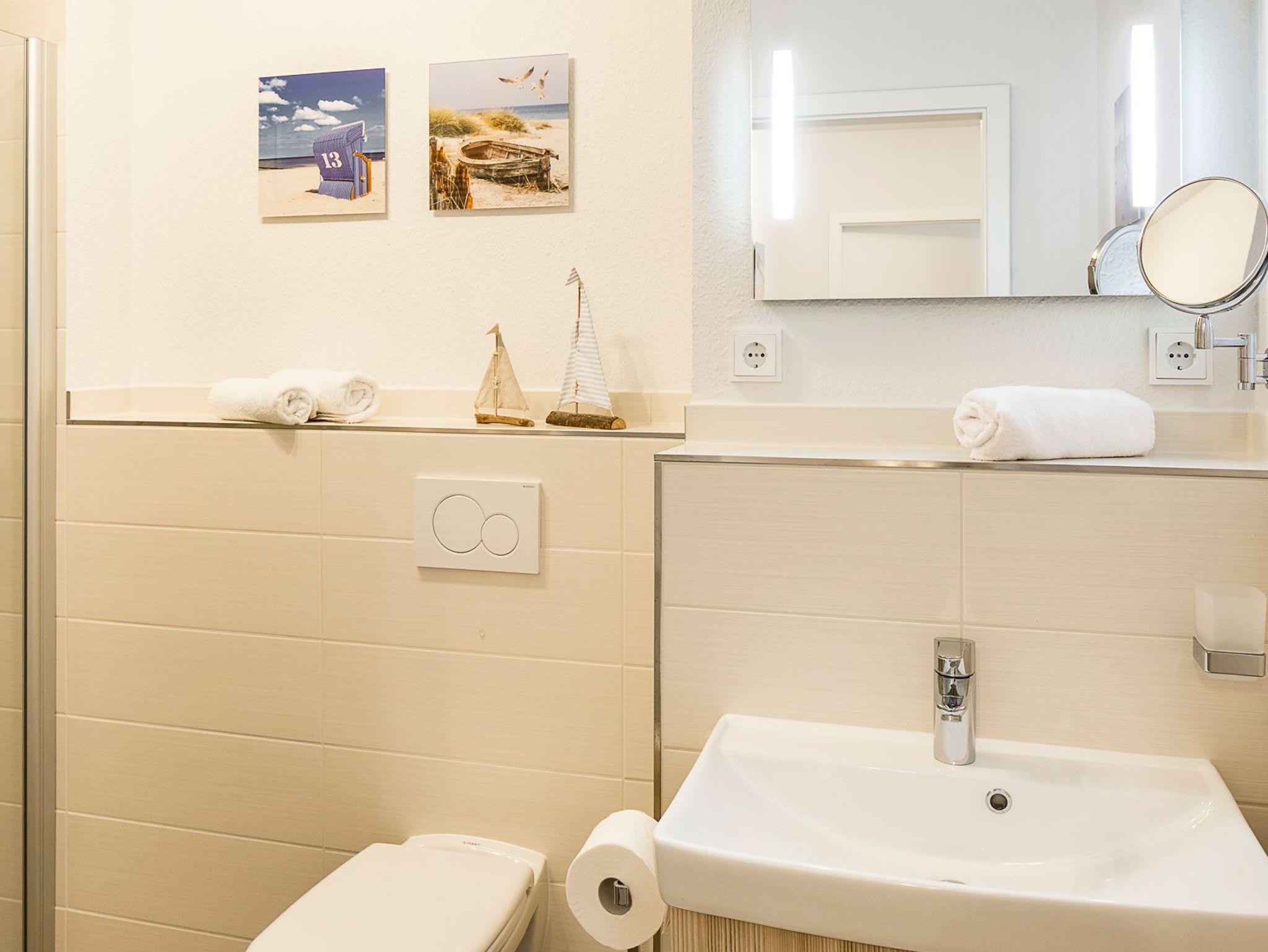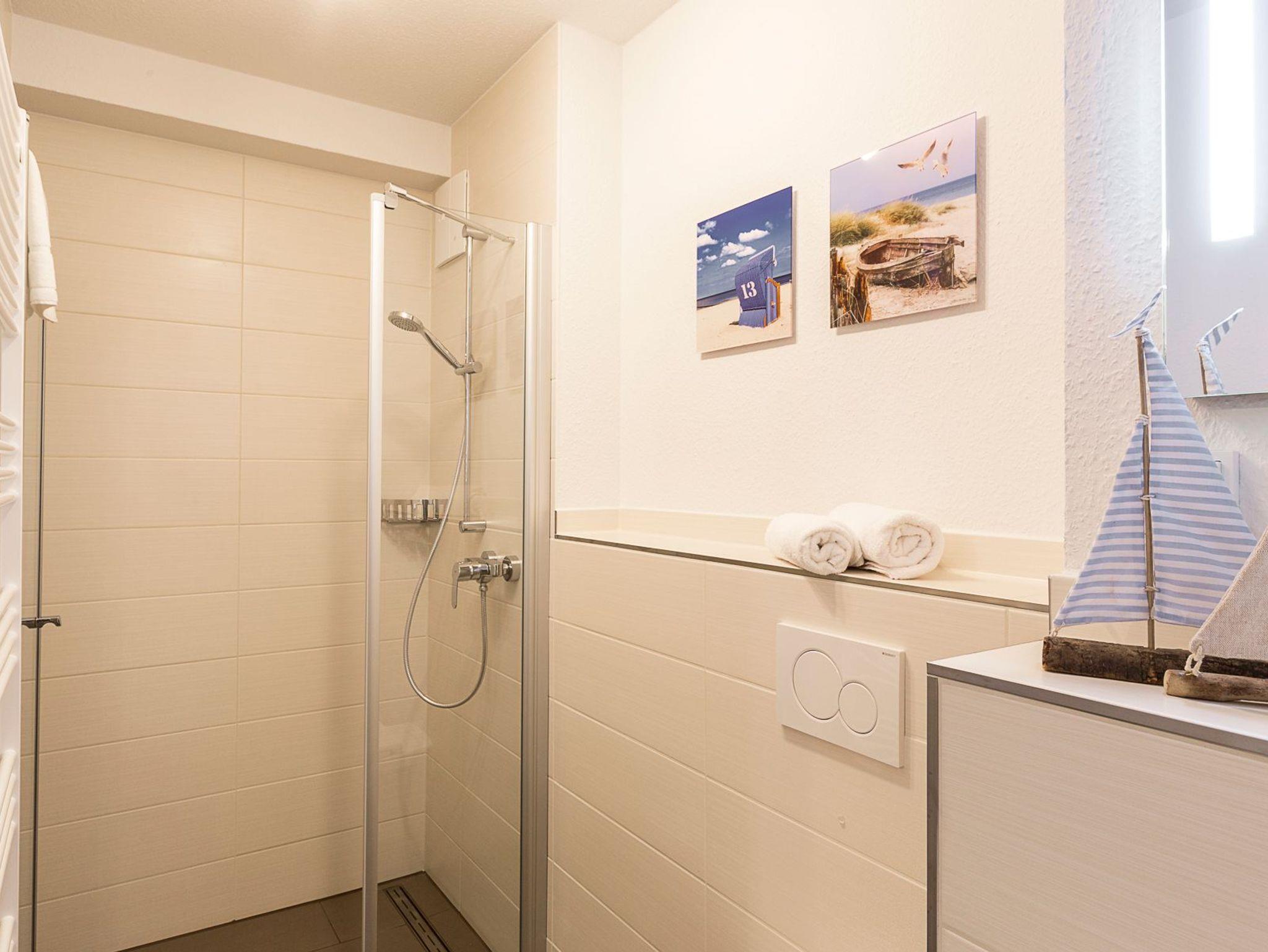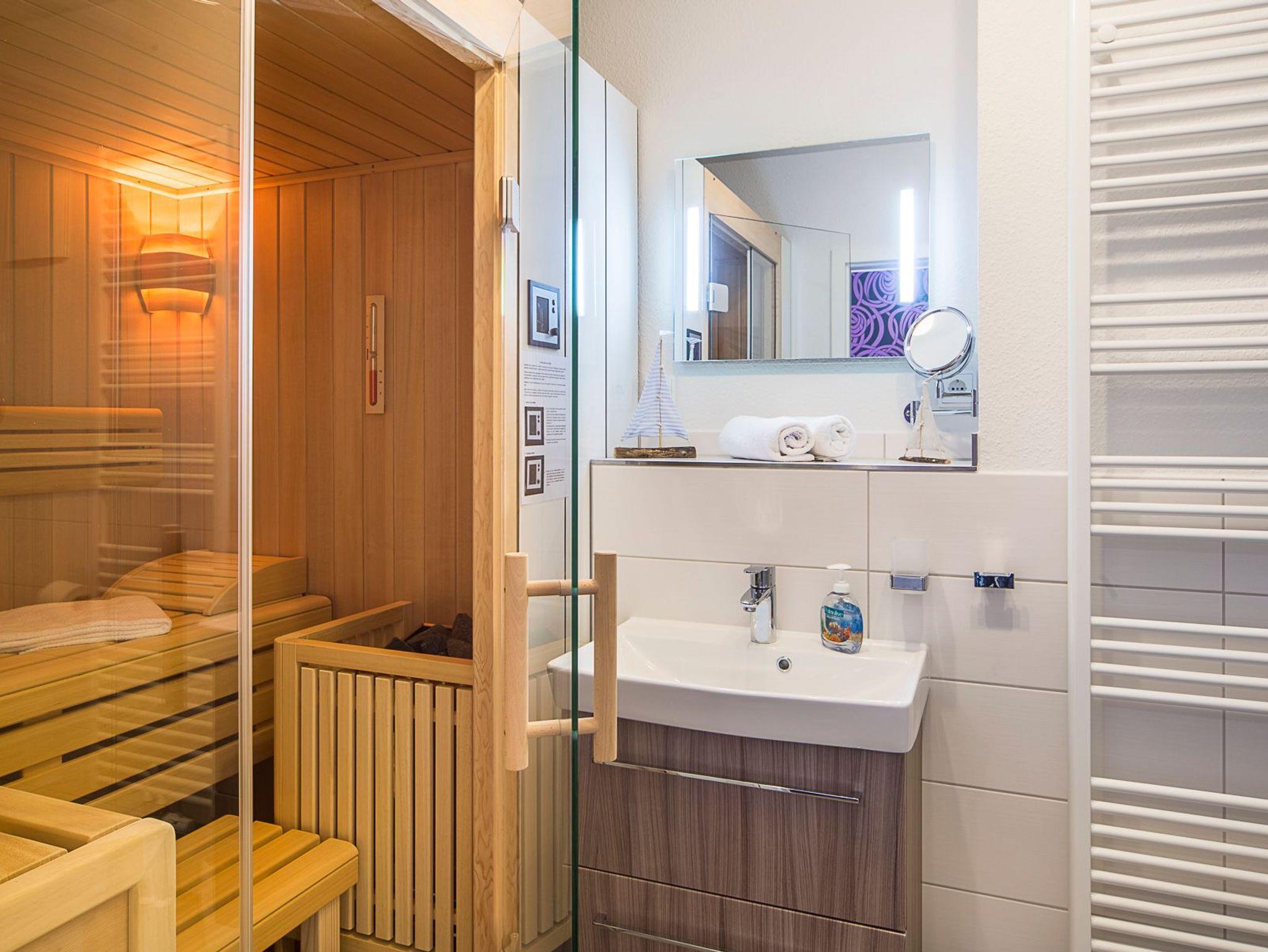Die zwei Bäder: jeweils mit bodengleicher Dusche, Handtuchheizkörper, Föhn und Kosmetikspiegel. Für Saunafreunde ist in einem Badezimmer eine Sauna von RÖGER 180x160 Typ Baleo (keine Dampfbadfunktion).