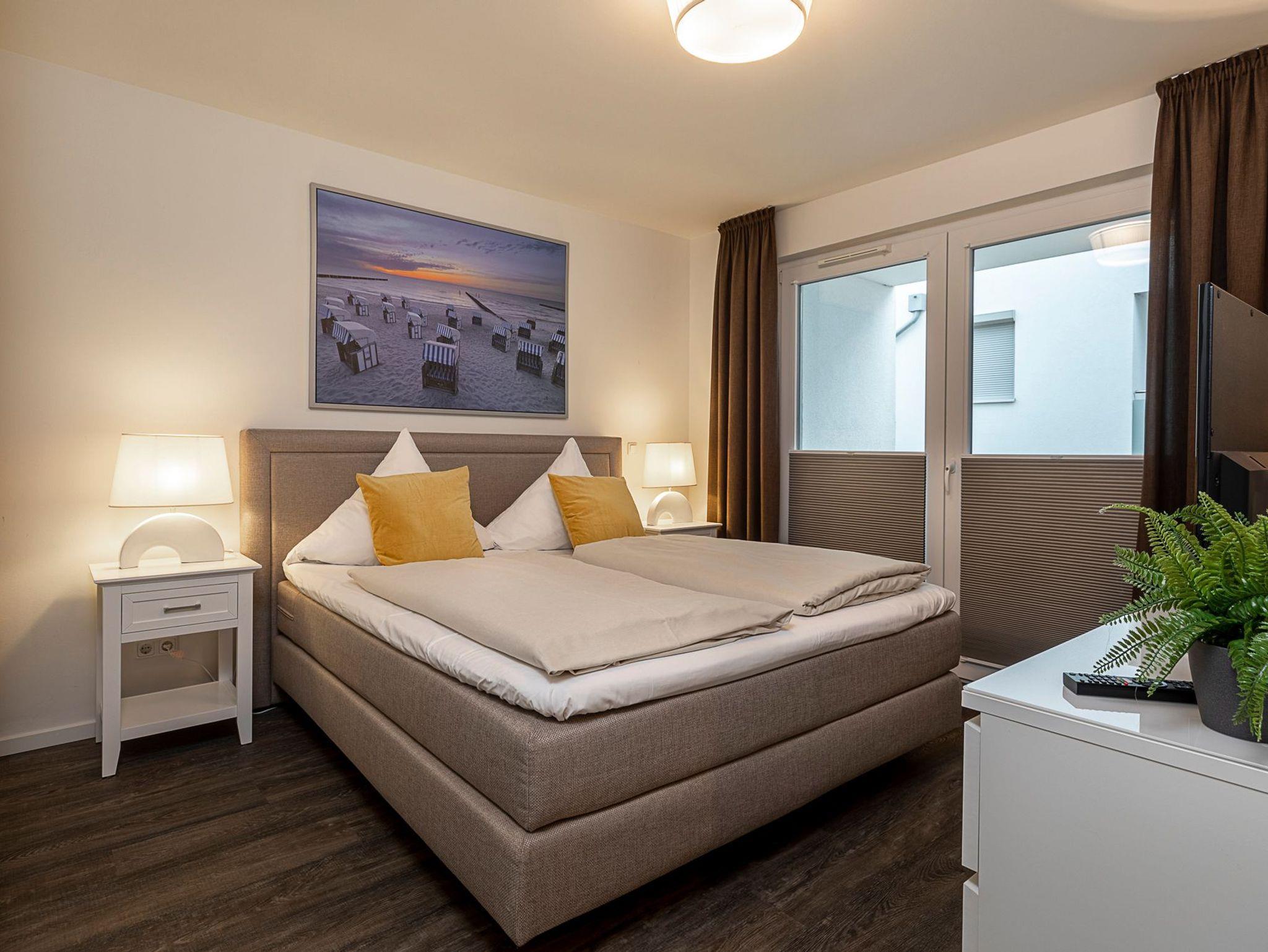 Das Schlafzimmer ist mit einem Kleiderschrank, einem bequemen Bett (2,00 x 1,80m, durchgehender Topper) und einem Flachbildfernseher ausgestattet. Zur Verdunkelung sind Plissees angebracht. Das Badezimmer verfügt über eine bodentiefe Dusche, einen großen Spiegel sowie einen Handtuchheizkörper.