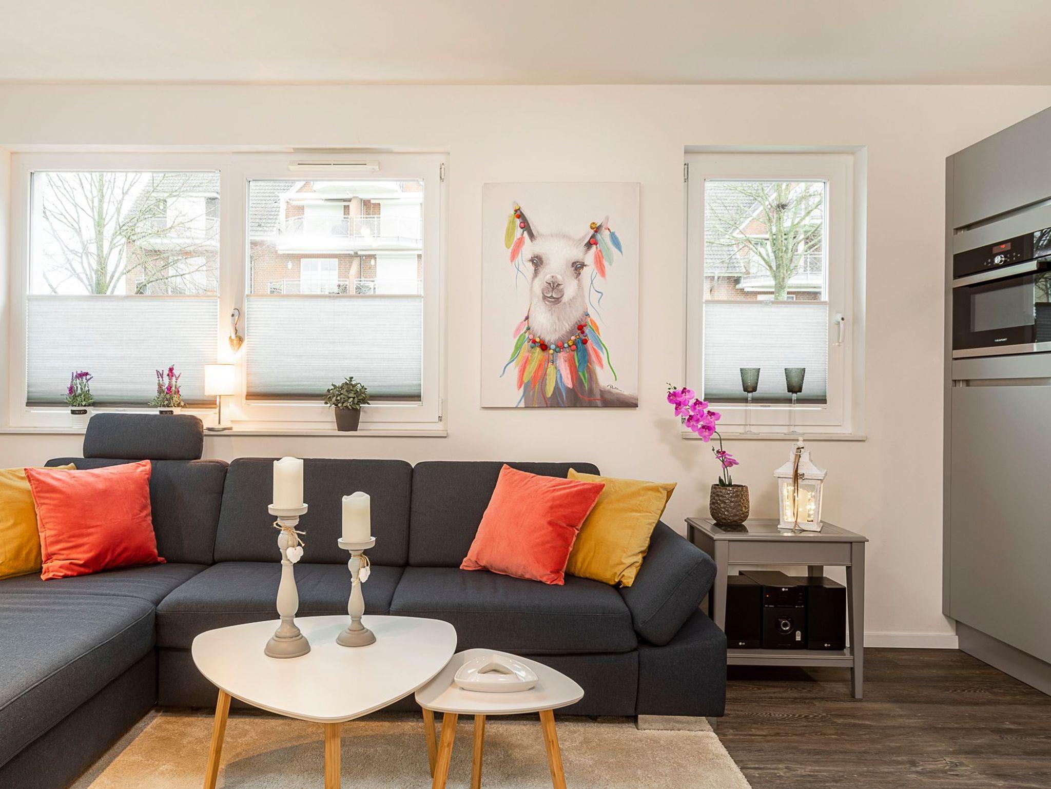 Diese moderne Ferienwohnung hält alles bereit, was für einen schönen Urlaub nötig ist. Herrliches, lichtdurchflutetes Wohnzimmer mit einem bequemen Sofa, das mit wenigen Handgriffen zu einem Schlafsofa umfunktioniert werden kann und einem Wohn-Essbereich. Es stehen hier ein moderner Flach-TV , eine Musikanlage sowie kostenloses WLAN für Sie bereit. Die Terrasse ist mit Tisch und Stühlen ausgestattet. Komplett ausgestattete Küchenzeile mit Pads-Kaffeemaschine, Filter-Kaffeemaschine, Toaster, Wasserkocher, Eierkocher und vieles mehr.
