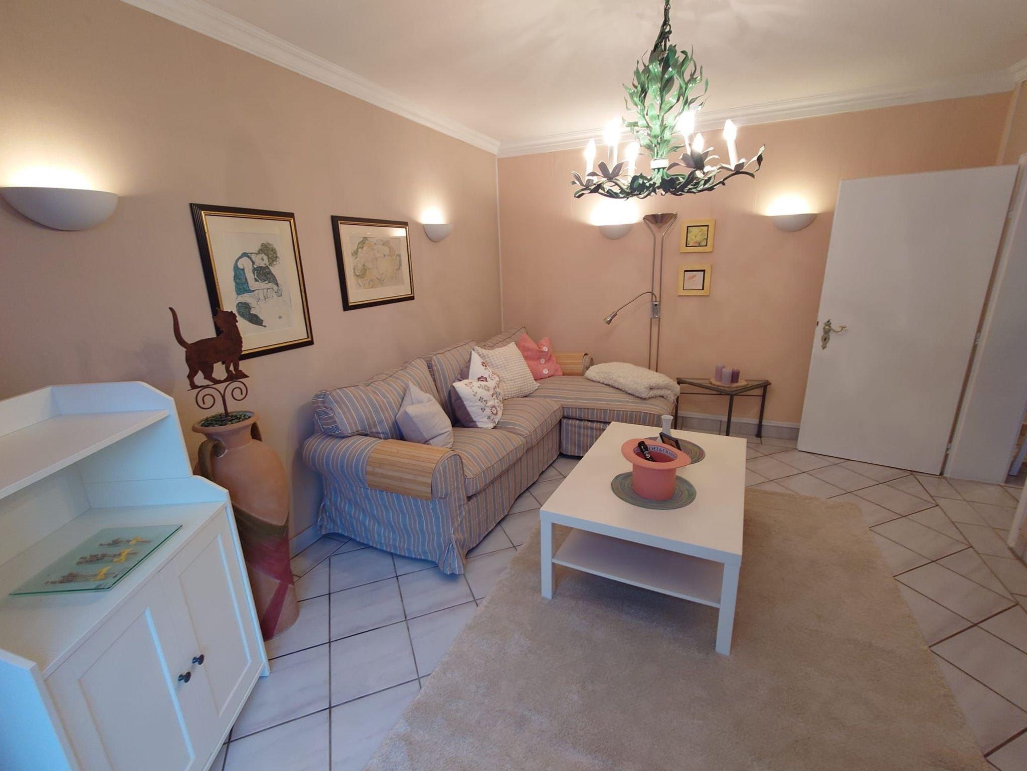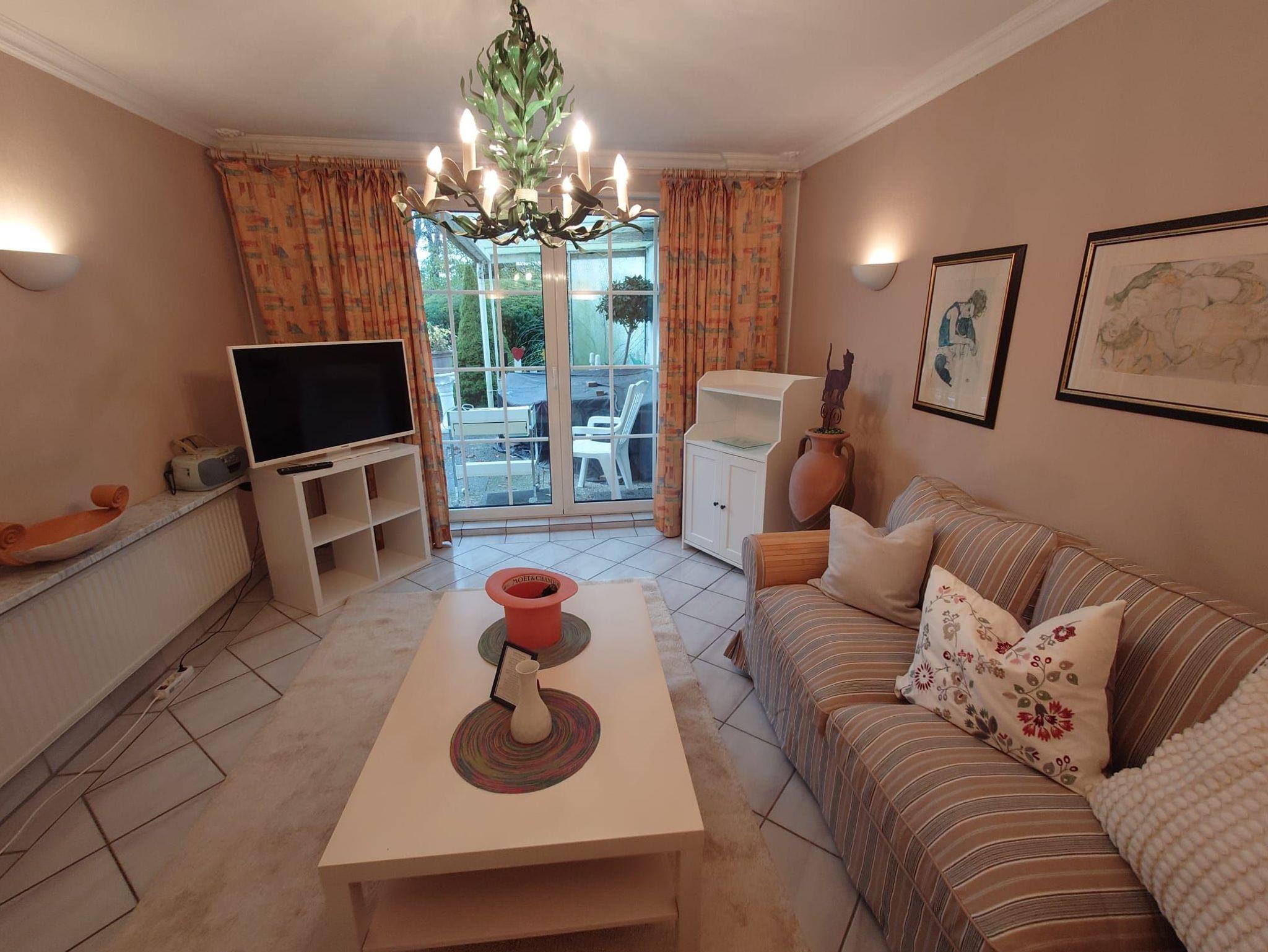 Terrassenwohnung mit Garten: 2 Zimmer, ca. 48 m², inkl. Essdiele mit Küchenzeile. Separate Dusche und WC mit stationärem Schminkspiegel und Fön. Überdachte Freiterrasse vom stilvoll eingerichtetem Wohnzimmer begehbar. Schlafzimmer mit 2 Einzelbetten (Boxspringbetten, Einstiegshöhe: 60 cm) Leselampen und 2 Kleiderschränke. Ganzkörperspiegel und Sitzgruppe. Holzofen-Gartengrill, Mikrowelle.