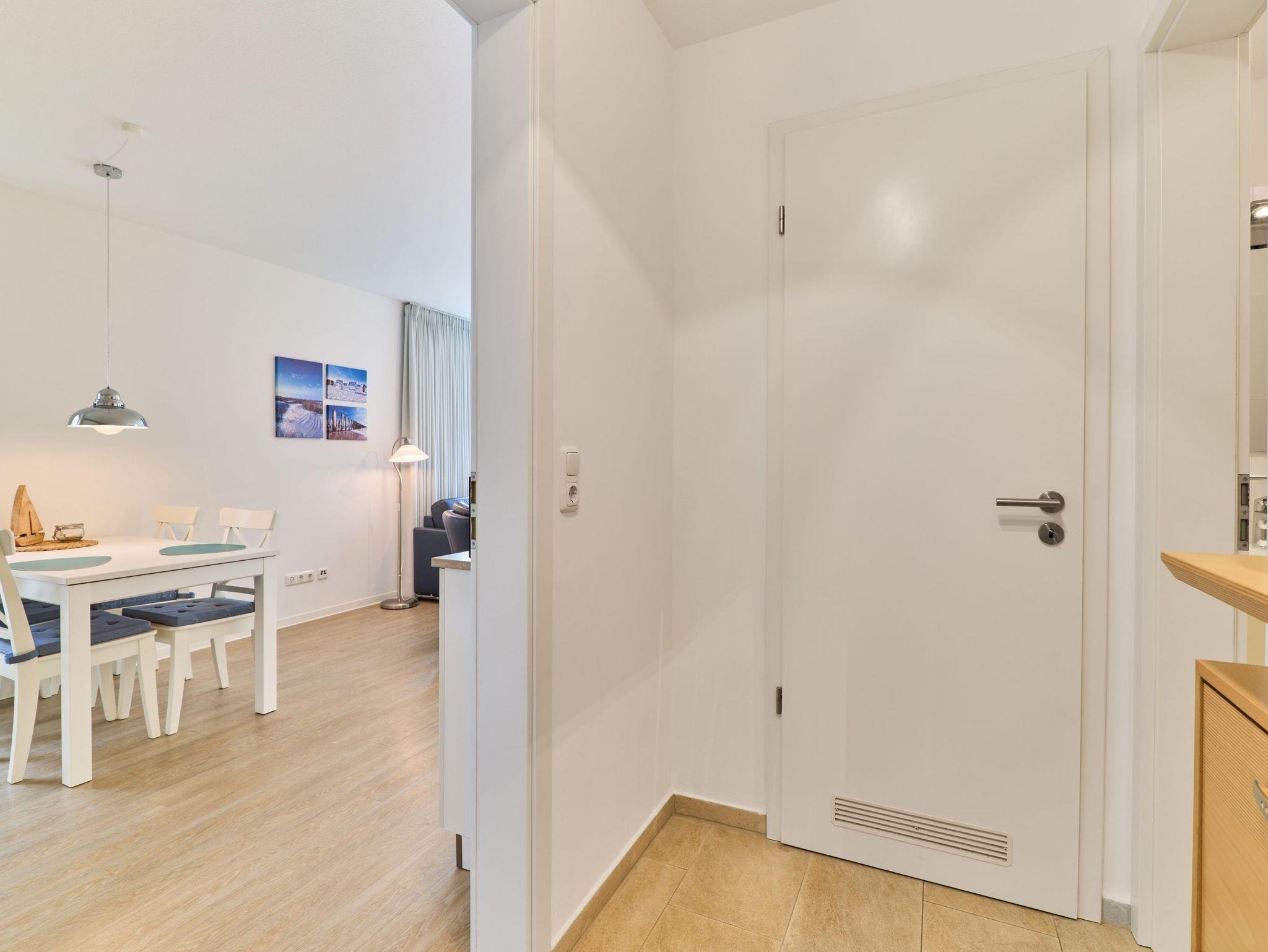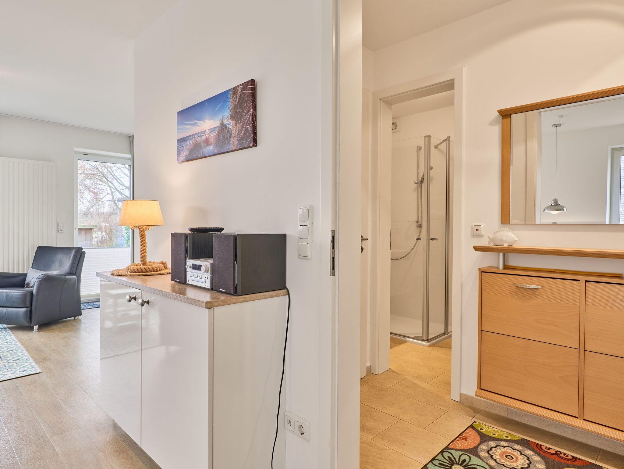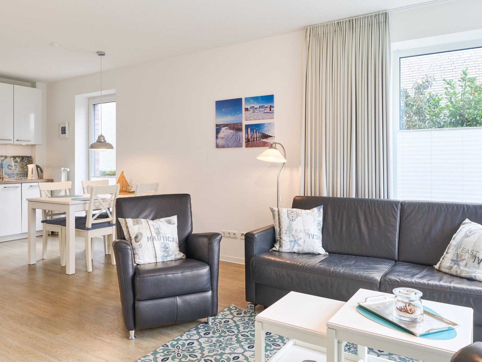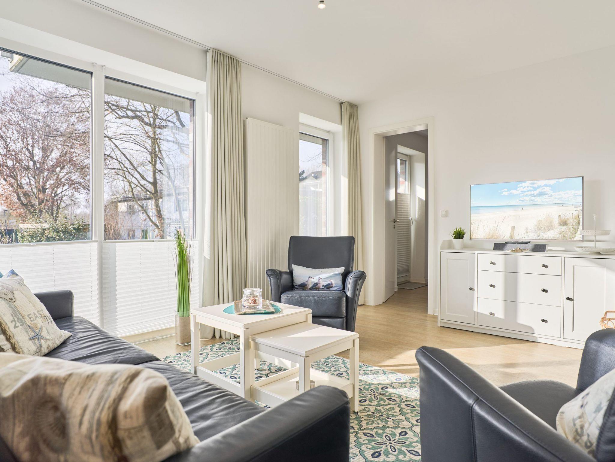 Die gut geschnittene sonnige Ferienwohnung mit bodentiefen Fenstern in Wohn- und Schlafzimmer liegt im Erdgeschoss und verfügt über eine große, sonnige Südwest-Terrasse mit Blick ins Grüne. Die kleine komfortable Wohnanlage ist in direkter Lage am Dünengürtel, dem feinsandigen Ostseestrand und der Dünenmeile mit ihren schönen Cafés, Restaurants und Geschäften. Nur wenige Meter sind es zum Strandübergang mit saisonal vom DLRG bewachten Strandabschnitt.