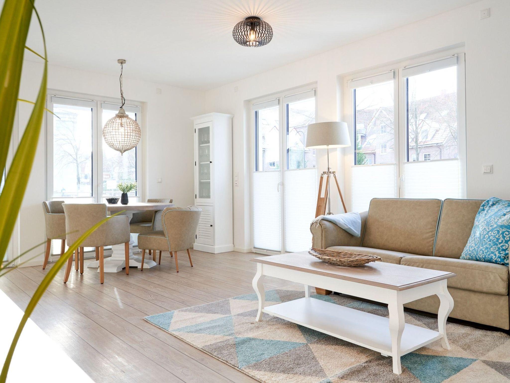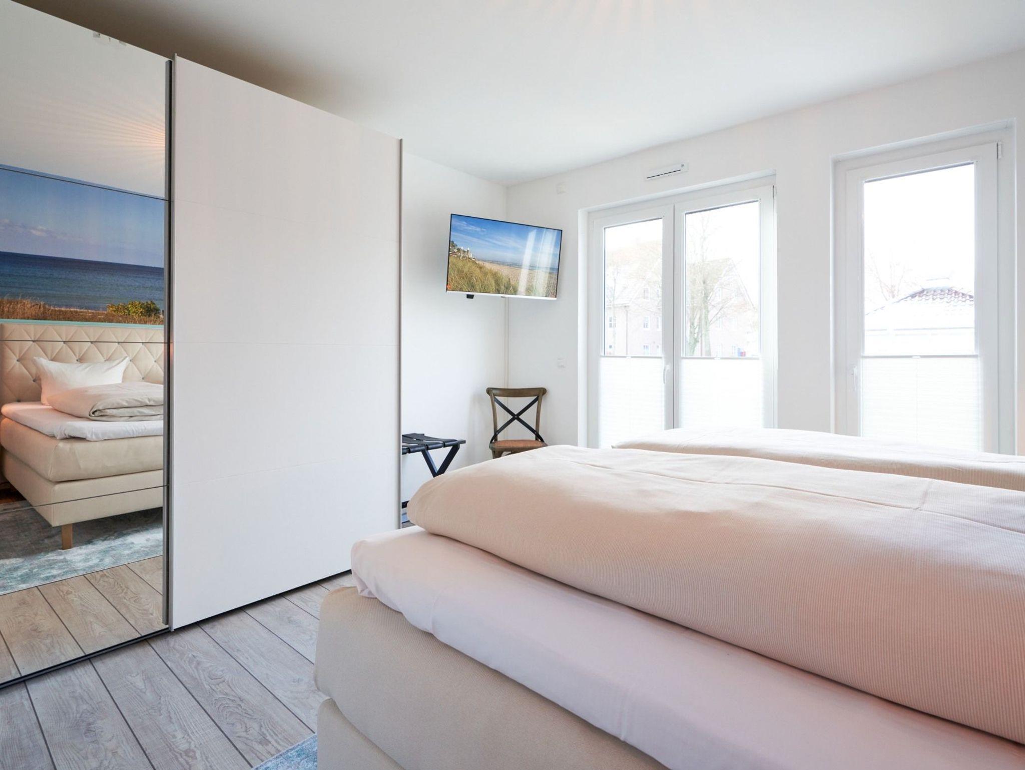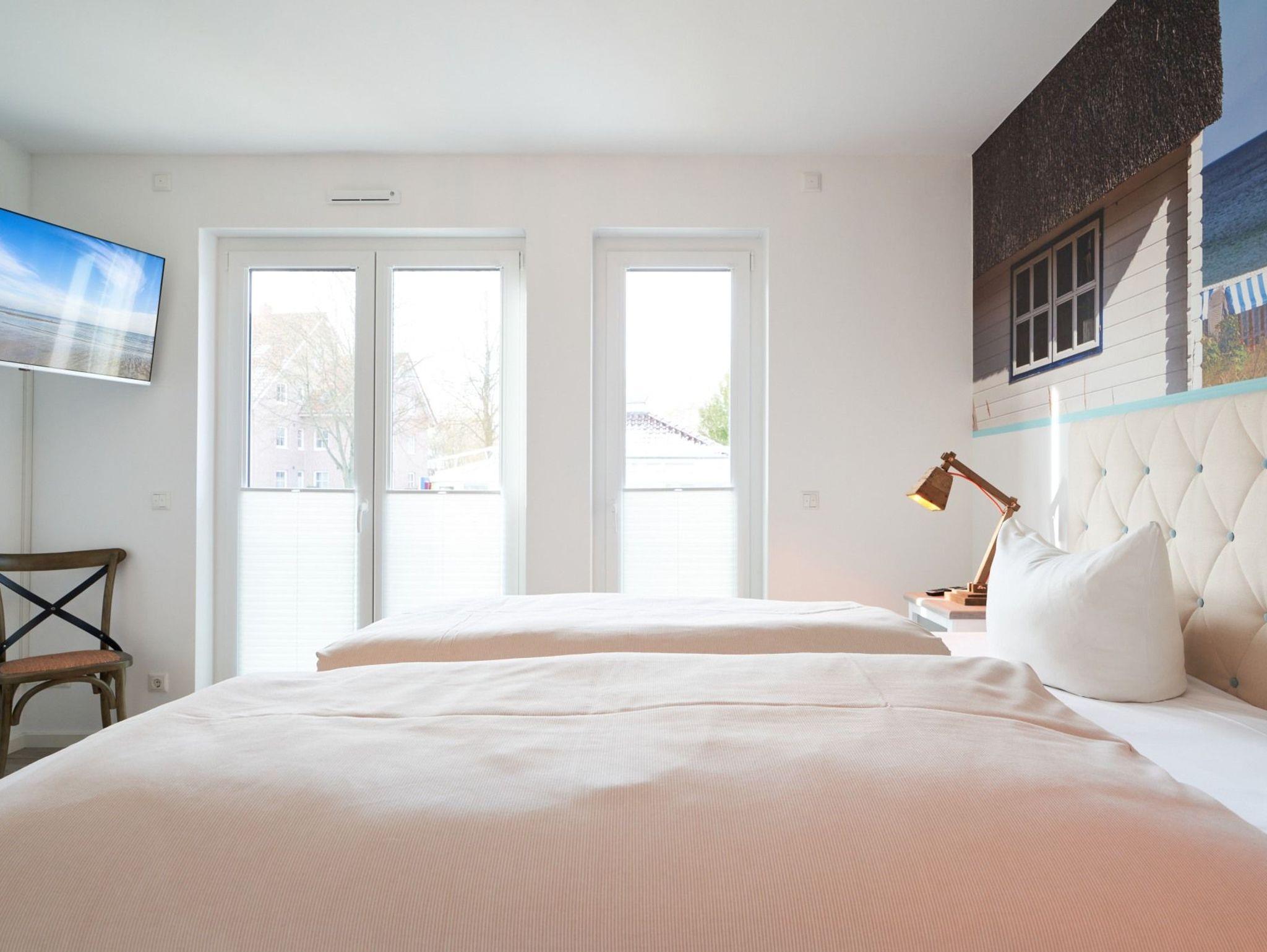 Die 2-Zimmer-Ferienwohnung LEE ist mit bodentiefen Fenstern ausgestattet. An allen Fenstern befindet sich ein Sichtschutz. Die Einbauküche ist komplett ausgestattet. Backofen, Ceran-Kochfeld, Mikrowelle, Geschirrspüler, Kühlschrank mit Gefrierfach, Filterkaffeemaschine, Tassimo-Kapselmaschine, Eierkocher, Mixer, Toaster und Wasserkocher. Sehr schöner, heller Wohnbereich mit einem hochwertigen Sofa, welches mit kurzen Handgriffen in ein bequemes Schlafsofa ( 1,30m x 1,95m) hergerichtet werden kann. [nbsp] Wand-TV ( 55 Zoll ), Internetradio . Der feine Essbereich ist mit einem runden Tisch und mit vier bequemen Sesseln ausgestattet. [nbsp] Aus dem Wohnbereich gelangen Sie auf den herrlichen, überdachten Süd-West-Balkon. Hier stehen Ihnen Tisch und Stühle zur Verfügung. Das Schlafzimmer ist mit einem Boxspringbett (2,00 m x 2,00 m), einem Kleiderschrank, 2 Nachttischen sowie einem Wand-TV (43 Zoll) ausgestattet. Sind Sie es gewohnt, im Dunkeln zu schlafen? Kein Problem, denn im Schlafzimmer stehen Ihnen elektrische Außenrollläden zur Verfügung. Das Duschbad in heller Optik mit bodengleicher Dusche / Regendusche, mit separater Handbrause, Handtuchheizkörper, Fön, Kosmetikspiegel. Die gesamte Wohnung ist mit einer Fußbodenheizung ausgestattet.
