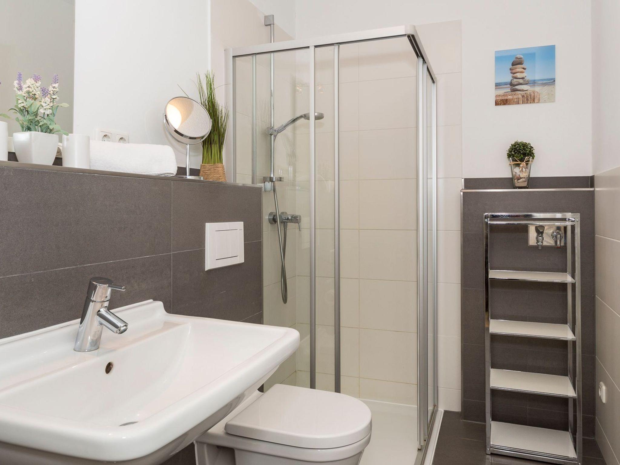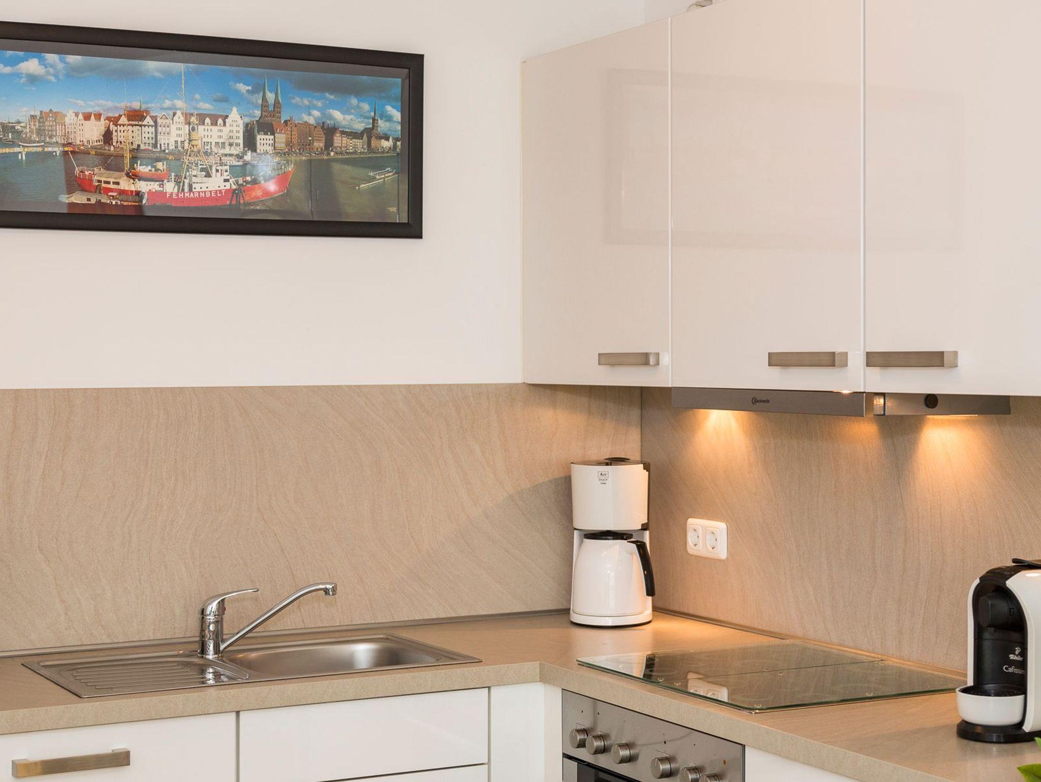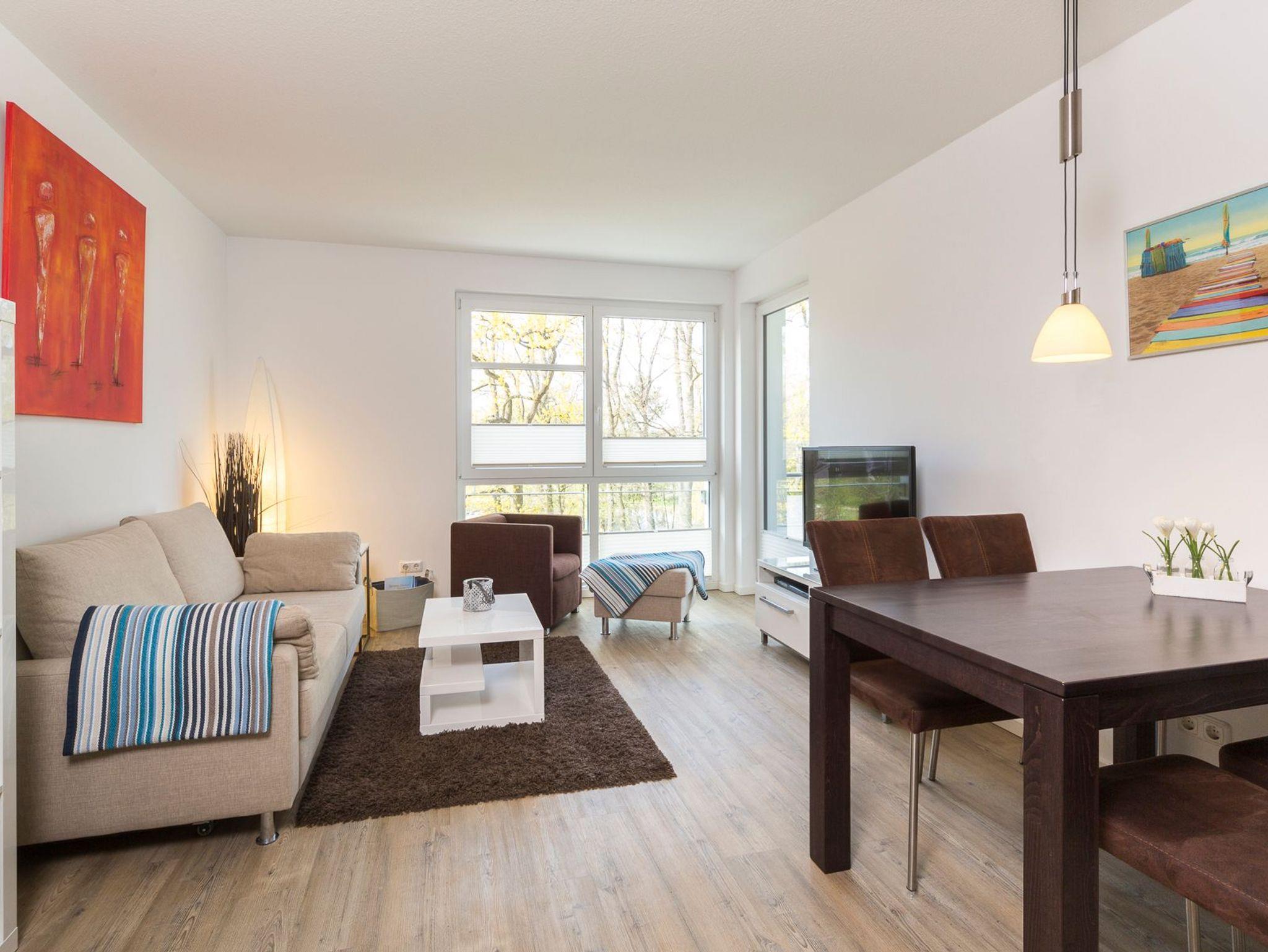 Der Wohn-Essbereich mit bodentiefen Fenstern ist mit einem Esstisch und einer gemütlichen Couch ausgestattet. Mit nur wenigen Handgriffen lässt sich diese in eine Schlafcouch verwandeln. Neben einem Smart-TV und DAB-Radio steht Ihnen selbstverständlich kostenloses WLAN zur Verfügung. Der überdachte Balkon mit Blick in den Kurpark ist mit einem Tisch und Stühlen ausgestattet. Die moderne Küche lässt keine Wünsche offen. Im Schlafzimmer befinden sich ein bequemes Doppelbett (1,80 x 2,00m, Einzelmatratzen) sowie ein geräumiger Kleiderschrank. Das Badezimmer verfügt über eine bodentiefe Dusche. Neben der Fußbodenheizung ist hier ein zusätzlicher Handtuchheizkörper angebracht.