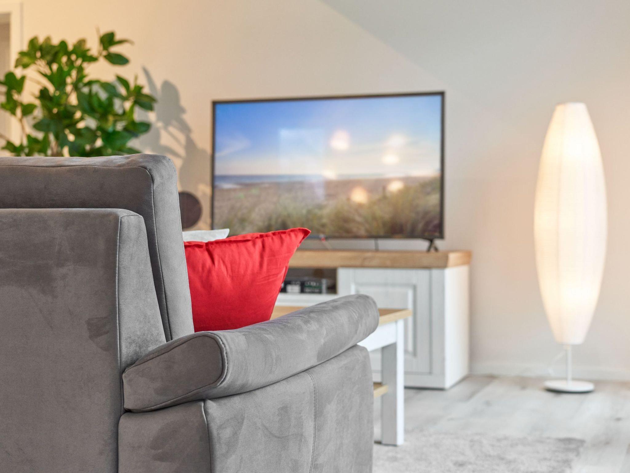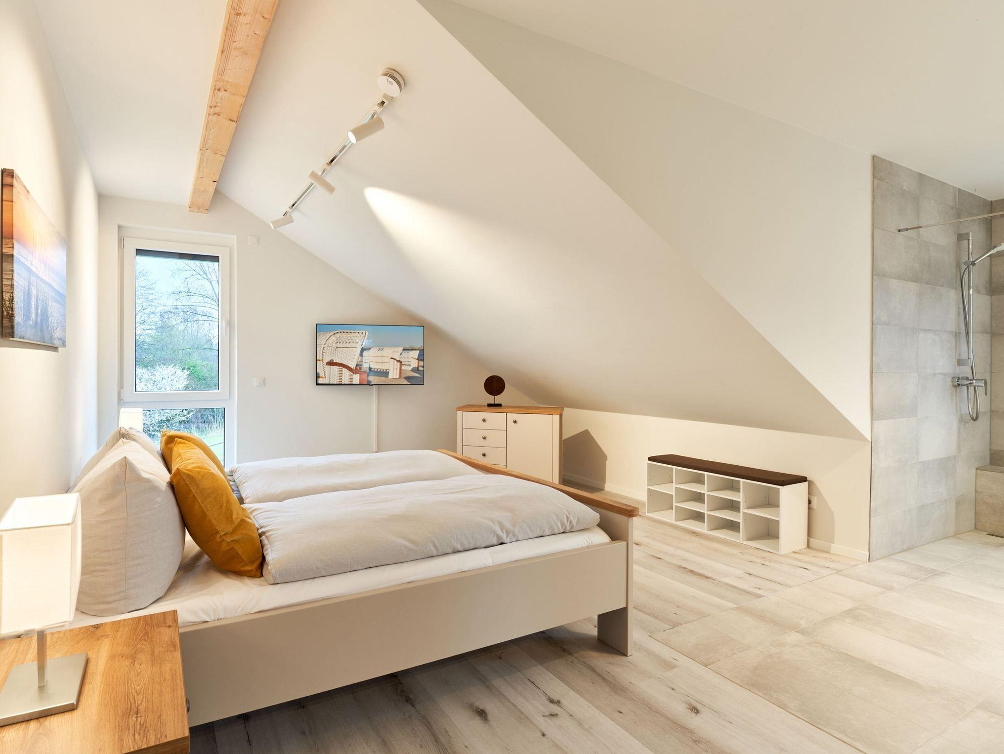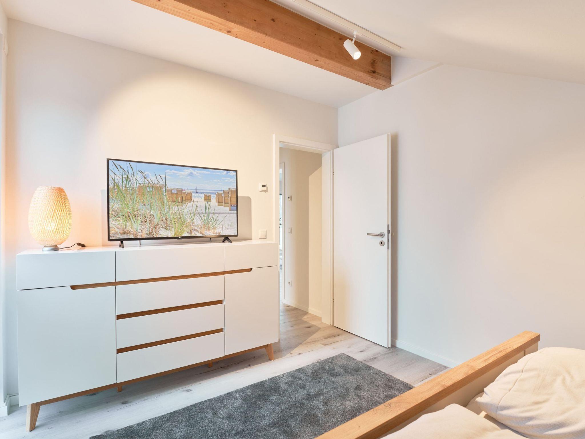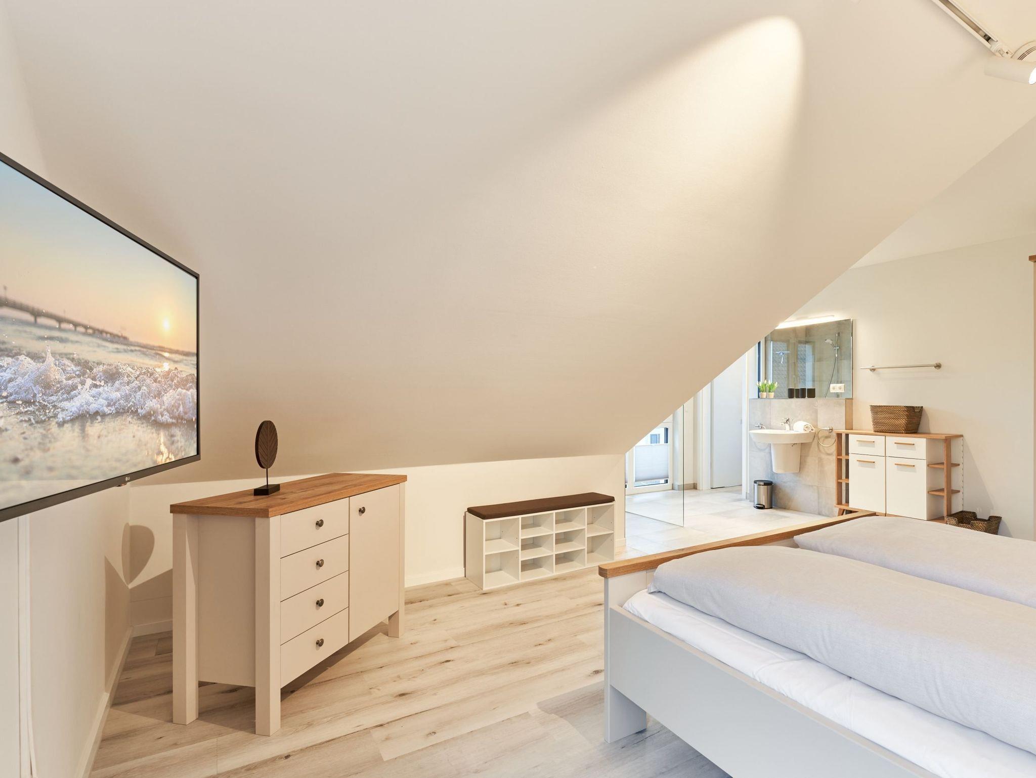 Das zweite Schlafzimmer hat ebenfalls ein Doppelbett mit Einzelmatratzen und verstellbarem Kopf- und Fußteil. Ein Smart-TV ist auch hier vorhanden. Das zweite Tageslichtbad ist mit einer bodengleichen Dusche ausgestattet.