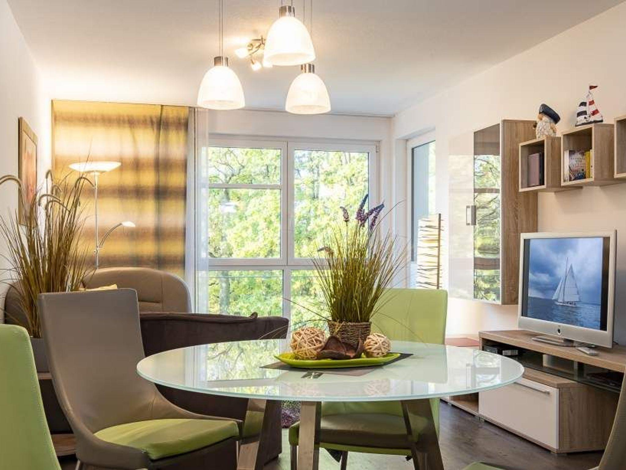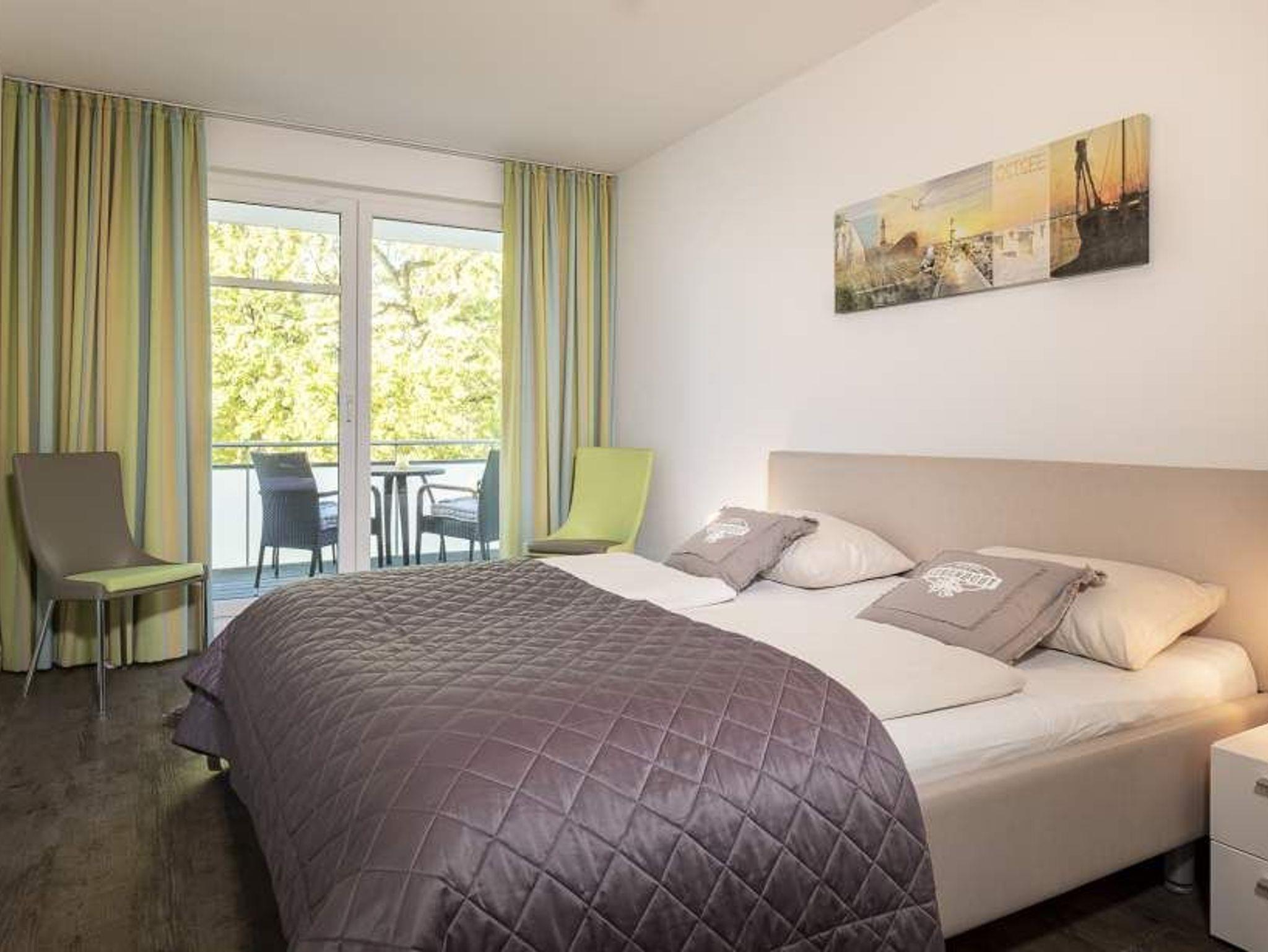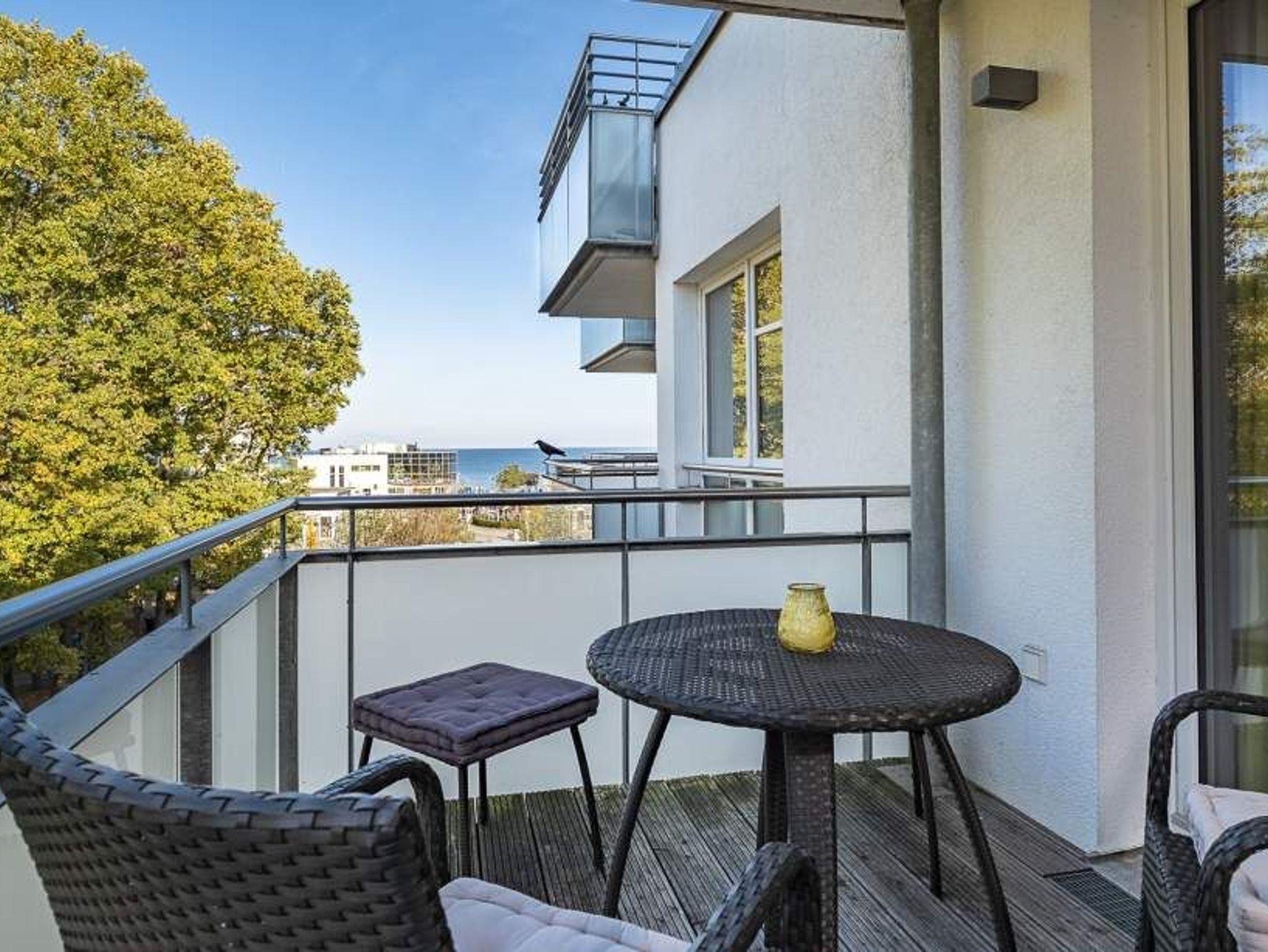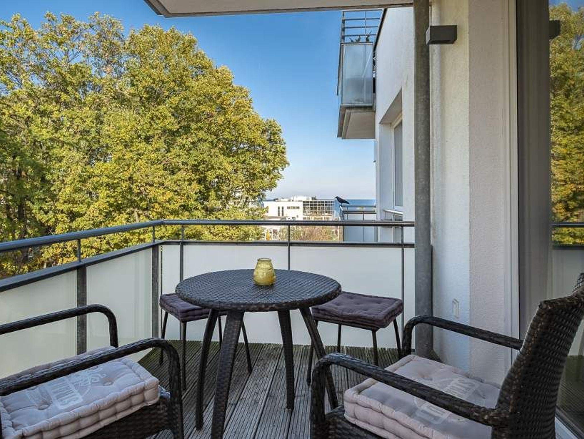 Der helle Wohnbereich mit bodentiefen Fenstern bietet einen Essplatz für 4 Personen, ein gemütliches Sofa, das sich mit wenigen Handgriffen in eine Schlafcouch (1,70 x 2,00m) verwandeln lässt, einen Flachbild-TV, WLAN, eine iPod-Dockingstation, einen Blue-Ray-Player, eine Stereoanlage und einen Safe. Die voll ausgestattete Küche lässt keine Wünsche offen. Vom Balkon aus hat man einen seitlichen Blick aufs Meer und die Aussicht in den Kurpark. Ein komfortables Doppelbett (1,80 m x 2,00 m) sorgt im Schlafzimmer für eine erholsame Nachtruhe. Hier finden Sie den zweiten Flachbild-TV. Im Badezimmer mit bodengleicher Dusche ist auch die Waschmaschine untergebracht. Die Wohnung liegt direkt gegenüber dem Kurpark, nur wenige Schritte von der Fußgängerzone und der Ostsee entfernt. Sie verfügt über einen Safe und einen abschließbaren Fahrradkeller.