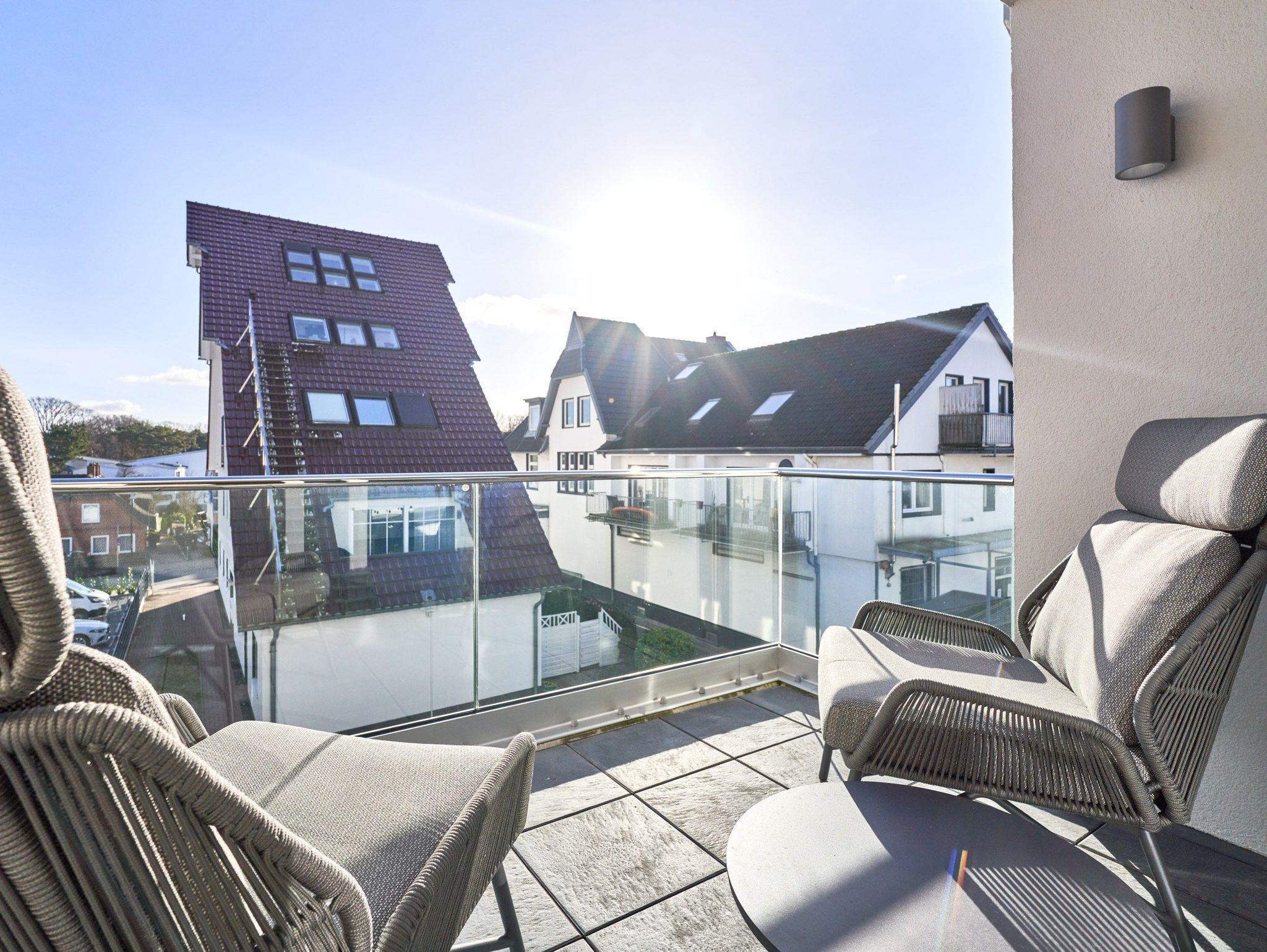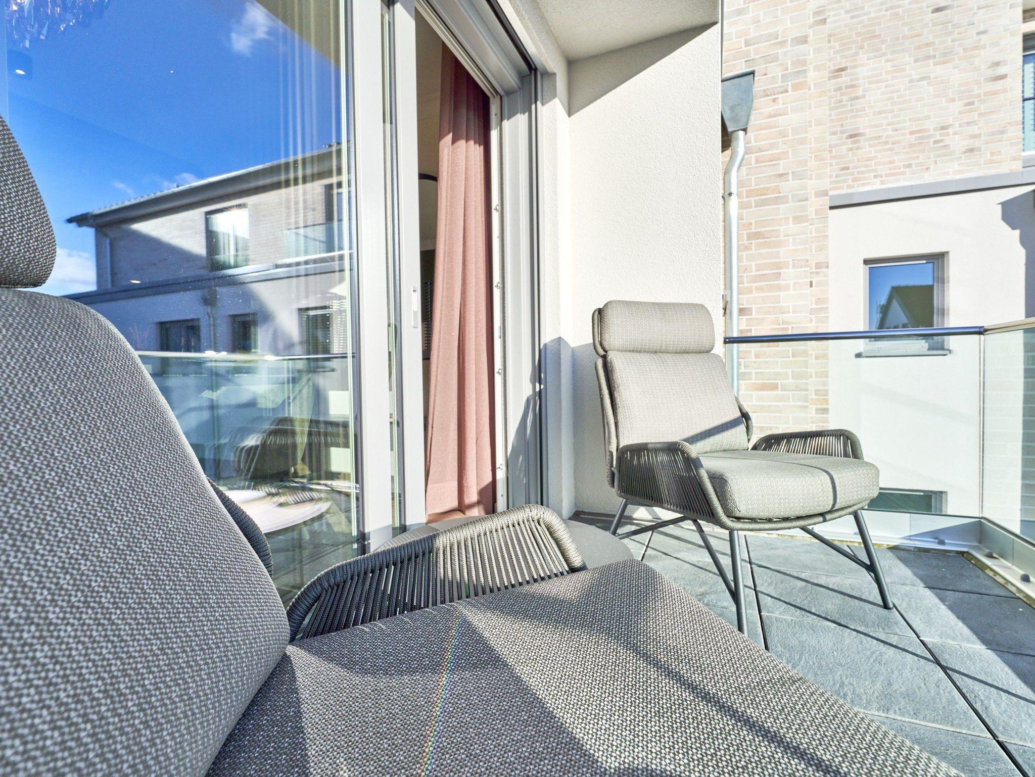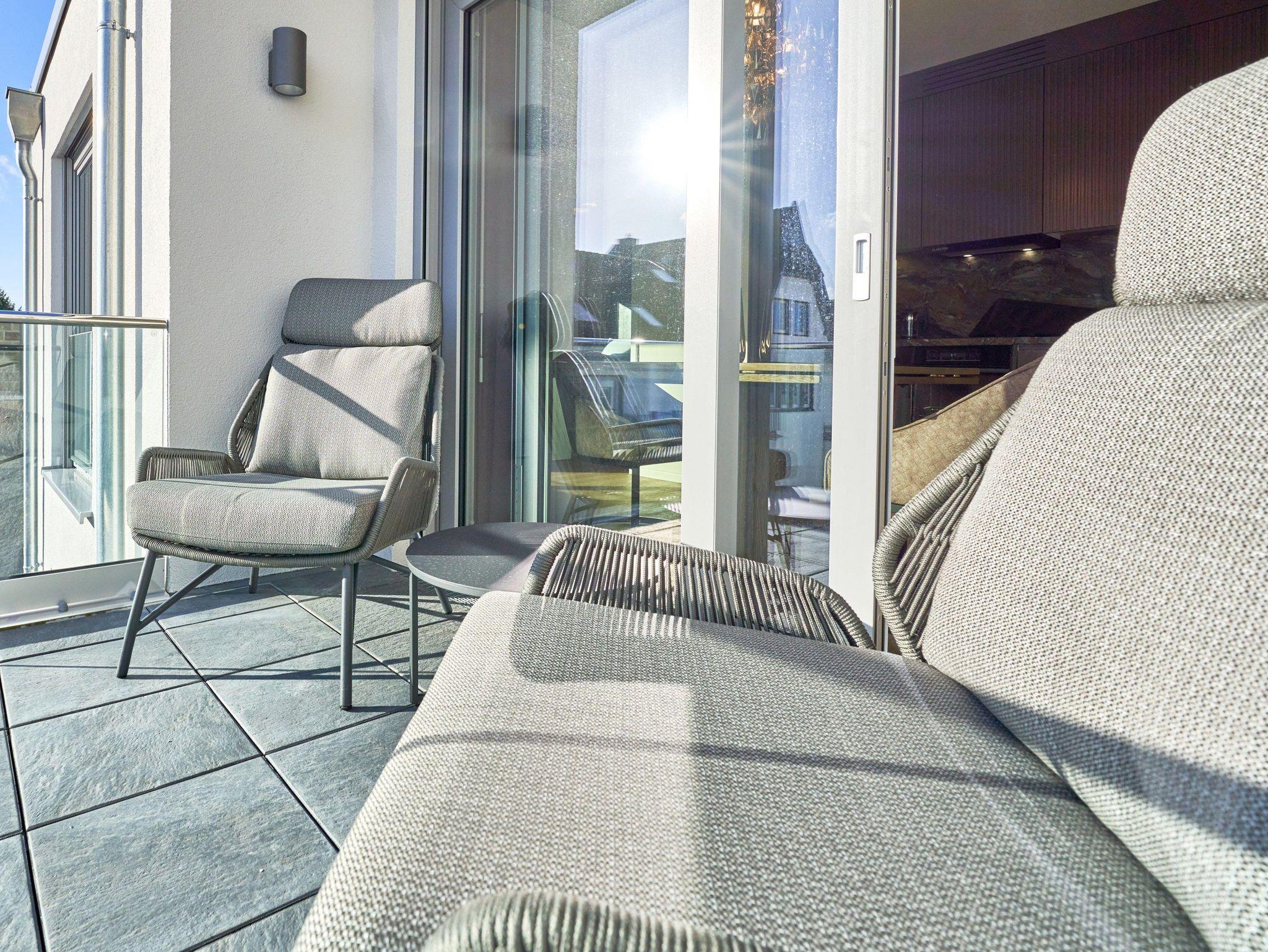 Auf dem Südbalkon stehen gemütliche Loungesessel mit Tisch zum Verweilen und Entspannen für Sie bereit.