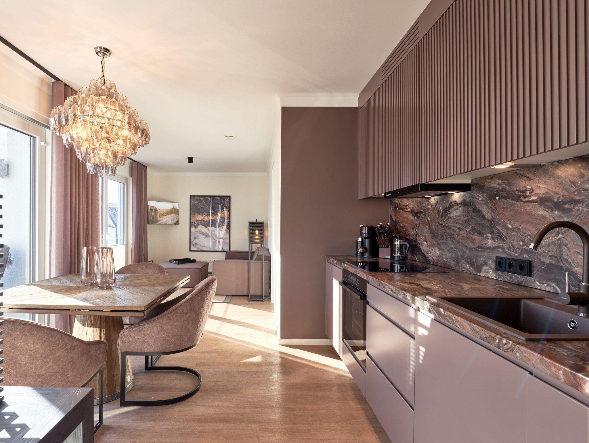 Diese Design-Ferienwohnung zeichnet sich durch eine moderne, stylische und exklusive Inneneinrichtung (Markenhersteller und individuelle Tischlereinbauten) aus, die bis ins Detail aufeinander abgestimmt ist. Die Küche ist in einem gemütlichen Farbton (London Clay von Farrow [&] Ball) gestaltet und mit hochwertigen Einbaugeräten ausgestattet . Neben einer Kaffeemaschine steht Ihnen auch eine Nespresso-Vertuo-Maschine zur Verfügung.[nbsp] Freuen Sie sich auf diese feine Wohlfühlwohnung. Im Wohnzimmer erwarten Sie ein Entertainment-Smart-TV in 43 und eine Soundbar. Das Soundbar-System kann per Bluetooth mit einem Smartphone / Tablet angesteuert werden. Somit können Sie auch Ihre eigene Musik abspielen oder Ihren Lieblingsradiosender hören. Weiterhin wartet auf Sie ein ansprechender Wohn-Essbereich. Das Schlafzimmer ist mit einem bequemen Doppelbett (1,80 x 2,00m), einem Einbauschrank, einem Schreibtisch, angefertigt in hochwertiger Tischlerarbeit, sowie einem TV (43) ausgestattet. Alle Räume lassen sich durch Außenrolläden verdunklen. Das Tageslicht-Duschbad ist mit einem Handtuchheizkörper und einer bodengleichen Dusche eingerichtet. Kosmetikspiegel sowie ein Haartrockner sind selbstverständlich vorhanden.