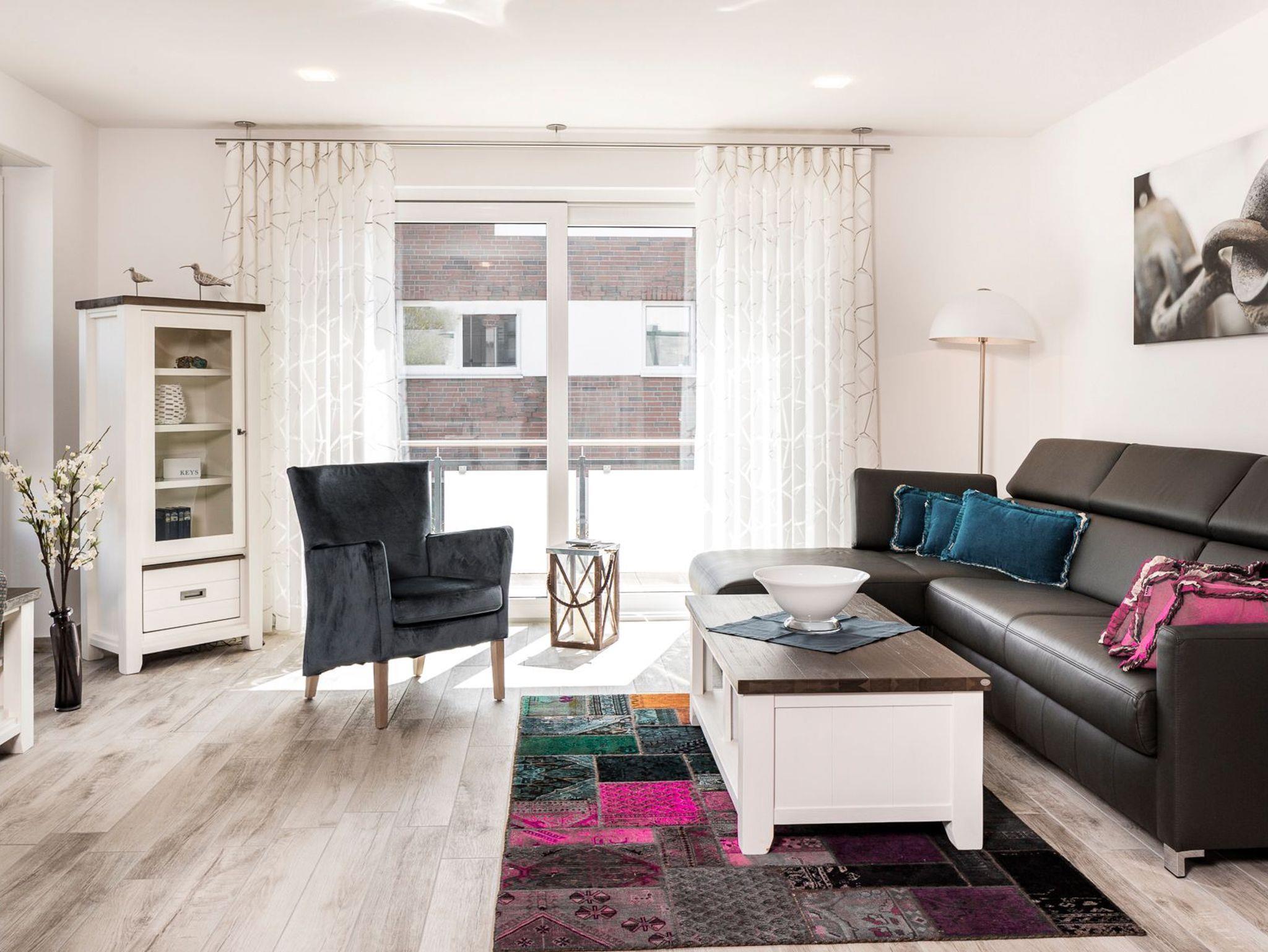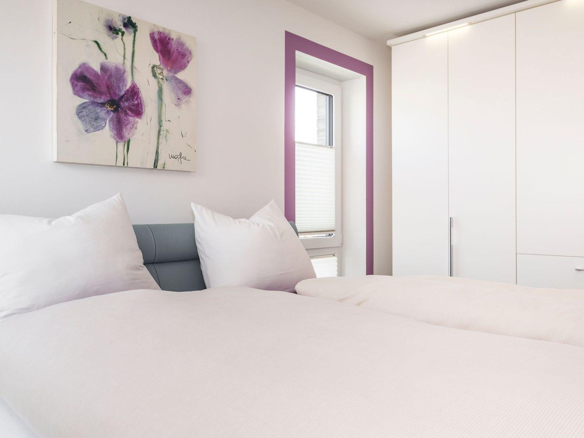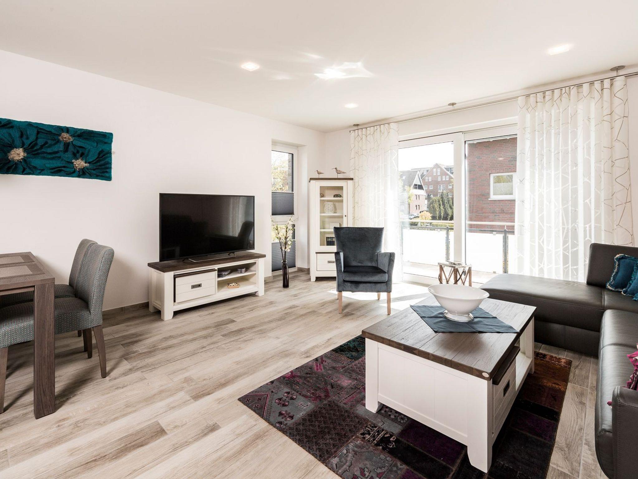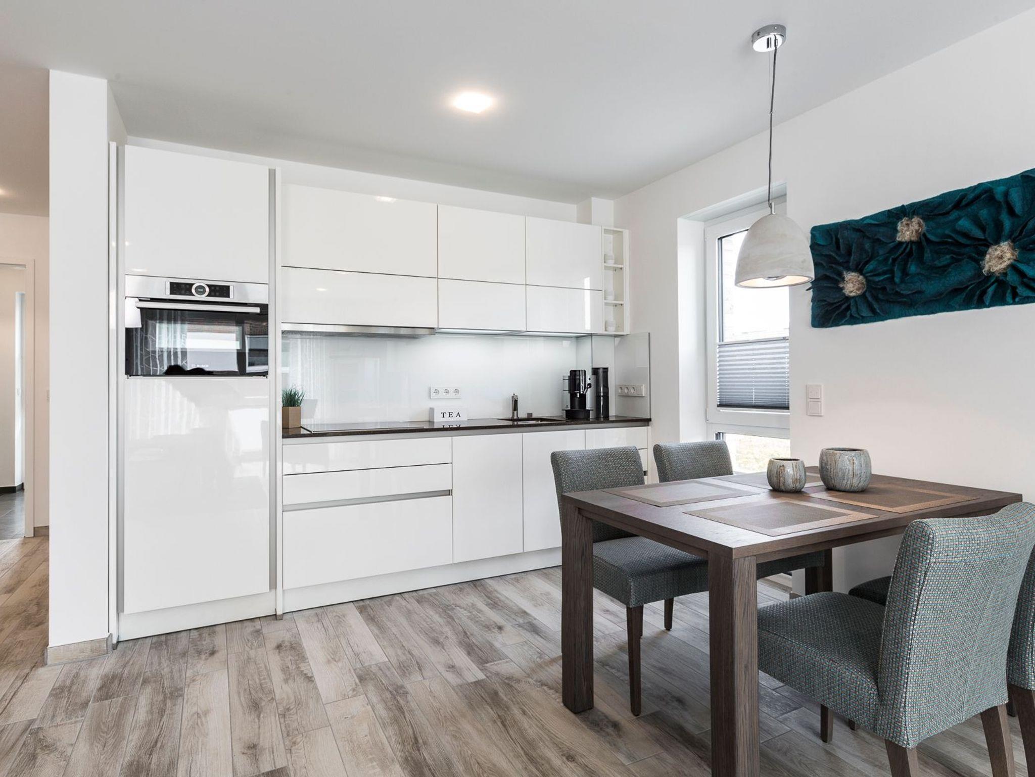 Die Ferienwohnung ist durchgehend mit einem Bodenbelag in angenehmer Holzoptik und Fußbodenheizung ausgestattet. Die sehr moderne und voll ausgestattete Küche lässt keine Wünsche offen. Neben einer Filterkaffeemaschine steht zusätzlich eine Nespresso-Kapselmaschine für Sie bereit. Der Wohnraum verfügt über einen Essbereich sowie einen gemütlichen Sitzbereich. Die Couch lässt sich mit nur wenigen Handgriffen in eine bequeme Schlafcouch (1,40 x 2,00 m) umfunktionieren. Kostenloses WLAN ist selbstverständlich. Im Schlafzimmer erwartet Sie ein geräumiger Schrank, ein komfortables Boxspringbett (1,80 x 2,00 m) sowie ein Flachbildfernseher. Das Tageslichtbad verfügt über eine bodengleiche Dusche mit Regendusche und eine Waschmaschine steht hier für Sie bereit. Der Balkon Richtung Süden ist mit einem hochwertigen Tisch und Stühlen ausgestattet.