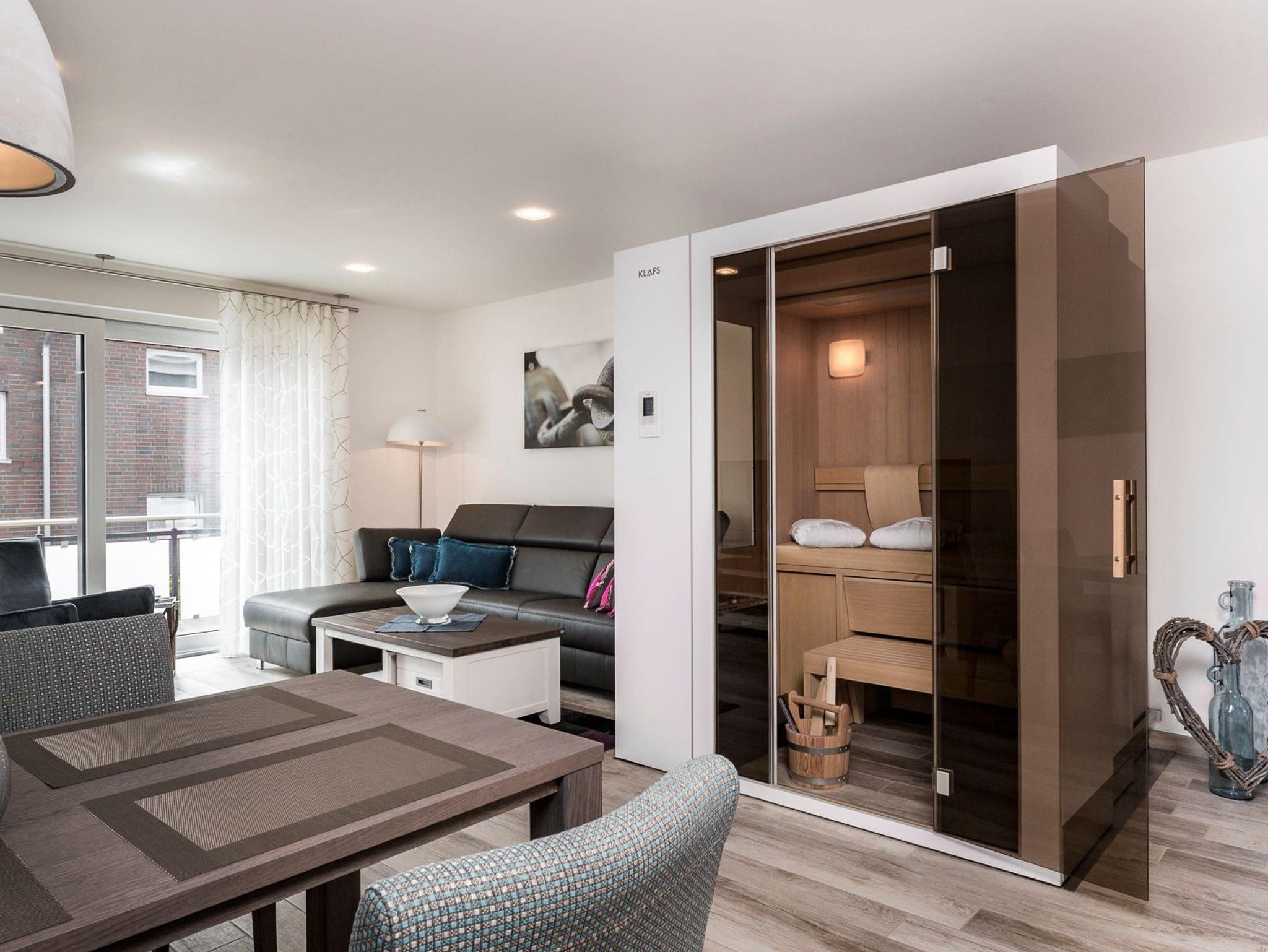 Diese Ferienwohnung lässt Sie rundum verwöhnen. Die Sauna im Wohnzimmer ist ein tolles Extra! Großer Südbalkon mit Tisch und Stühlen lässt Sie Ihren Urlaub genießen und lädt zum Träumen ein. In der Strandkorbsaison (15.05. ? 15.09.) finden Sie für die Zeit Ihres Aufenthaltes einen kostenlosen Strandkorb am Strand. Alle Fenster sind mit elektrischen Außenrollläden ausgestattet. Diese Ferienwohnung ist eine Nichtraucherwohnung. Für Raucher steht gerne der Balkon zur Verfügung ? vielen Dank für Ihr Verständnis. Haustiere sind ebenfalls nicht erlaubt. Sie eignet sich daher besonders gut für Allergiker.