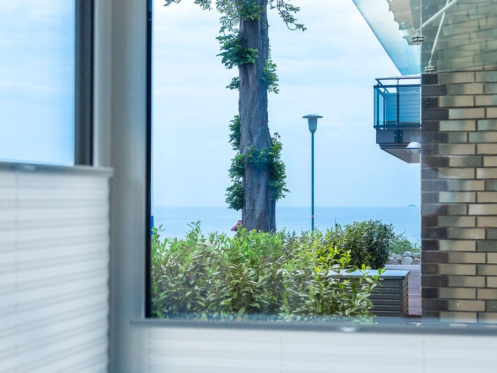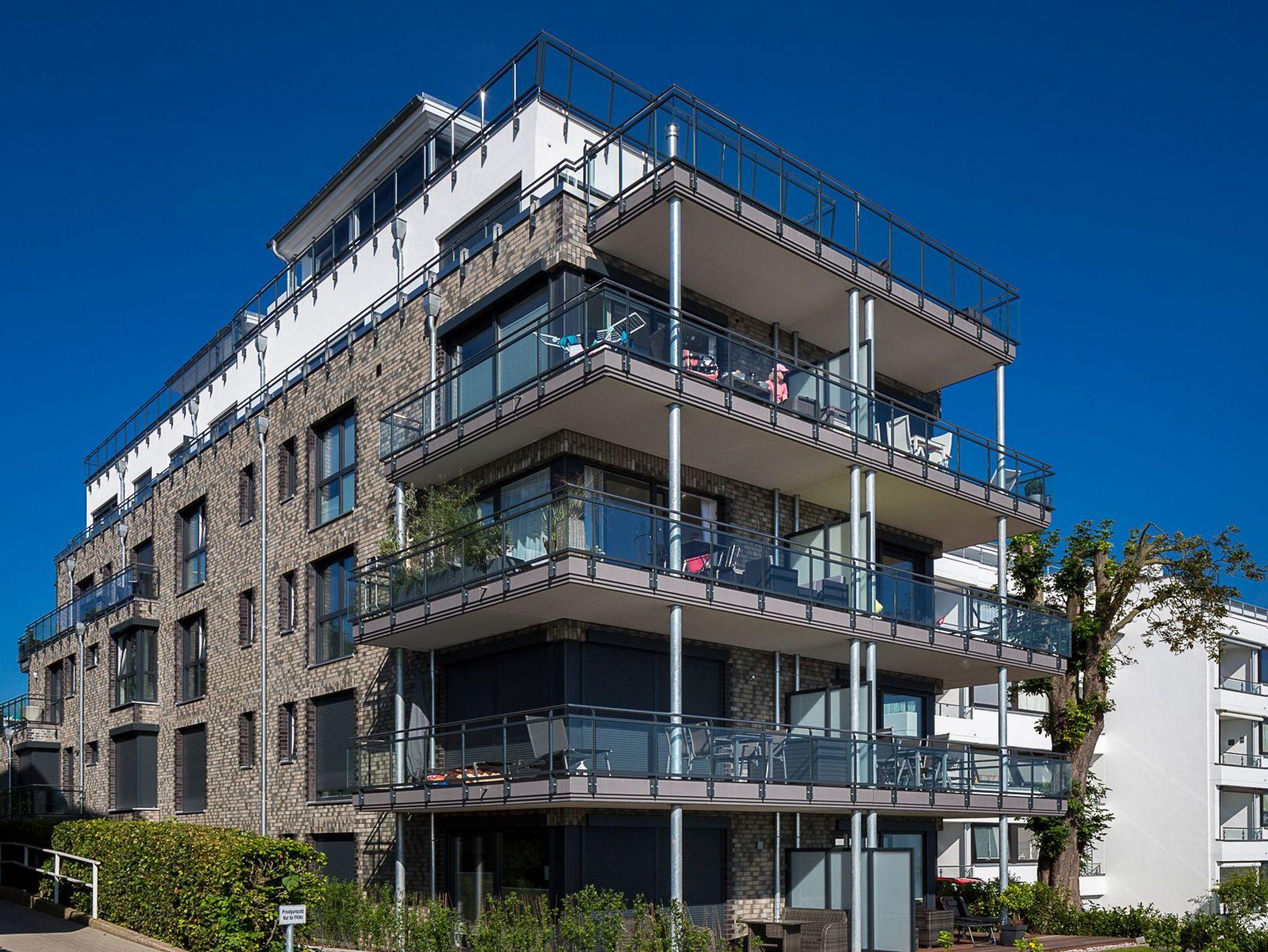 3-Zimmer-Ferienwohnung, ca. 66 m²,[nbsp] für bis zu vier Personen mit zwei Schlafzimmern, Duschbad, Balkon nach Südwesten sowie einer Terrasse nach Westen und Norden, seitlichem Meerblick, Kfz-Außenstellplatz, WLAN, Strandkorb gegenüber am Strand (saisonbedingt 15.05. - 15.09.).