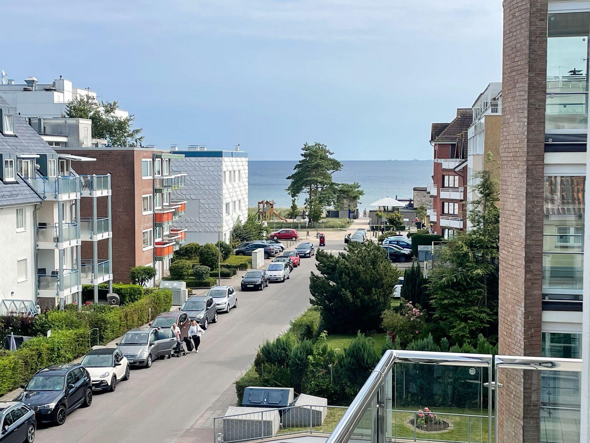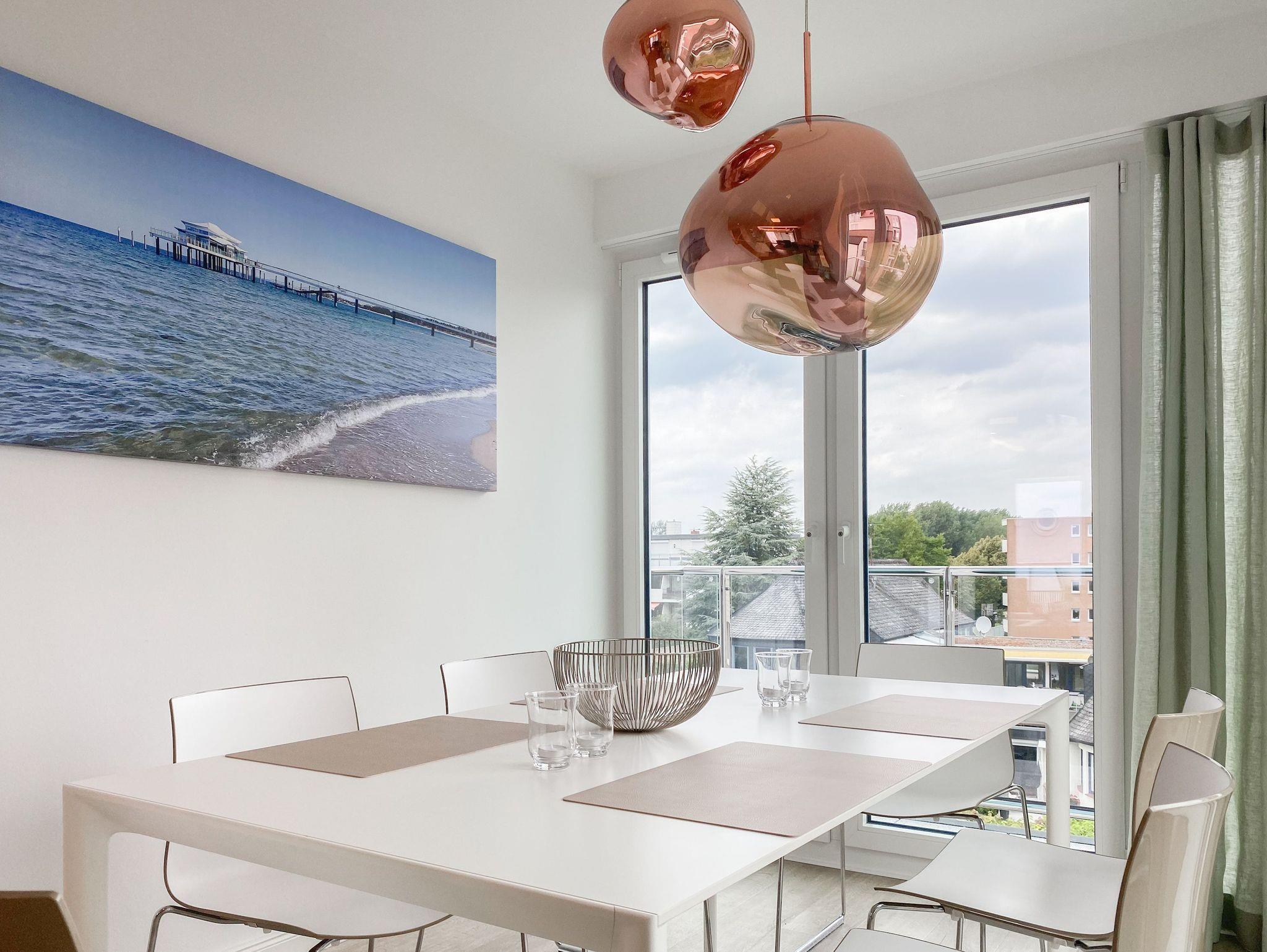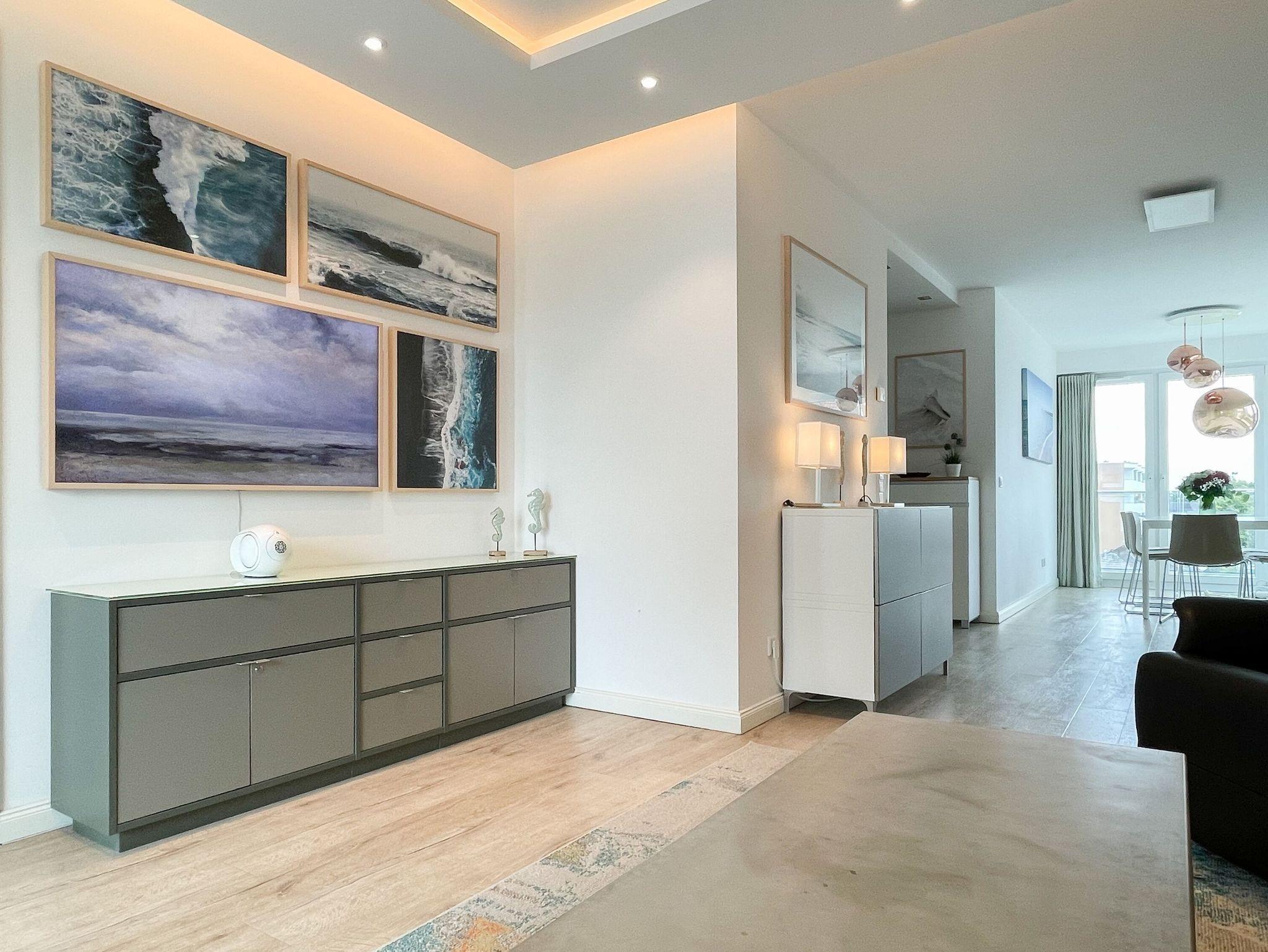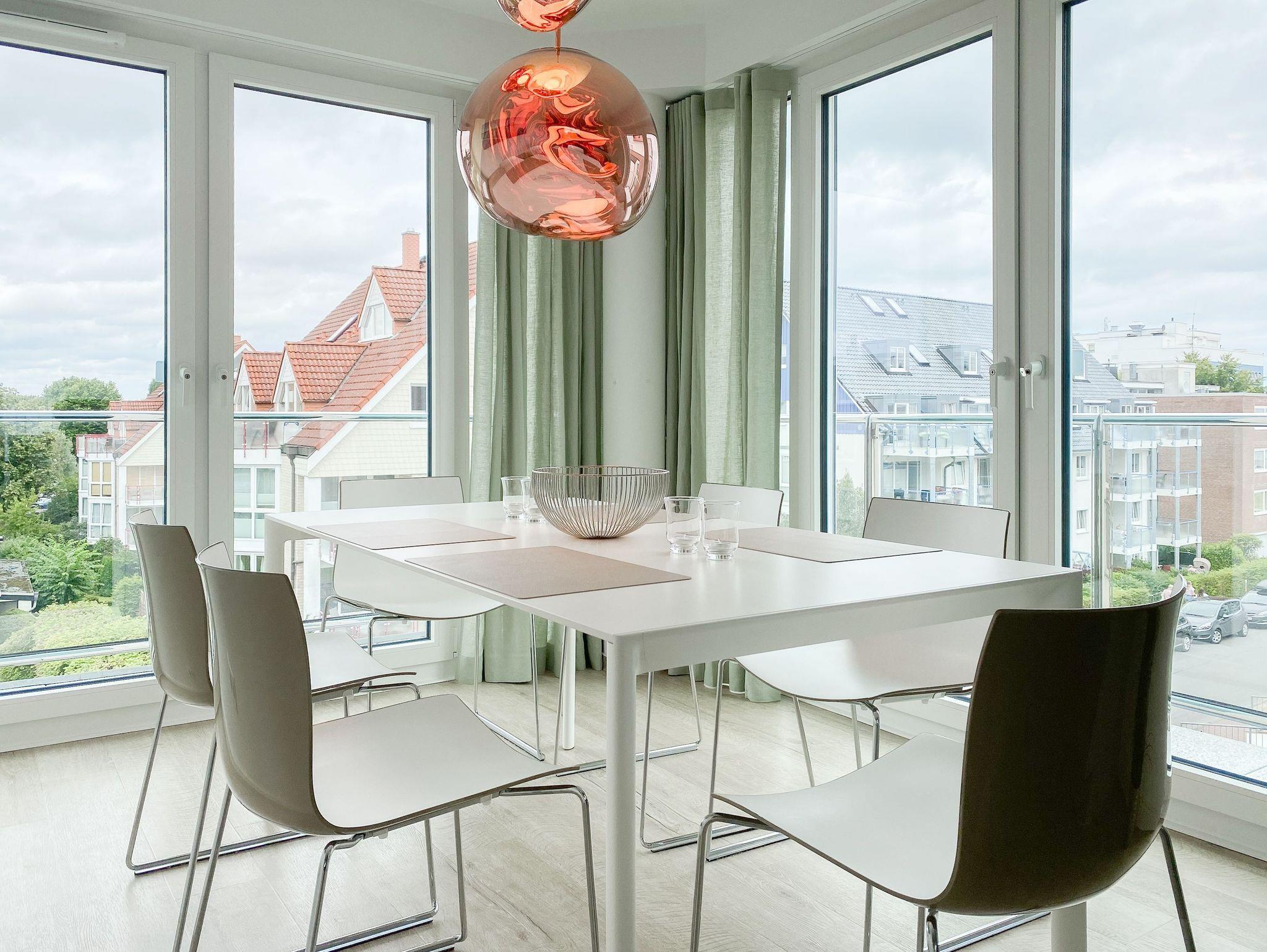 Es erwarten Sie luftige und lichtdurchflutete Räumlichkeiten mit bodentiefen Fensterflächen, äußerst hochwertig ausgestattet und geschmackvoll nach offenem Raumkonzept gestaltet.[nbsp] Panoramafenster umschließen den großzügigen Essbereich und bieten einen wunderschönen Blick bis auf die Ostsee. Auf dem vorgelagerten Minibalkon lassen sich beim Morgenkaffee die ersten Sonnenstrahlen mit Meerblick genießen. Gekocht wird in der anschließenden Wohnküche, die technisch bestens ausgestattet ist.[nbsp] Der Wohnbereich ist mit einem Sofa, 2 Einzelsesseln und einem Relaxsessel eingerichtet. TV (Frame), Bluetooth und Internetzugang über WLAN stehen zur Verfügung. Der großzügige Südbalkon verfügt über eine elektrische Markise, Gartenmöbel und 2 Sonnensessel. Es stehen 2 separate Schlafzimmer mit hochwertigen Boxspringdoppelbetten (180x200 und 160x200) zur Verfügung. Der größere Schlafraum verfügt über einen weiteren TV und ein modernes Bad ensuite mit Dusche und kleiner Badewanne. Ein zweites Duschbad befindet sich im Eingangsbereich gegenüber des kleineren Schlafzimmers, dessen Rundfenster mittels eines Rollos vollständig verdunkelt werden kann. Alle weiteren Fenster der Wohnung sind mit elektrischen Außenjalousien versehen.