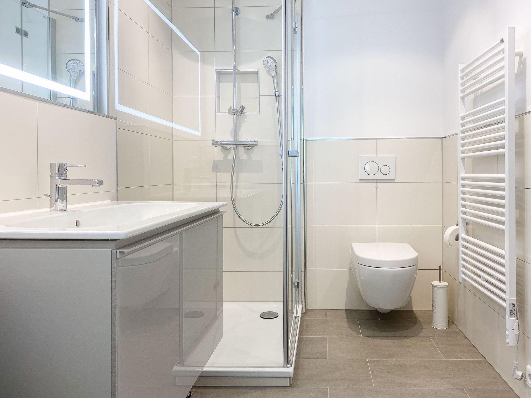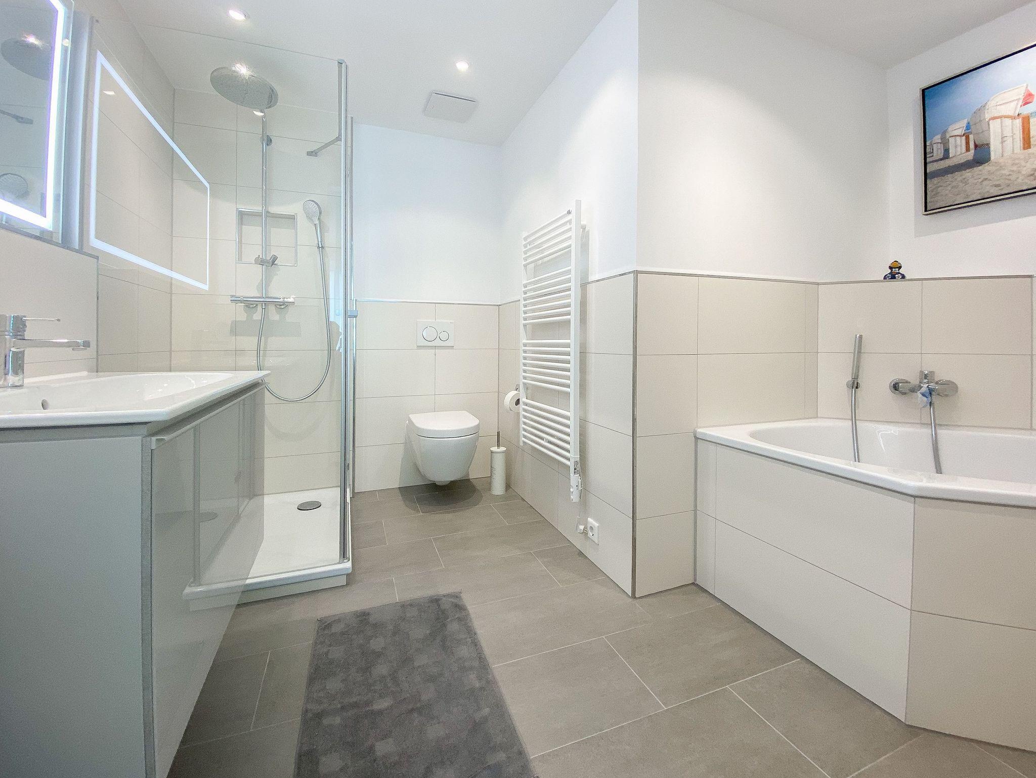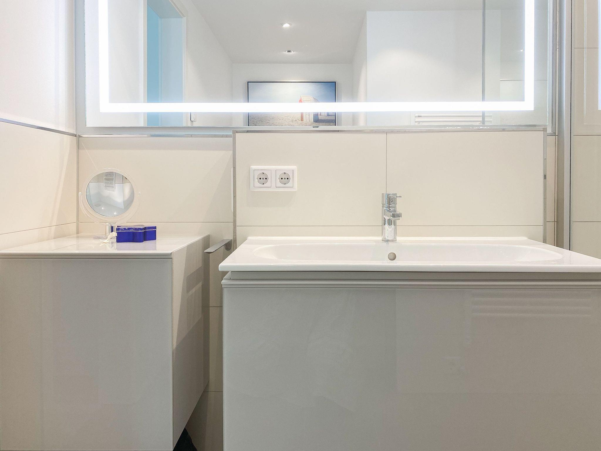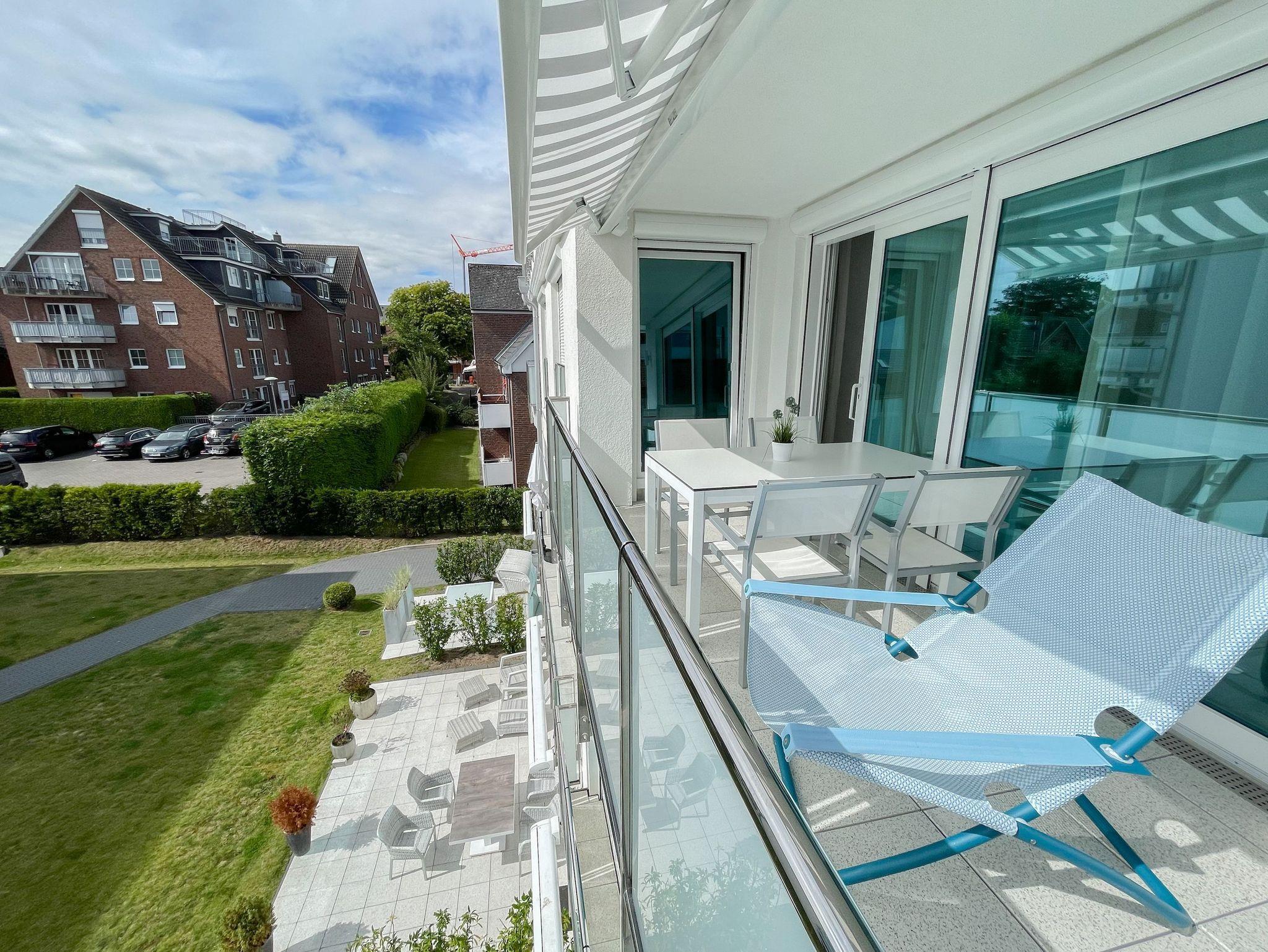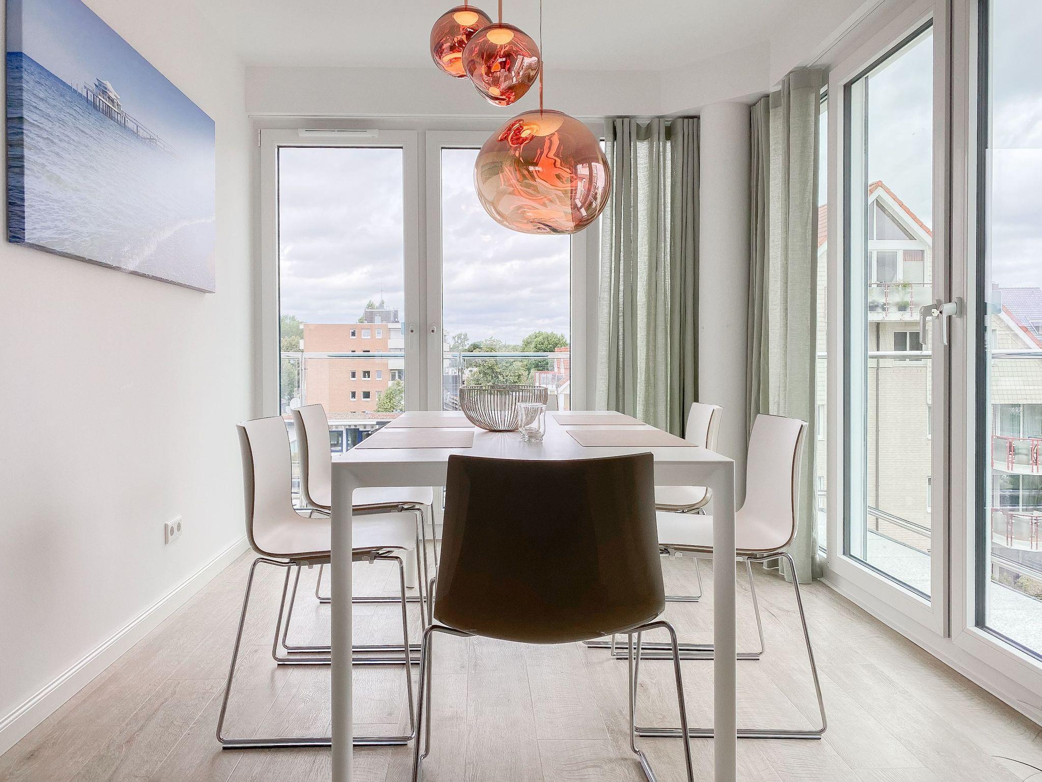 Es erwarten Sie luftige und lichtdurchflutete Räumlichkeiten mit bodentiefen Fensterflächen, äußerst hochwertig ausgestattet und geschmackvoll nach offenem Raumkonzept gestaltet.[nbsp] Panoramafenster umschließen den großzügigen Essbereich und bieten einen wunderschönen Blick bis auf die Ostsee. Auf dem vorgelagerten Minibalkon lassen sich beim Morgenkaffee die ersten Sonnenstrahlen mit Meerblick genießen. Gekocht wird in der anschließenden Wohnküche, die technisch bestens ausgestattet ist.[nbsp] Der Wohnbereich ist mit einem Sofa, 2 Einzelsesseln und einem Relaxsessel eingerichtet. TV (Frame), Bluetooth und Internetzugang über WLAN stehen zur Verfügung. Der großzügige Südbalkon verfügt über eine elektrische Markise, Gartenmöbel und 2 Sonnensessel. Es stehen 2 separate Schlafzimmer mit hochwertigen Boxspringdoppelbetten (180x200 und 160x200) zur Verfügung. Der größere Schlafraum verfügt über einen weiteren TV und ein modernes Bad ensuite mit Dusche und kleiner Badewanne. Ein zweites Duschbad befindet sich im Eingangsbereich gegenüber des kleineren Schlafzimmers, dessen Rundfenster mittels eines Rollos vollständig verdunkelt werden kann. Alle weiteren Fenster der Wohnung sind mit elektrischen Außenjalousien versehen.