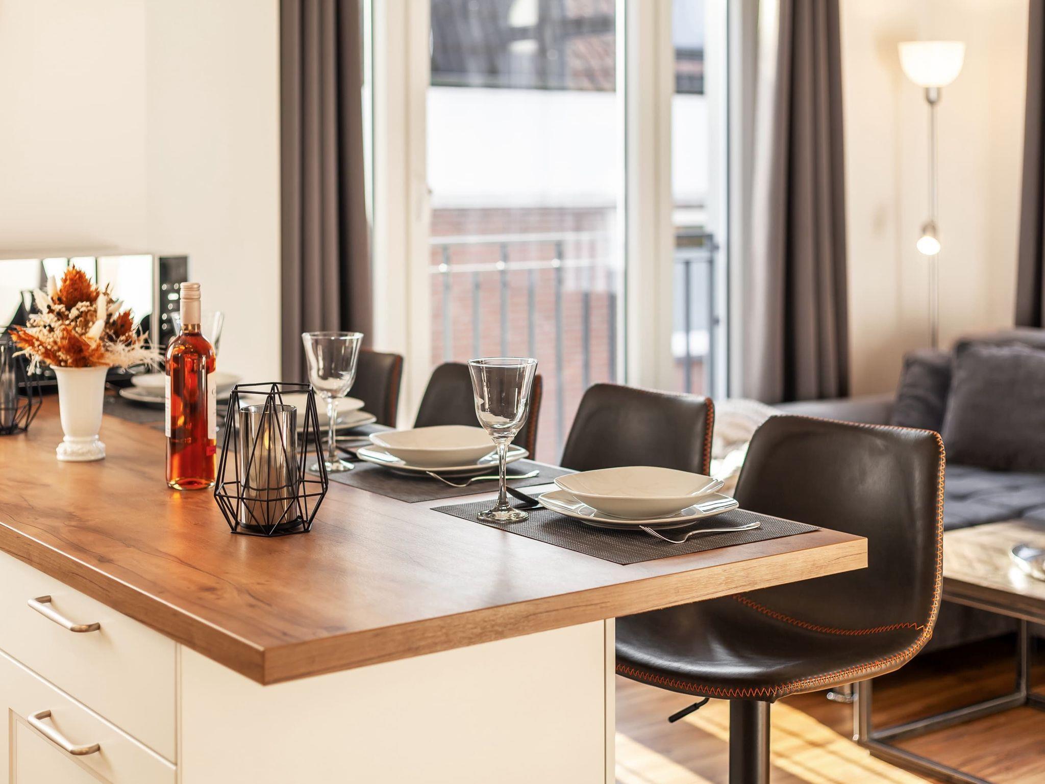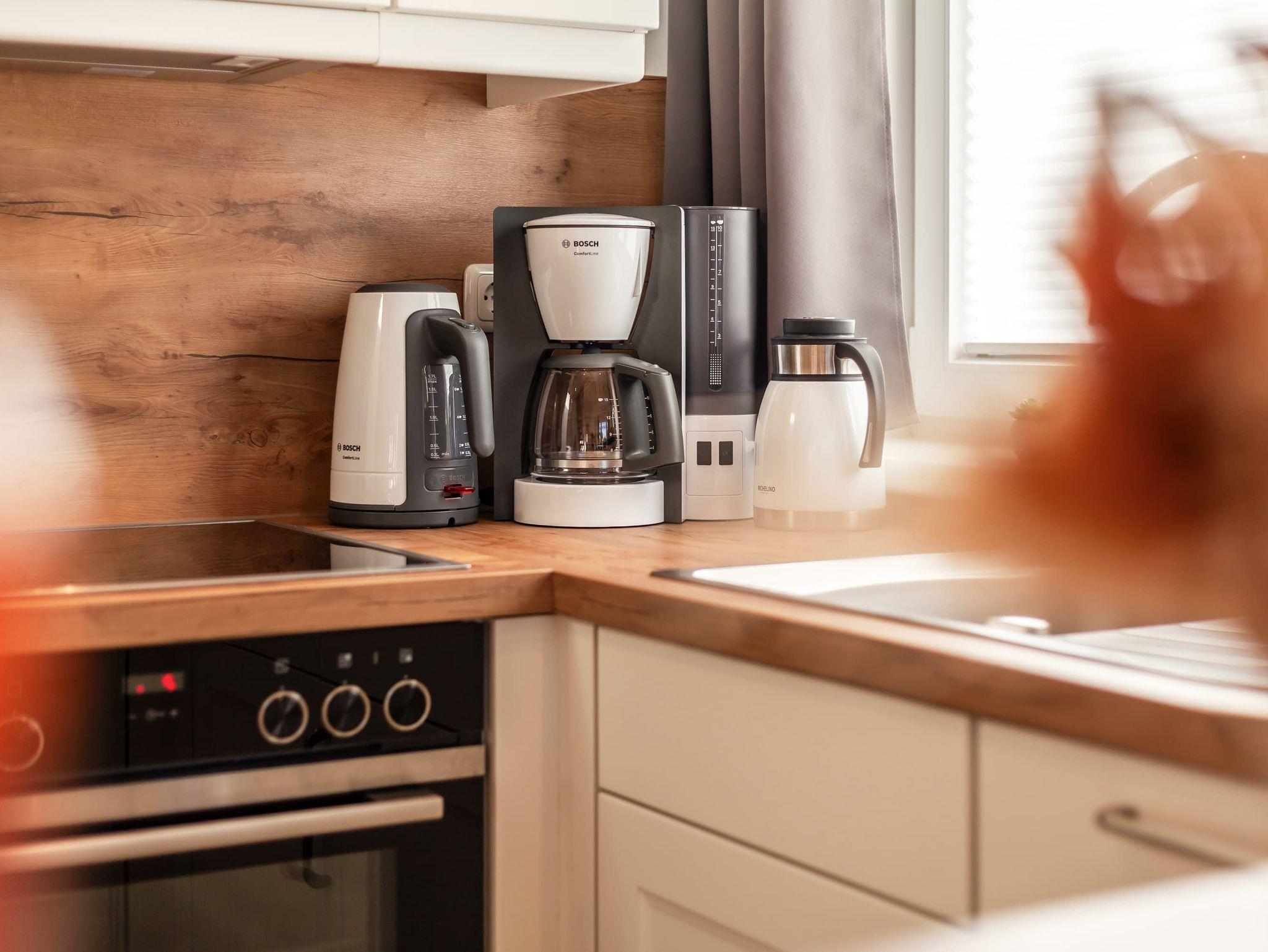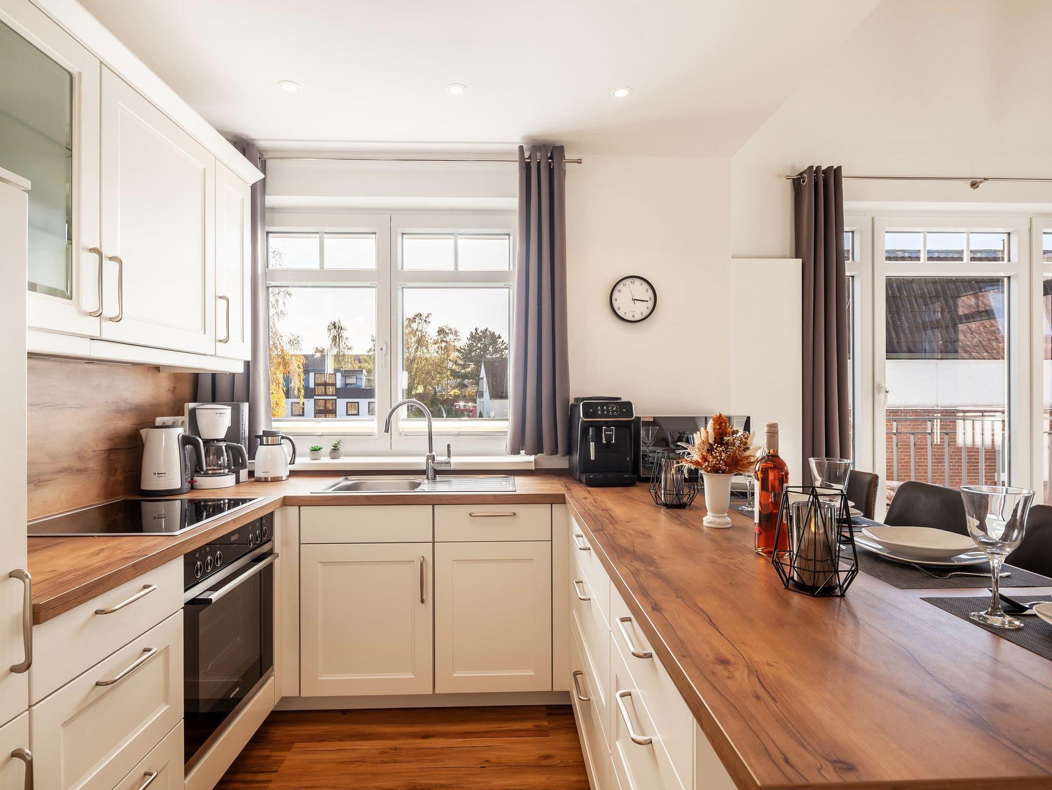 Jede Wohnung verfügt über eine vollständige Küchenausstattung, die keine Wünsche offen lässt. Die offene Gestaltung der Küche schafft eine einladende Atmosphäre und bietet alles, was Sie für einen angenehmen Aufenthalt benötigen, einschließlich Herd mit Backofen und großem Kühl- und Gefrierschrank, sowie Geschirrspülmaschine.