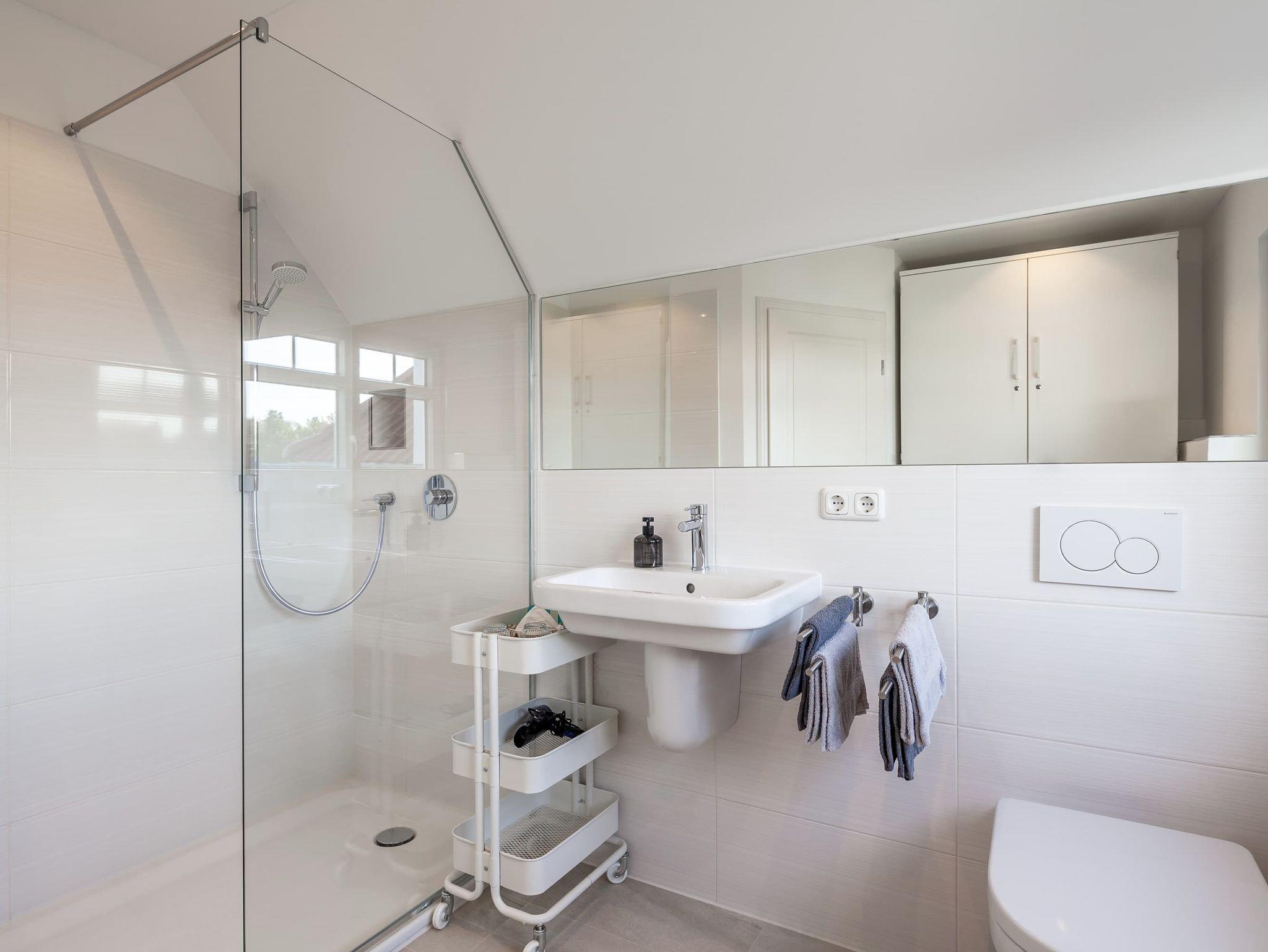 Im geräumigen Duschbad finden Sie nicht nur eine erfrischende Dusche, sondern auch einen großzügigen Schrank für Ihre persönlichen Gegenstände.