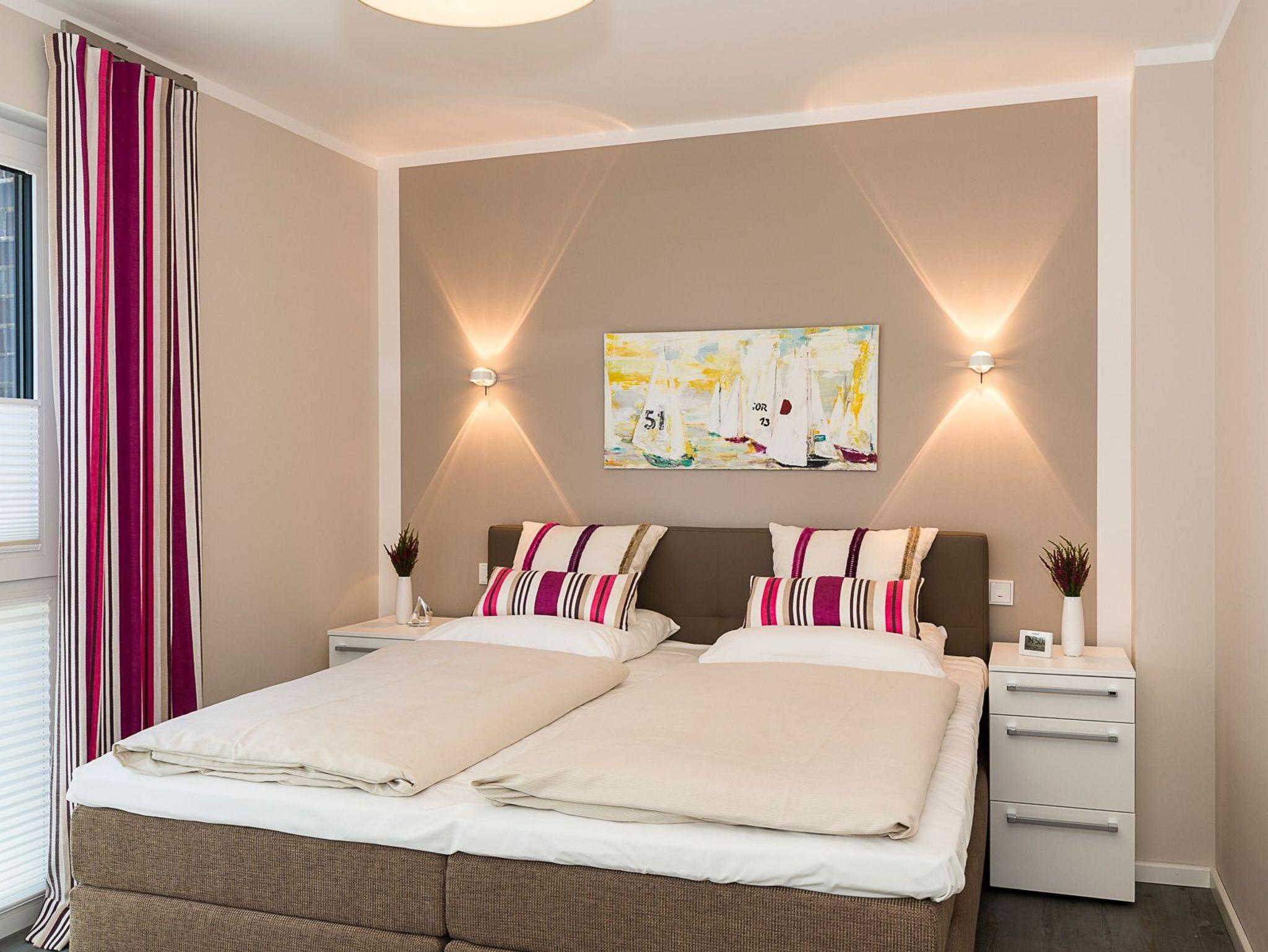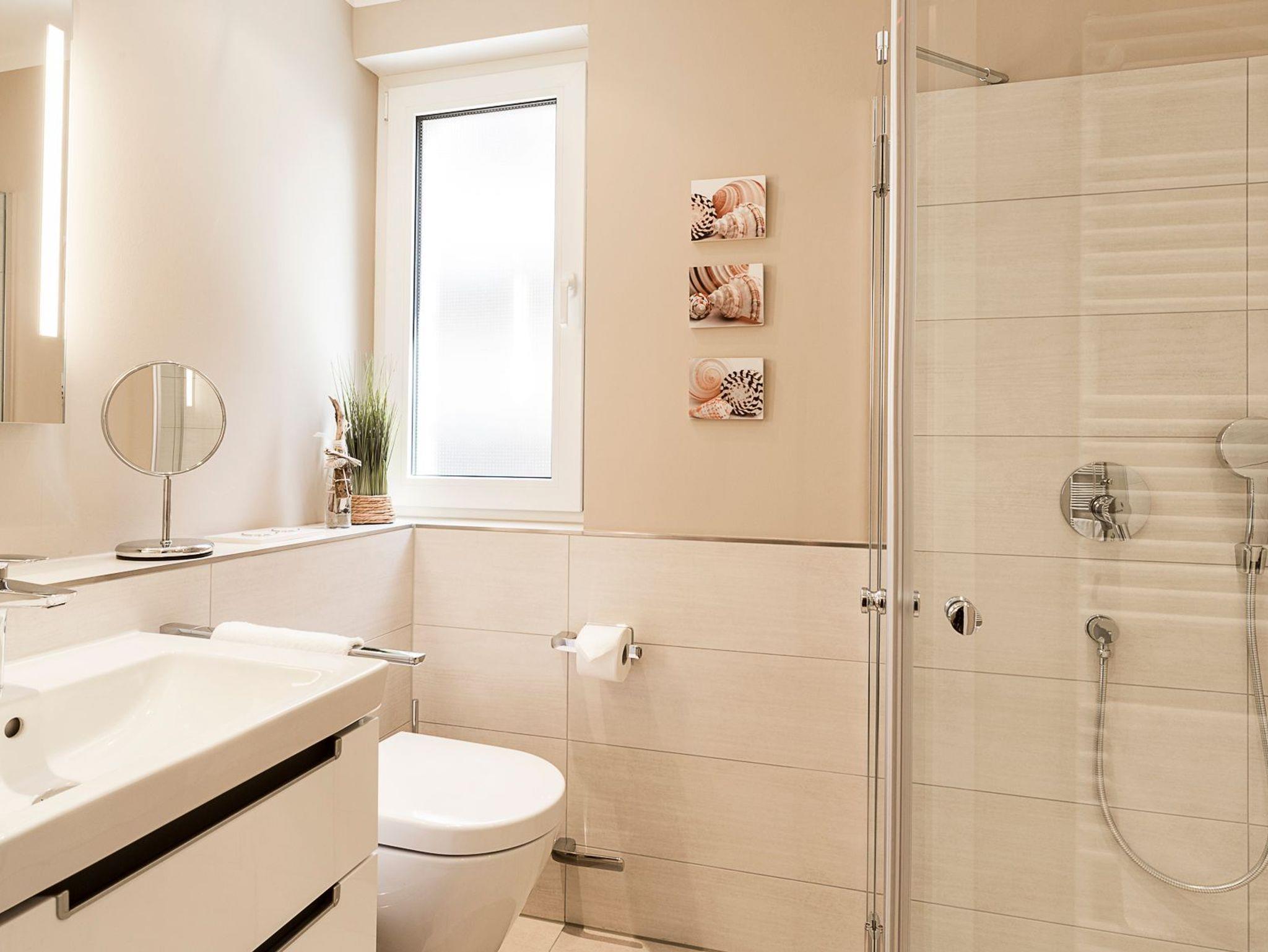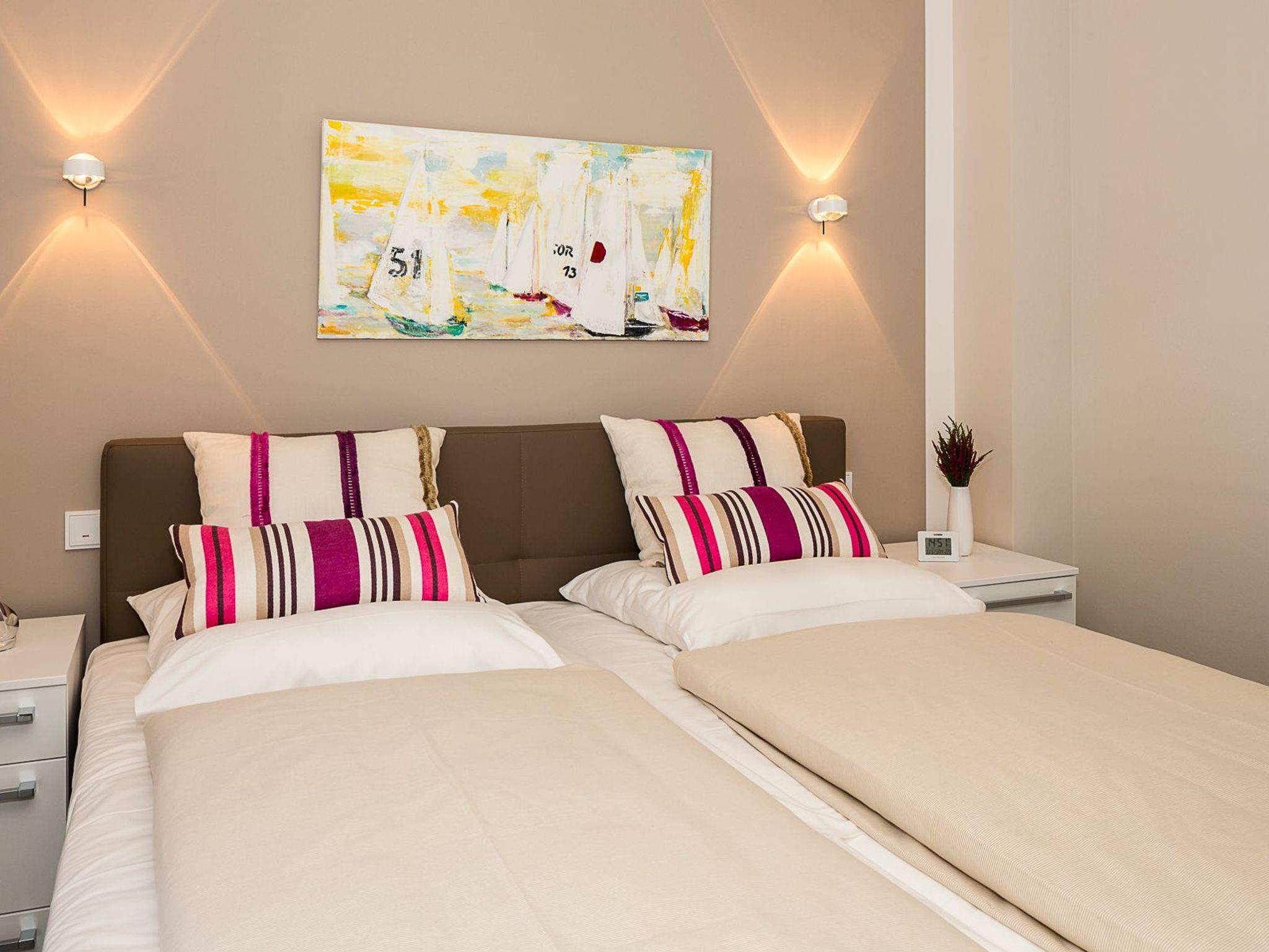 Die beiden Tageslichtbäder mit hellen, sandfarbenen Fliesen sind mit einer bodengleichen Dusche (Regenkopf- und Handbrause), jeweils einem Waschtisch mit Unterschrank von Villeroy und Boch, je zwei Handtuchhaltern, Handtuchheizkörper, Fußbodenheizung, Föhn, Kosmetikspiegel und jeweils einem Leuchtspiegel von Zierath sehr schön ausgestattet. Ein Radio von Busch Jaeger, verbunden mit eingebauten Deckenlautsprechern, sorgt für ein angenehmes Musikerlebnis. Die beiden Schlafzimmer verfügen über gemütliche Boxspringbetten (180 x 200m) der Marke Vito, einen Kleiderschrank mit Schiebetüren von Hülsta (Innenschubkästen, Einlegeböden, Kleiderstange), zwei Nachtkonsolen von Hülsta und einen Flachbildschirm von Panasonic. Ein Sicht- bzw. Lichtschutz ist ebenso vorhanden wie elektrische Rollläden. Der Balkon mit optimaler Süd-/Ostausrichtung begrüßt seine Gäste bereits zum Frühstück mit einem Platz an der Sonne. Ein großer Tisch mit vier Stühlen aus hochwertigem Aluminium lädt zu gemütlichen Stunden ein. Auf einer Rollenliege kann zusätzlich entspannt werden. In einer großen Stauraumkiste können nicht nur ihre Koffer platzsparend aufbewahrt werden, hier finden Sie auch Auflagen für Liege und Sessel. Ein großer, höhenverstellbarer Sonnenschirm rundet das Angebot auf dem Balkon ab. Wir freuen uns auf Sie!