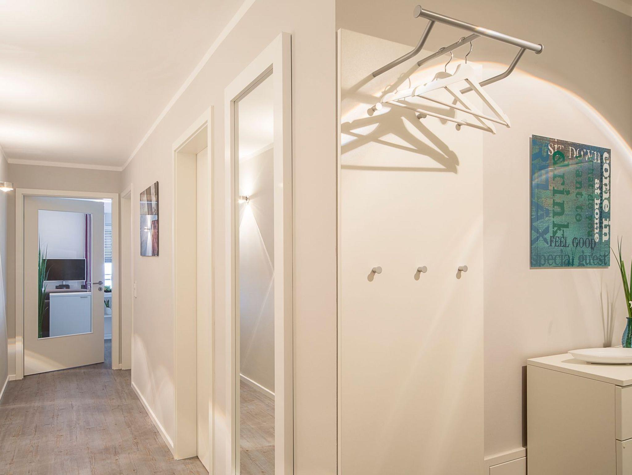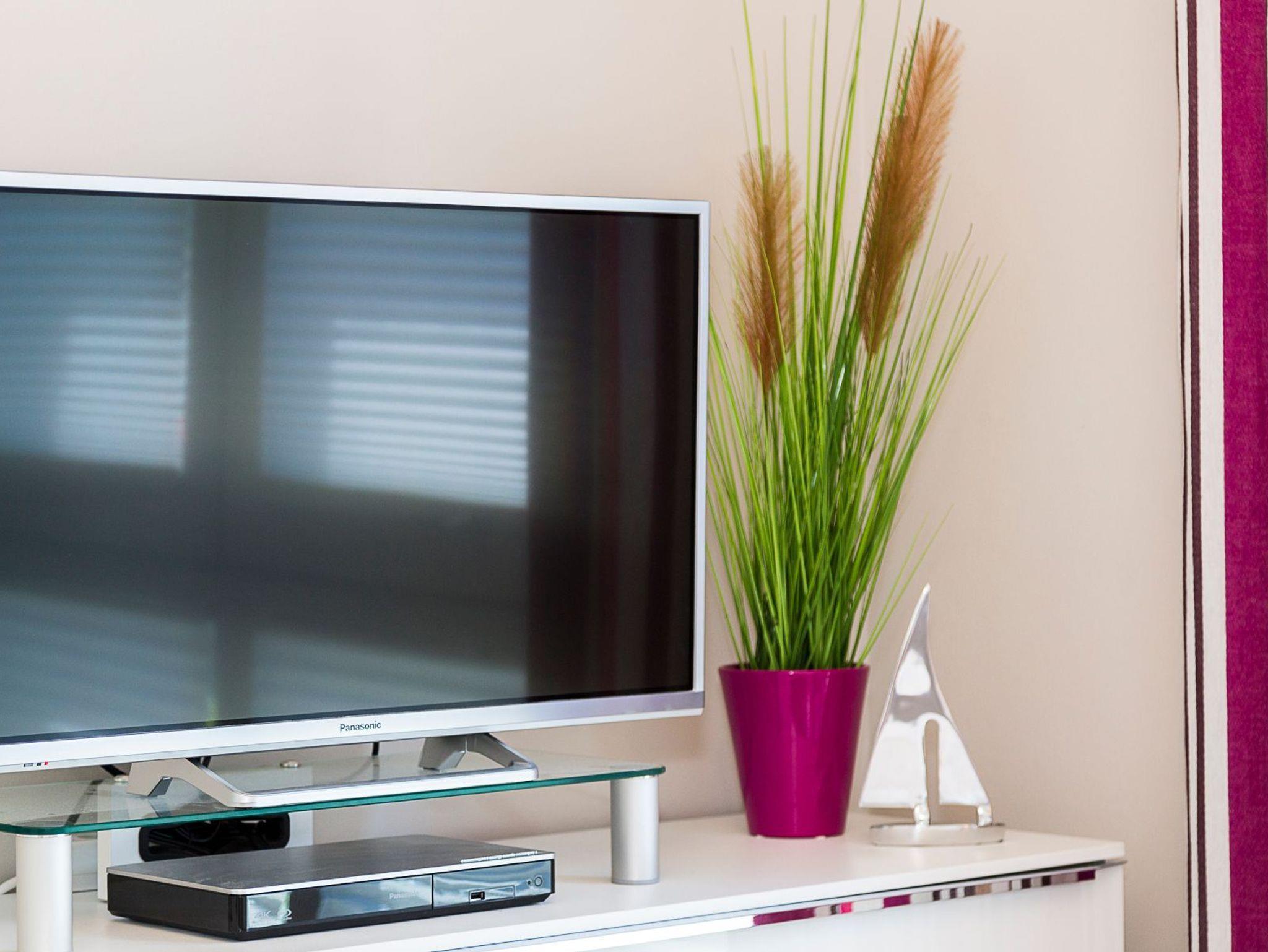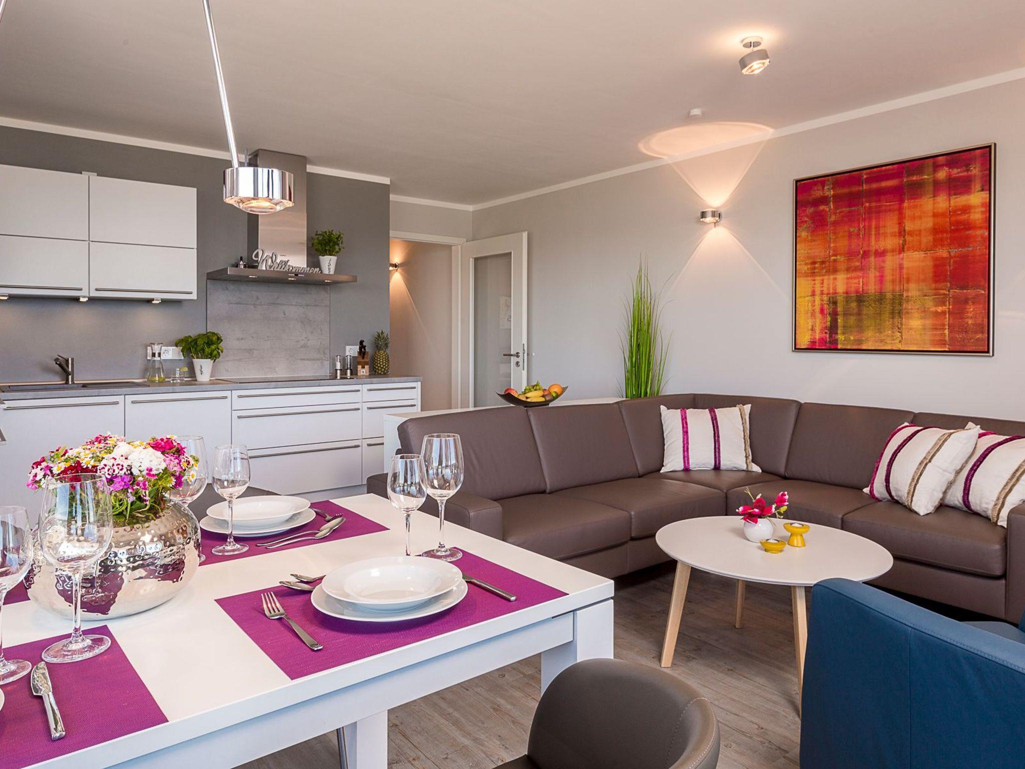 Bereits beim Betreten der Wohnung können Sie vom Flur aus auf die Ostsee schauen. Auch alle weiteren Räume bieten Ihnen einen herrlichen Blick auf die Ostsee. Der Eingangsbereich ist mit einer bequemen Garderobenbank und panel sowie einem großen Schuhschrank ausgestattet. Der Wohnbereich ist großzügig eingerichtet und durch die bodentiefen Fenster mit Südausrichtung sehr hell. Ein Sicht- bzw. Lichtschutz ist ebenso vorhanden wie elektrische Rollläden. Von der sehr komfortablen Leder-Eckcouch[nbsp] können Sie den herrlichen Meerblick genießen. Ein großer Tisch mit vier bequemen Schalenstühlen bietet ausreichend Platz. Ein drehbarer Flachbildschirm mit Heimkino-Anlage inklusive Blu-ray-Player lässt keine Wünsche offen. Per Smartphone direkt via Bluetooth verbinden und eigene Musik hören oder auch nur das Radio einschalten. Der Wohnbereich wird geschickt durch ein Sideboard von der Küche optisch getrennt. Die offene Designerküche mit weißer Mattlackoberfläche ist mit hochwertigen Elektrogeräten von Siemens ausgestattet: Induktionsherd, Backofen mit integrierter Mikrowelle, Geschirrspüler, Kühl-/Gefrierkombination, Wasserkocher, Toaster, Filter- und Kapsel-Kaffeemaschine.