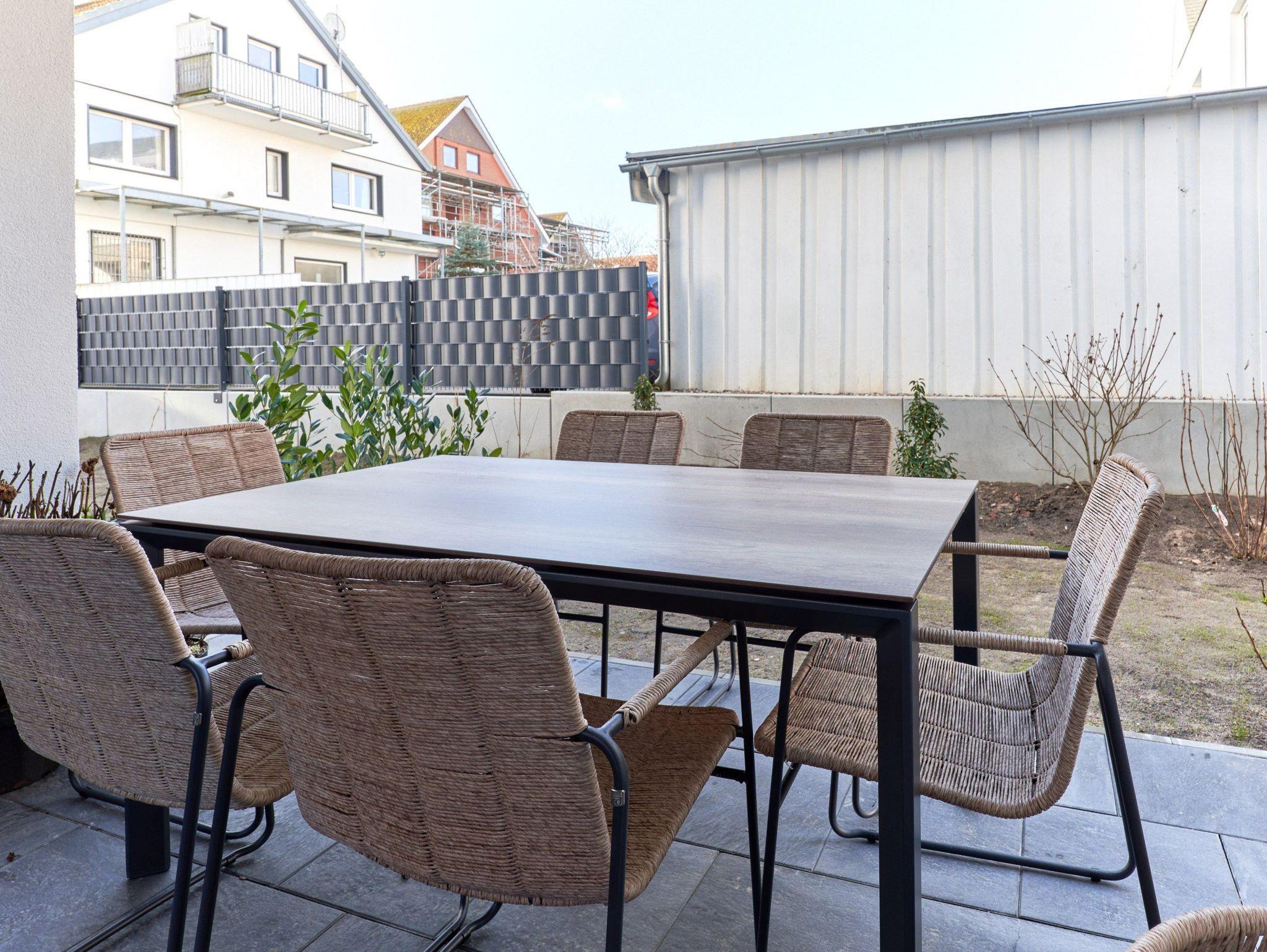 Auf der schönen West-Terrasse können Sie Ihre Mahlzeiten am Gartentisch mit Stühlen einnehmen.