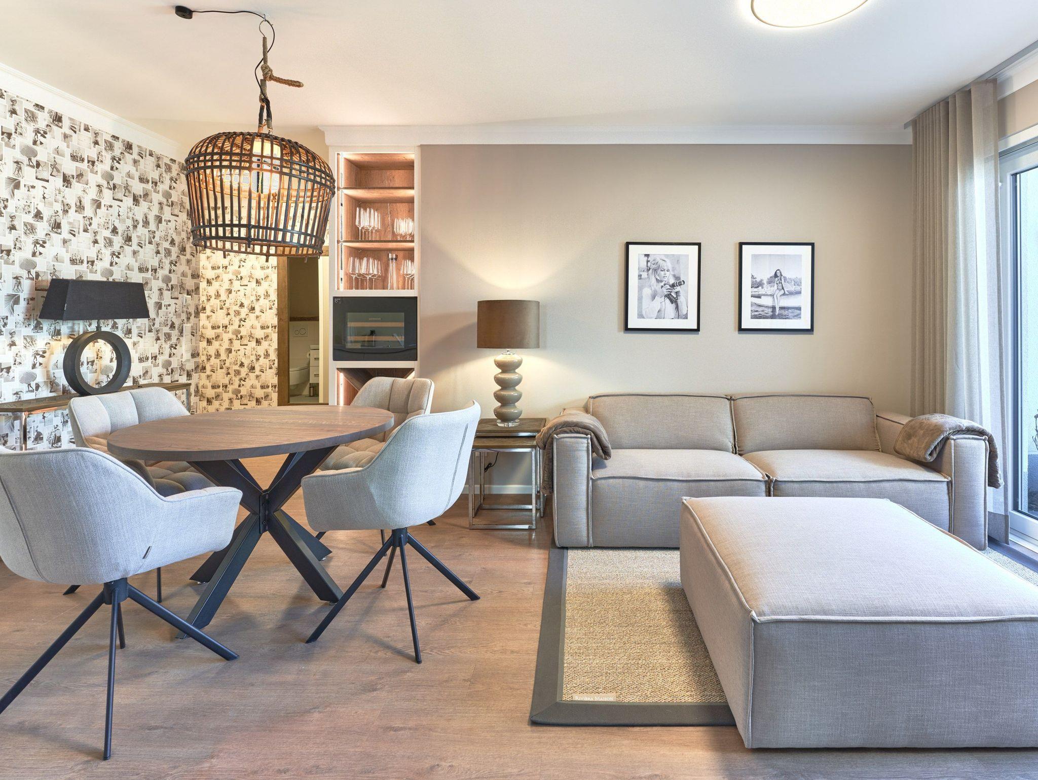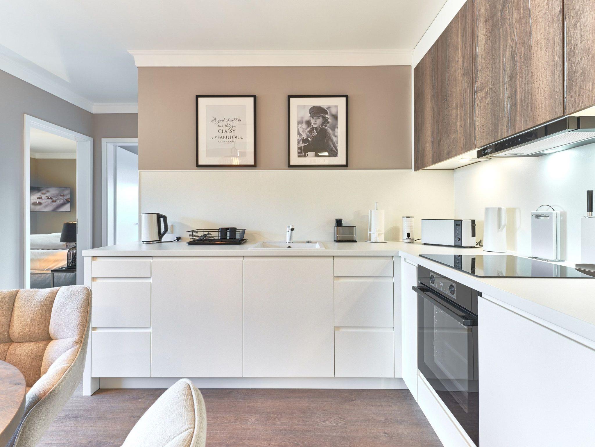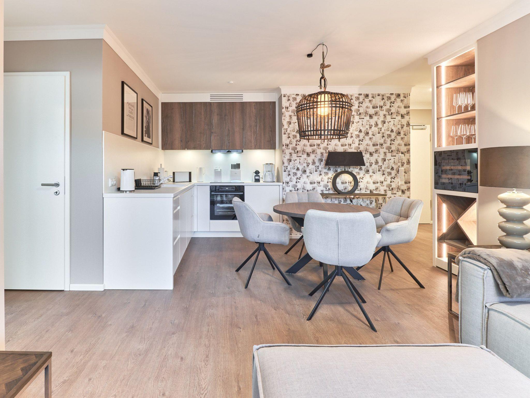 Diese ca. 68m² große Design-Ferienwohnung zeichnet sich durch eine moderne, stylische und exklusive Inneneinrichtung (Markenhersteller und individuelle Tischlereinbauten) aus, die bis ins Detail aufeinander abgestimmt ist. Die Küche in heller Optik ist mit hochwertigen Einbaugeräten ausgestattet. Neben einer Kaffeemaschine steht Ihnen auch eine Nespresso-Maschine zur Verfügung. Außerdem finden Sie Spülmaschine, Induktionsherd, Weinkühlschrank und vieles mehr. Freuen Sie sich auf diese feine Wohlfühlwohnung. Das Wohnzimmer ist mit[nbsp] Entertainment-Smart-TV in 55 Zoll und einem Soundbar-System ausgestattet. Dieses kann per Bluetooth mit einem Smartphone / Tablet angesteuert werden. Im Wohn-Essbereich können Sie die Seele baumeln lassen.
