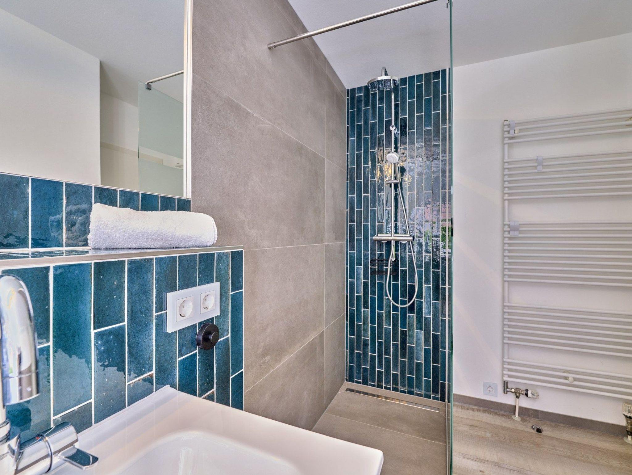 (1,80 x 2,00m) und einem Flachbildfernseher ausgestattet. Von hier erreichen Sie die zweite Terrasse. Ein weiteres Schlafzimmer ist mit einem Doppelbett (1,40 x 2,00m) sowie mit einem TV eingerichtet. Diese Ferienwohnung hat ein großes, tageslichtreiches Bad mit ebenerdiger Dusche und ein separates WC. Im Keller des Hauses befinden sich Waschmaschine und Wäschetrockner, beide sind über einen Münzzähler zu bedienen.