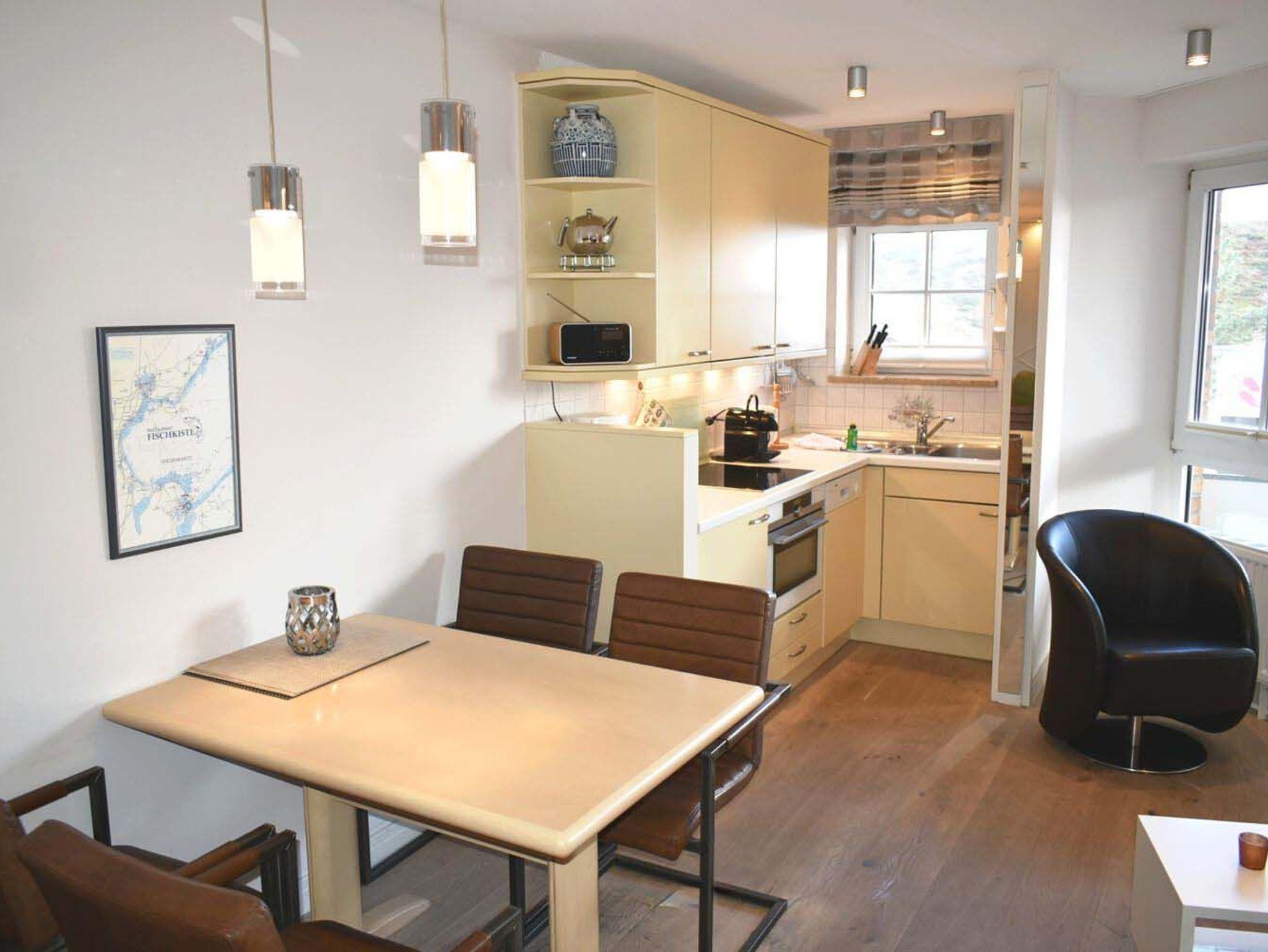 Balkon: 4 Fleecedecken, 4 Stühle mit Auflagen, Bodenwindlicht, Meerblick zwischen den Häusern, Nord- Ostlage, Tisch, Tischwindlicht, überdacht