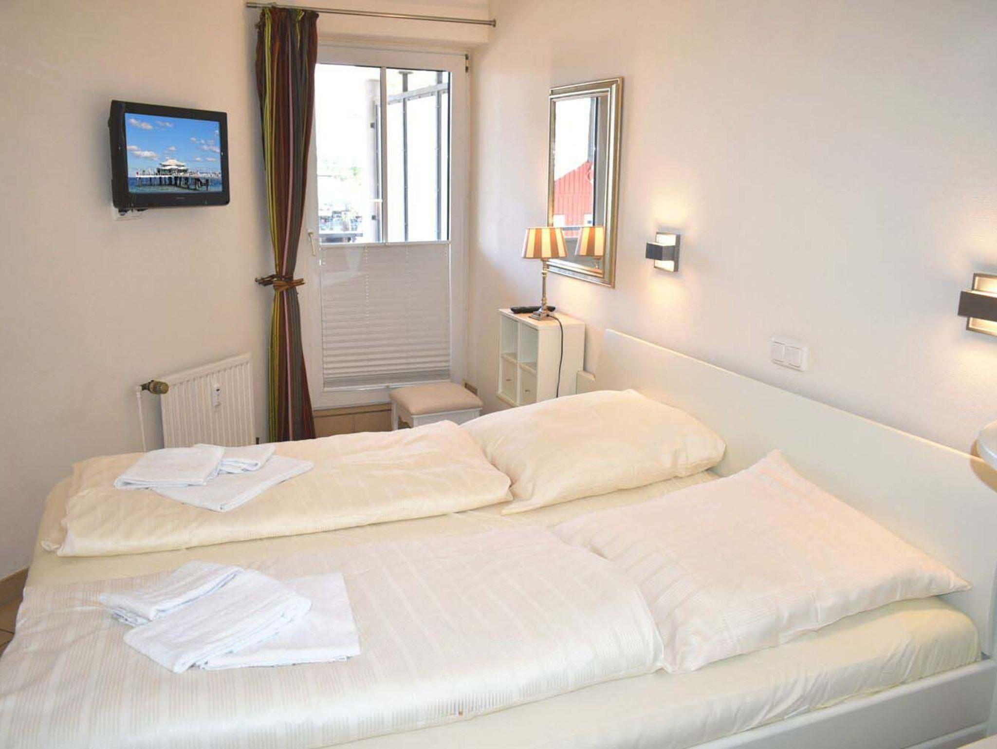 Schlafzimmer 1: Doppelbett 2,00 x 1,80 m Lattenrost Kopf- und Fussteil verstellbar, Flachbildschirm, Garderobe, Kabel-TV, Kleiderschrank, kleiner Meerblick zwischen den Häusern aus dem Bett, Kofferablage, Korbsessel, Nachttisch, Radiowecker, Regal, Spiegel