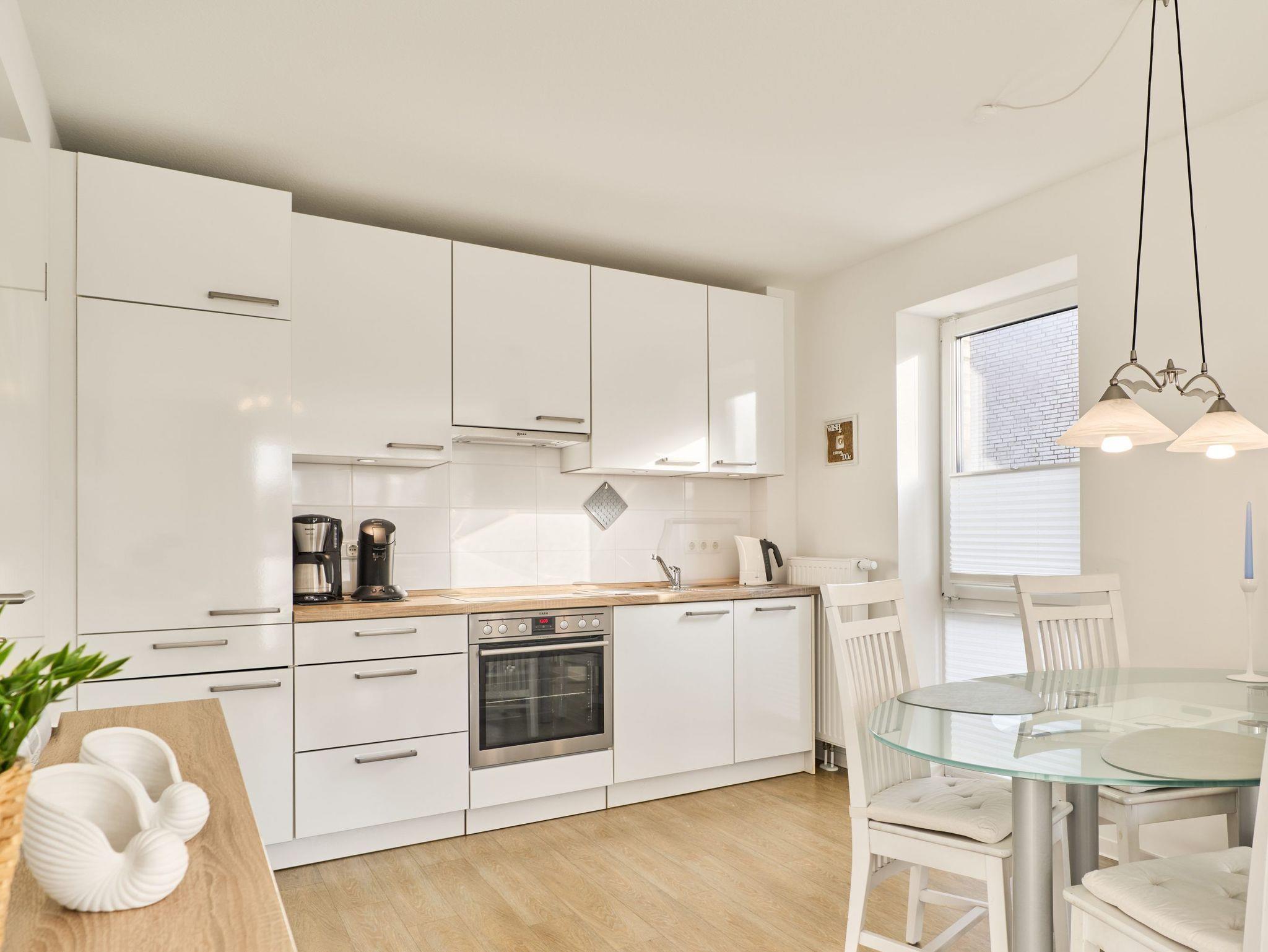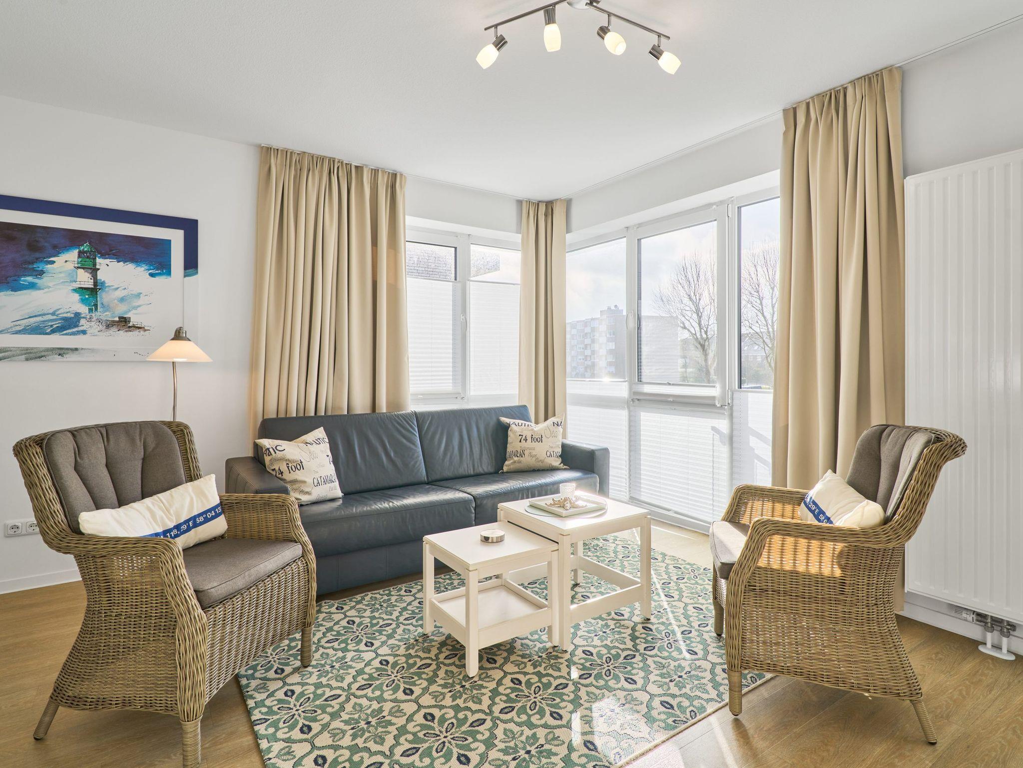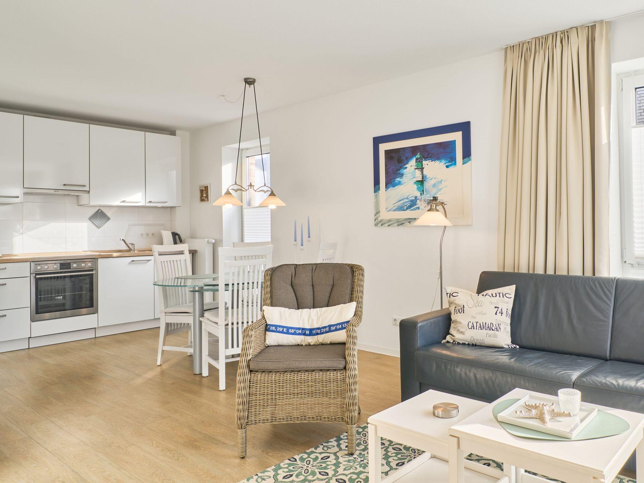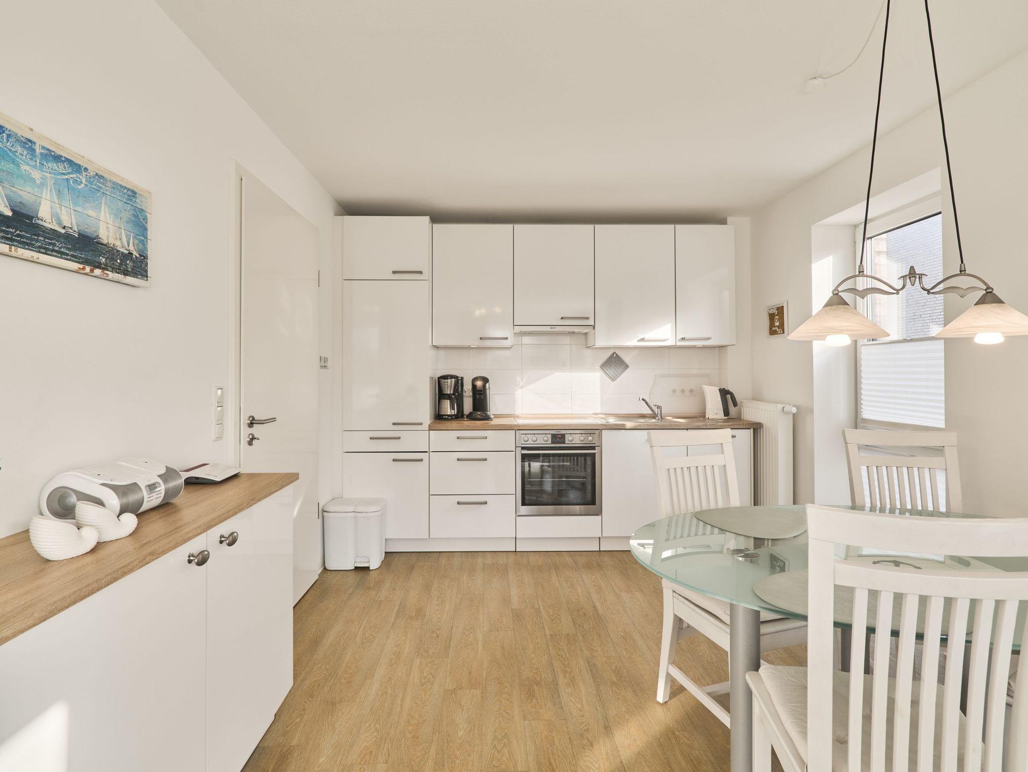 Die Ferienwohnung verzaubert mit ihrem, im maritimen Stil gehaltenen, Wohnzimmer und ist mit hochwertigen Möbeln eingerichtet. Es erwarten Sie dort eine bequeme Couch, 2 Sessel und ein Sat-Flachbildschirmfernseher. Die moderne, offene Küche ist voll ausgestattet und perfekt in den Wohnraum integriert. Ihnen stehen eine Filterkaffeemaschine, eine Senseo-Kaffeepadmaschine, ein Wasserkocher sowie ein Toaster zur Verfügung. Zudem verfügt die Küche über ein Cerankochfeld, einen Backofen und einen Geschirrspüler. Der Essbereich bietet ausreichend Platz für ein ausgiebiges Frühstück oder einen gemütlichen Spieleabend. Das helle Schlafzimmer ist mit einem Doppelbett (1,80 × 2,00 m) und einem großen Kleiderschrank ausgestattet und hat direkten Zugang zu dem Balkon.